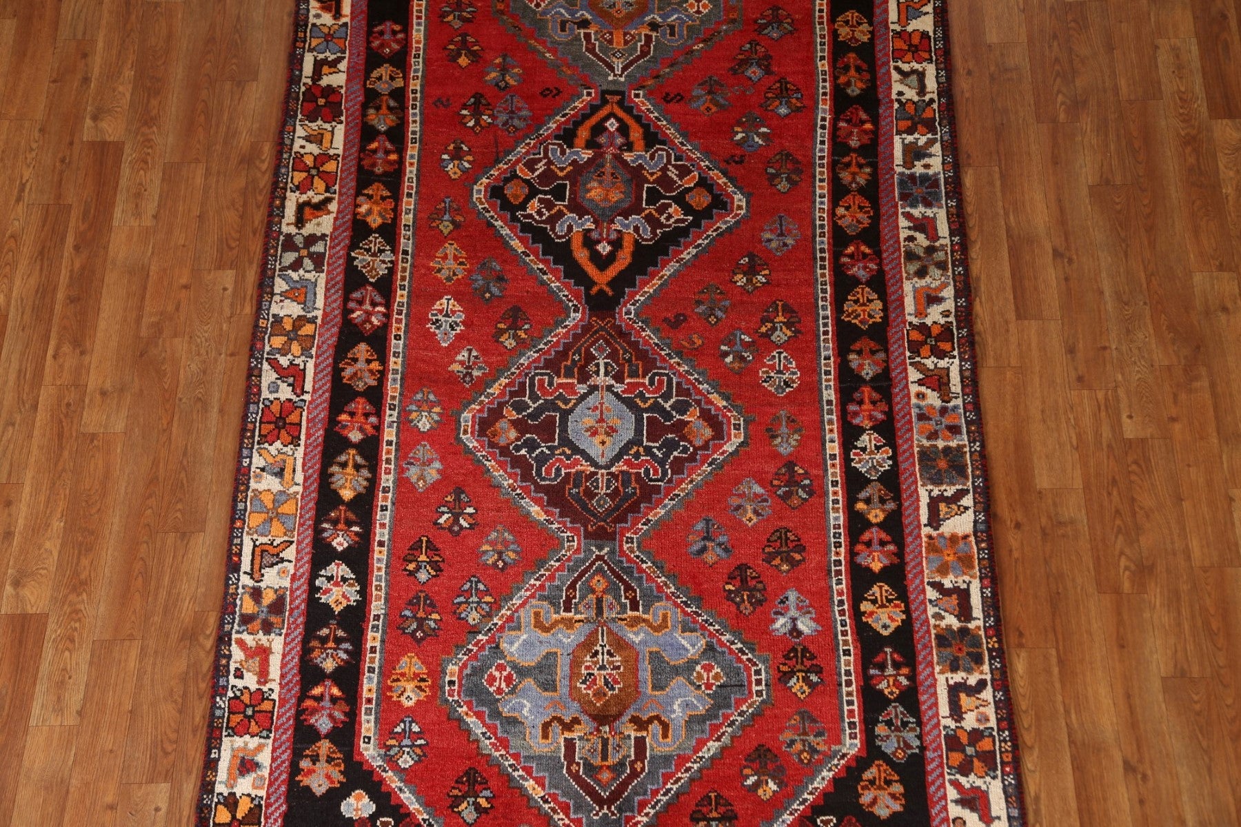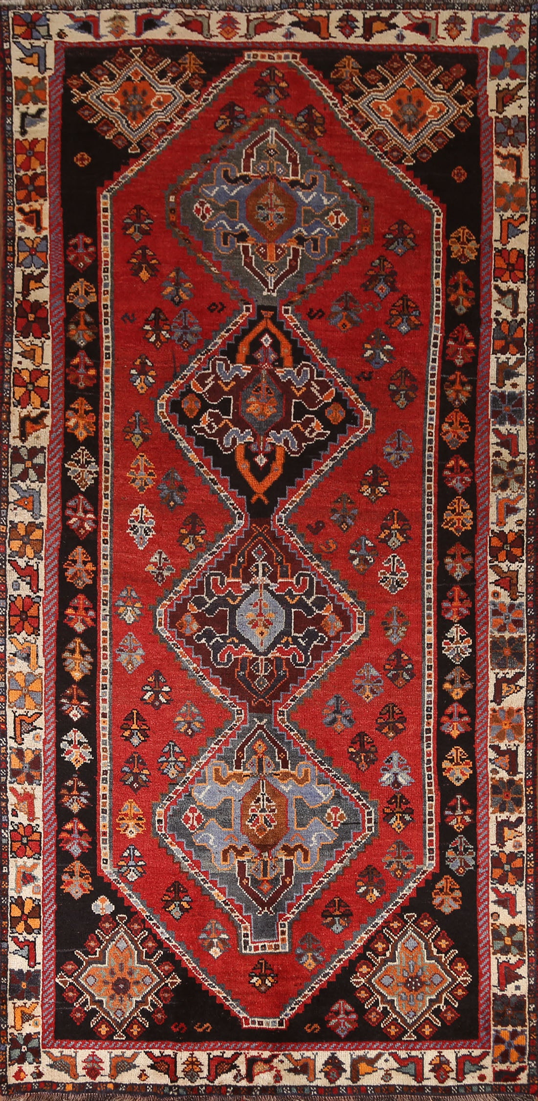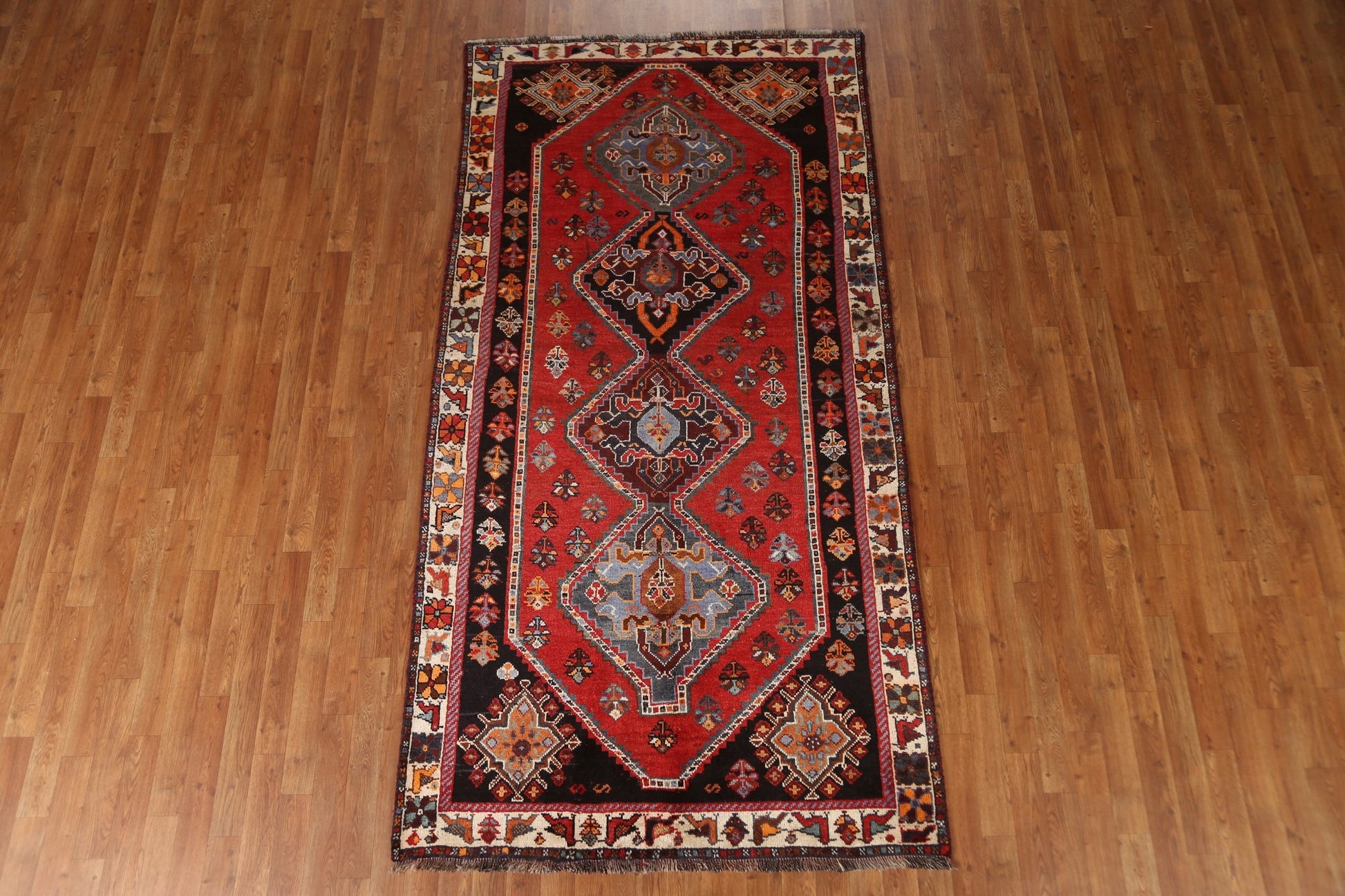 A Beautiful Genuine Persia ( Persia ) Shiraz rug is Hand Knotted by skillful weavers in Persia ( Persia ) with 100% Wool Material. This rug is in Very Good condition. dimensions are 8' 9'' X 4' 5'' in foot and 267 X 135 in centimeter. the primary color is Red.