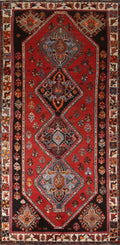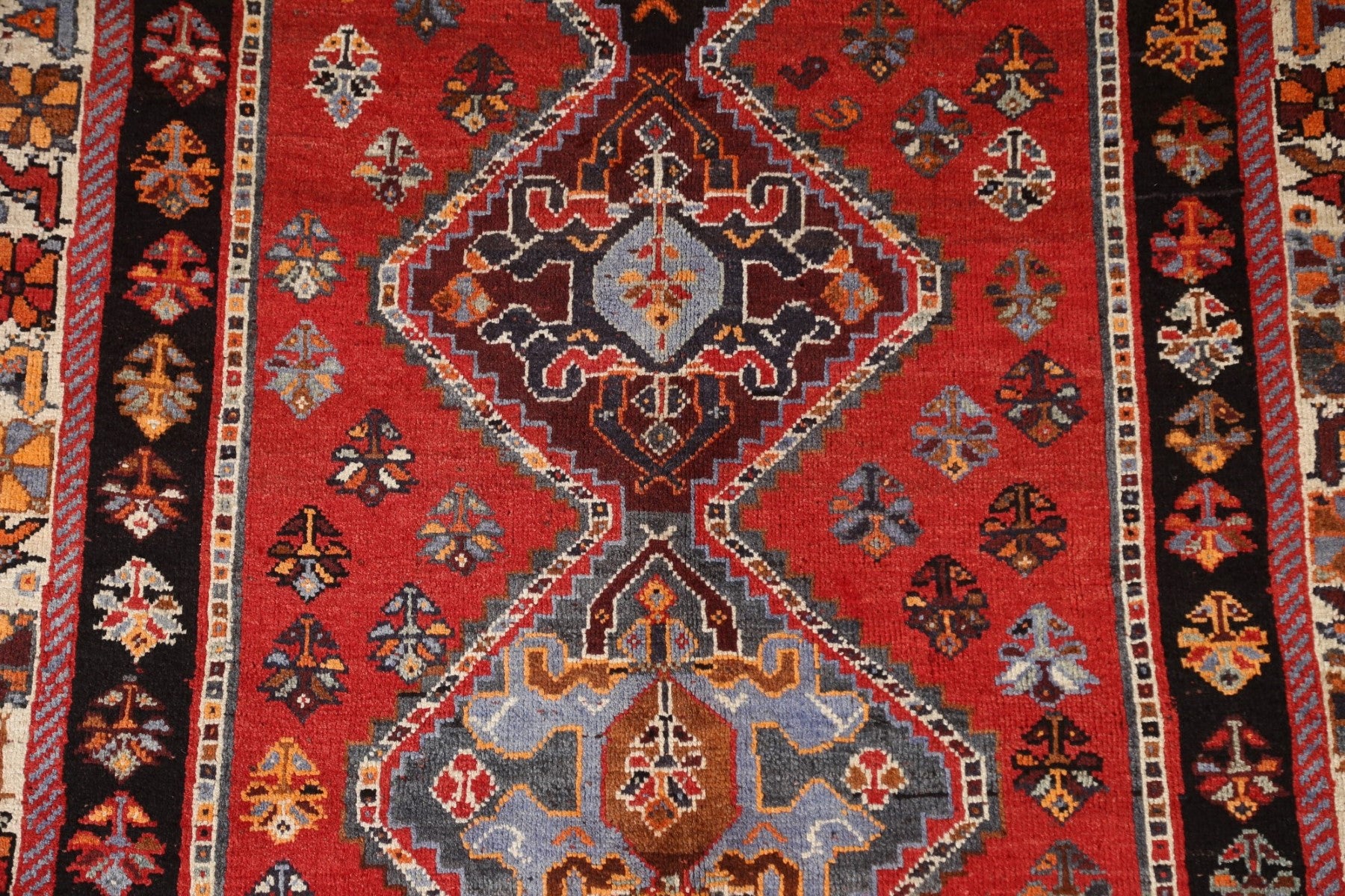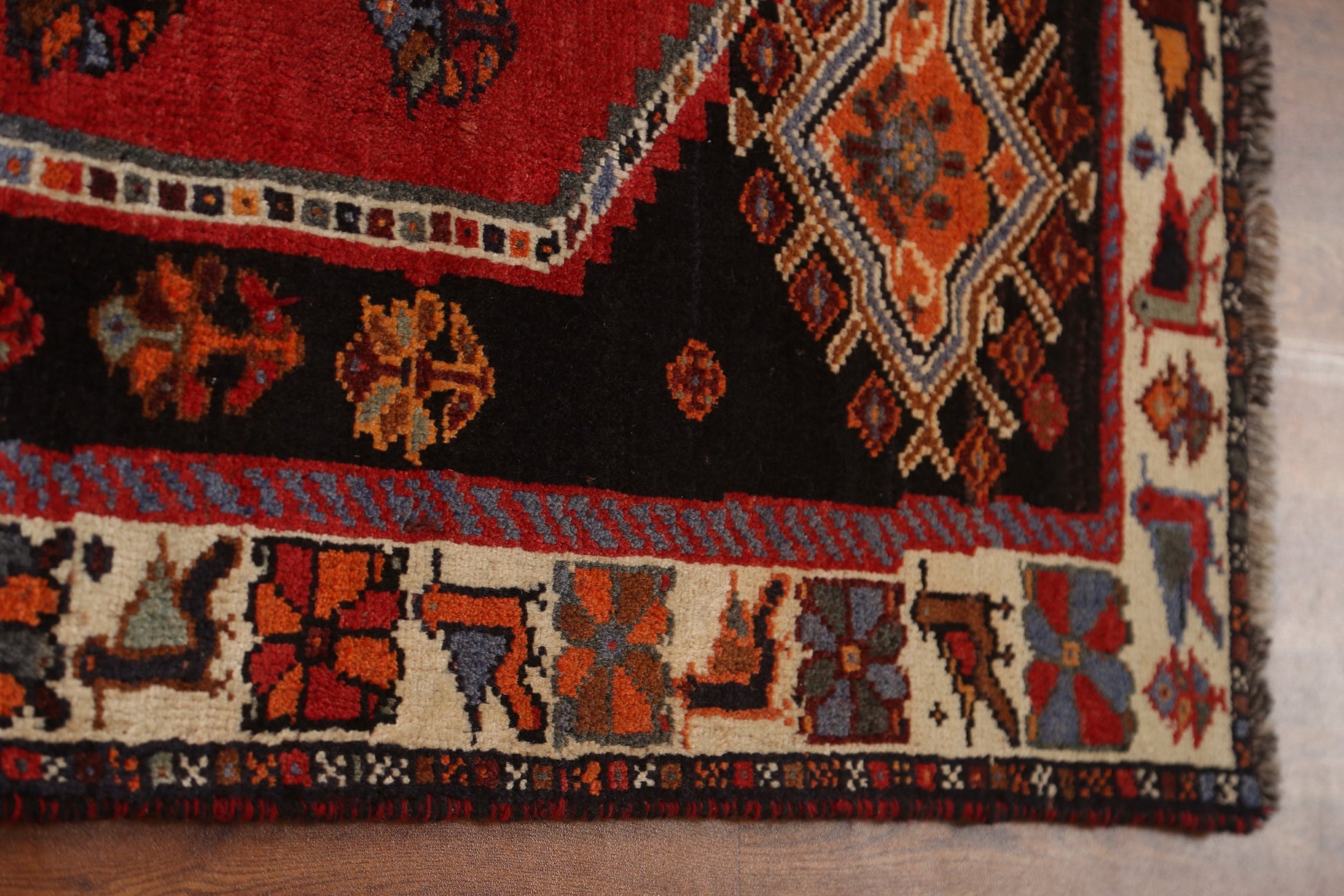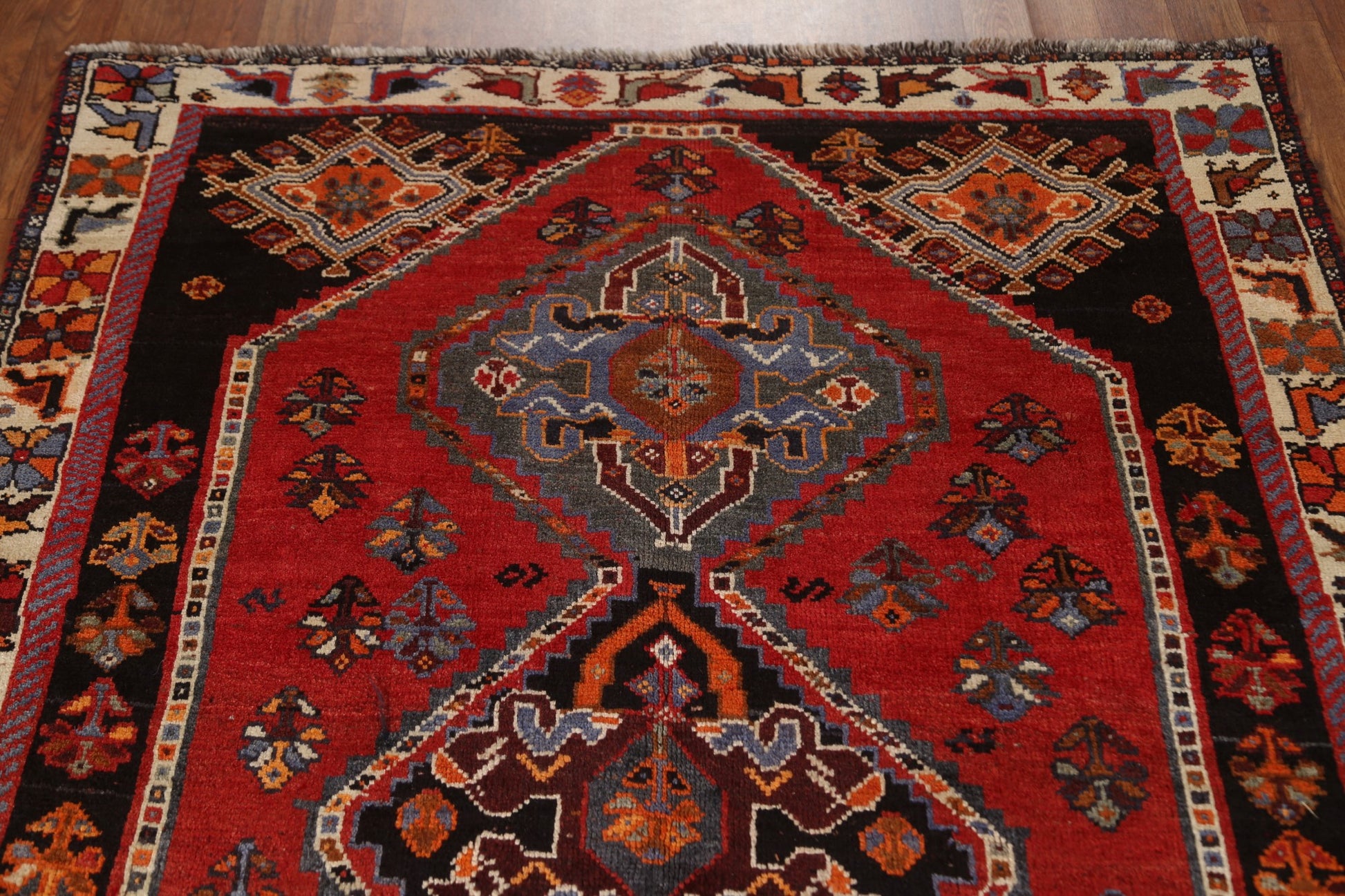 A Beautiful Genuine Persia ( Persia ) Shiraz rug is Hand Knotted by skillful weavers in Persia ( Persia ) with 100% Wool Material. This rug is in Very Good condition. dimensions are 8' 9'' X 4' 5'' in foot and 267 X 135 in centimeter. the primary color is Red.