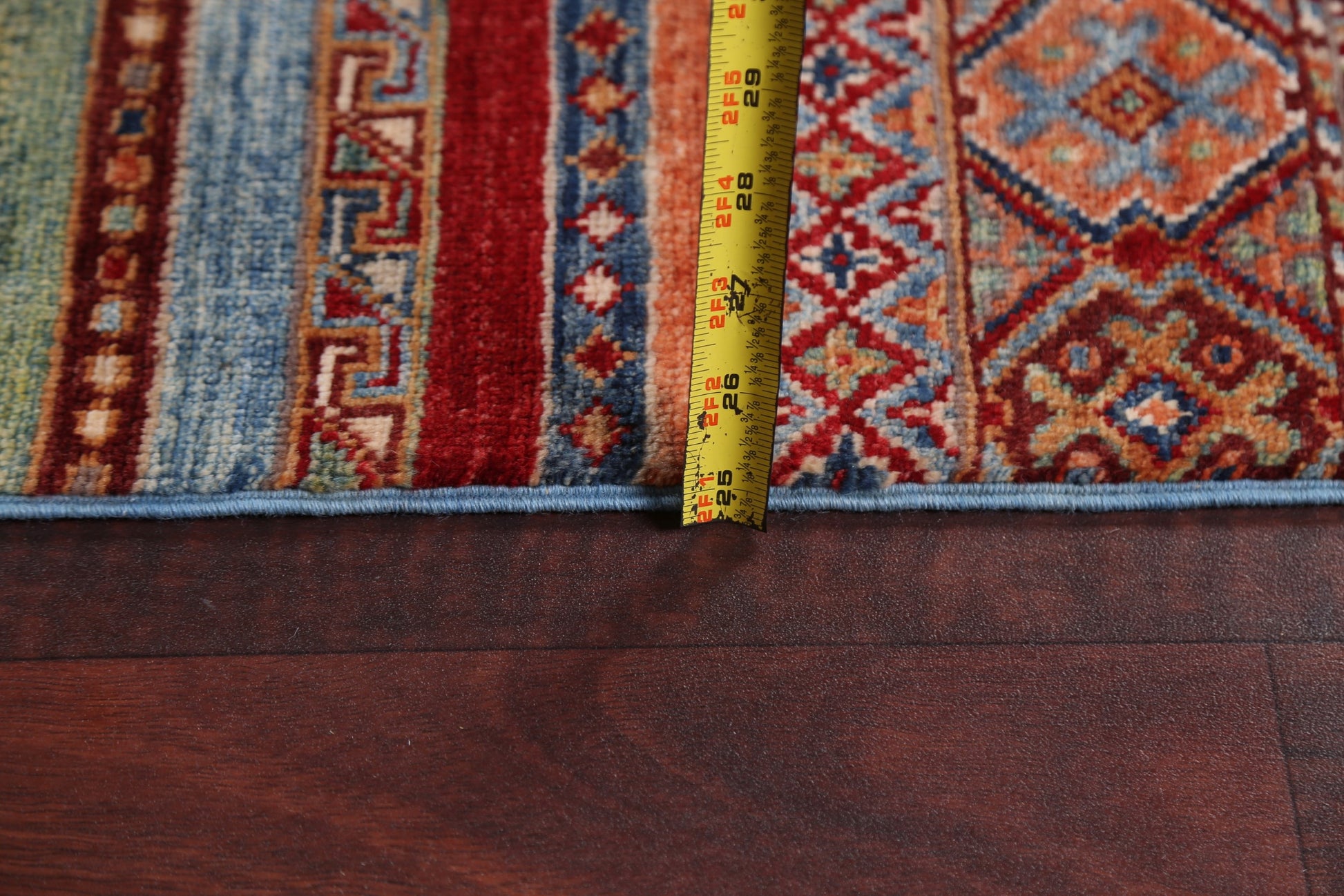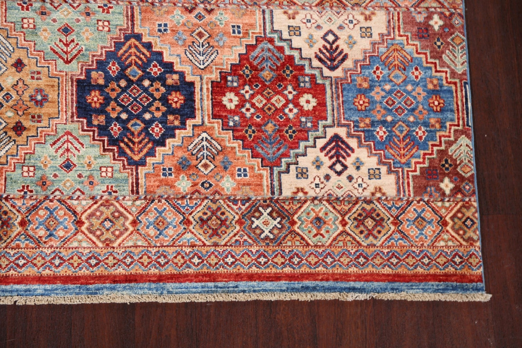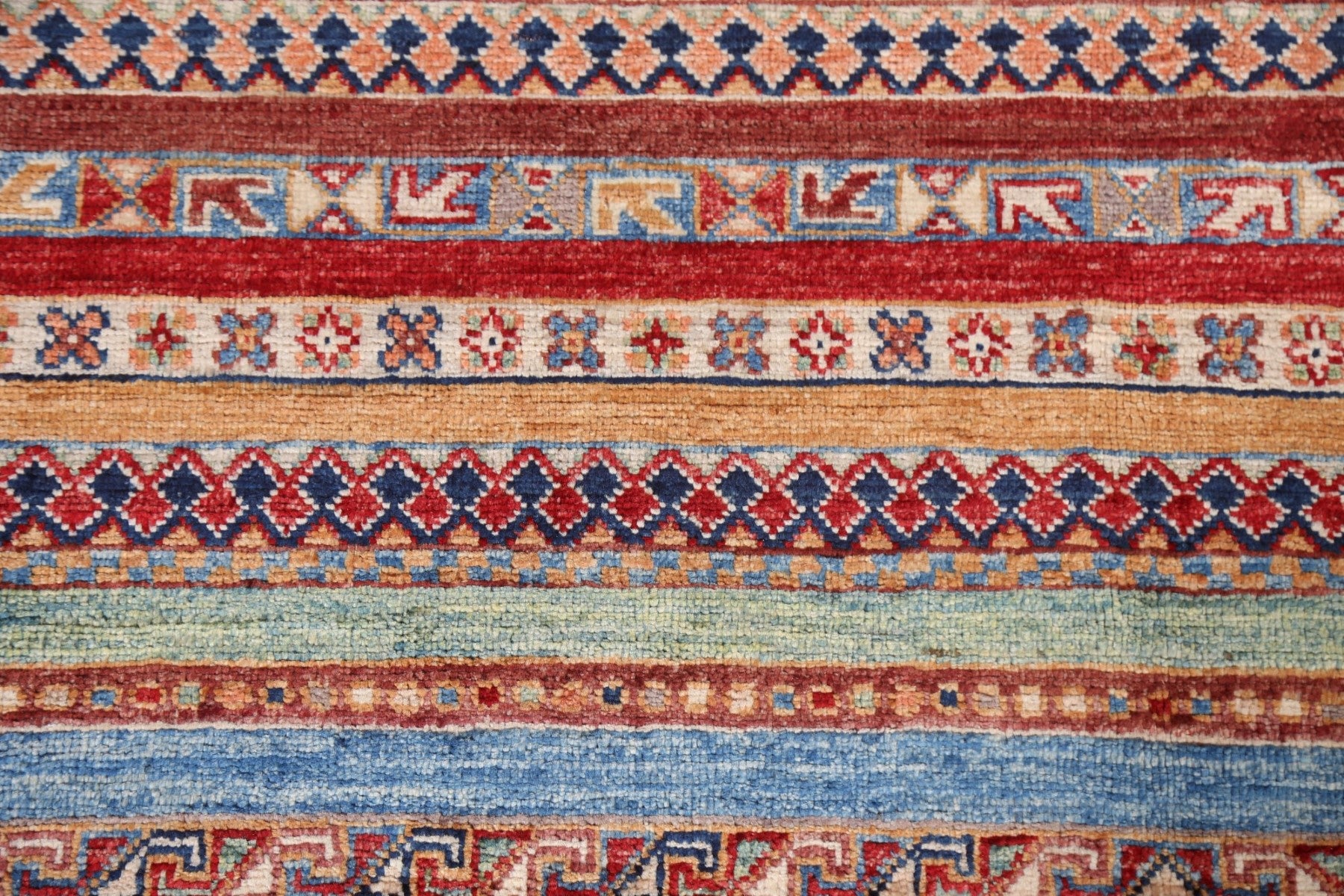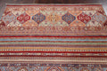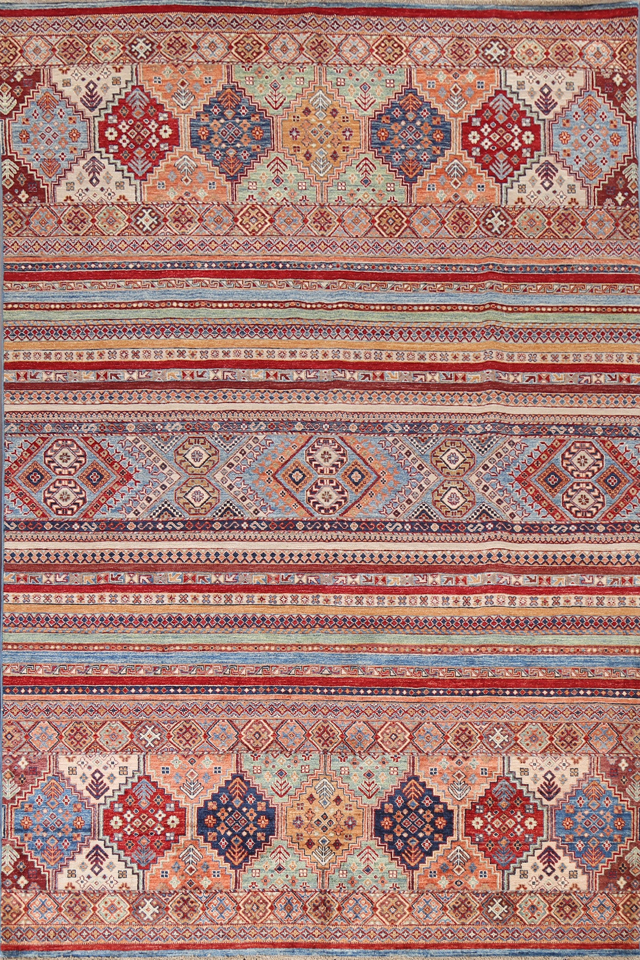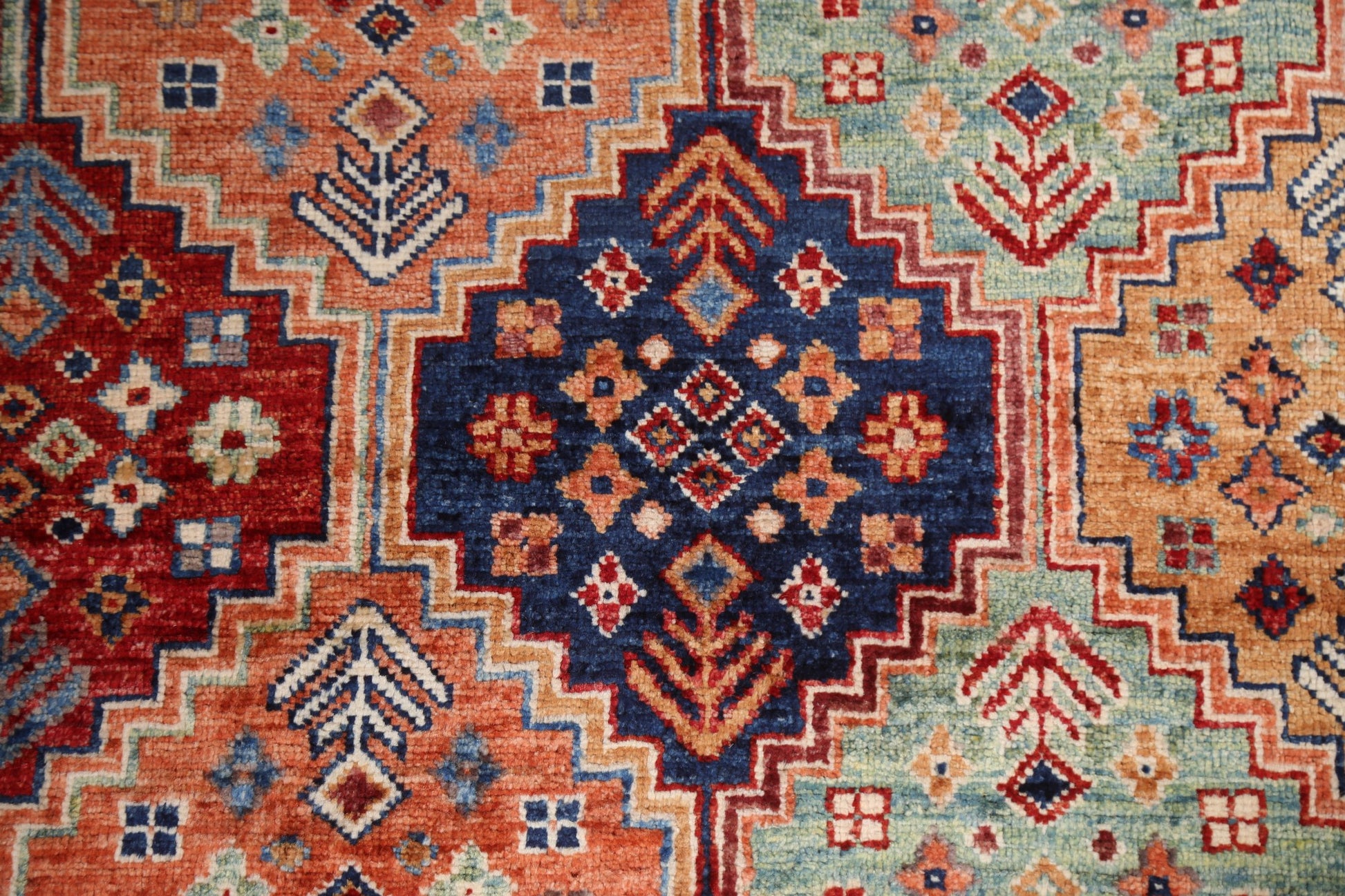 A Beautiful Genuine Pakistan Kazak rug is Hand Knotted by skillful weavers in Pakistan with 100% Wool Material. This rug is in New, First Quality condition. dimensions are 9' 8'' X 6' 7'' in foot and 295 X 201 in centimeter. the primary color is Multi-Colored.