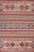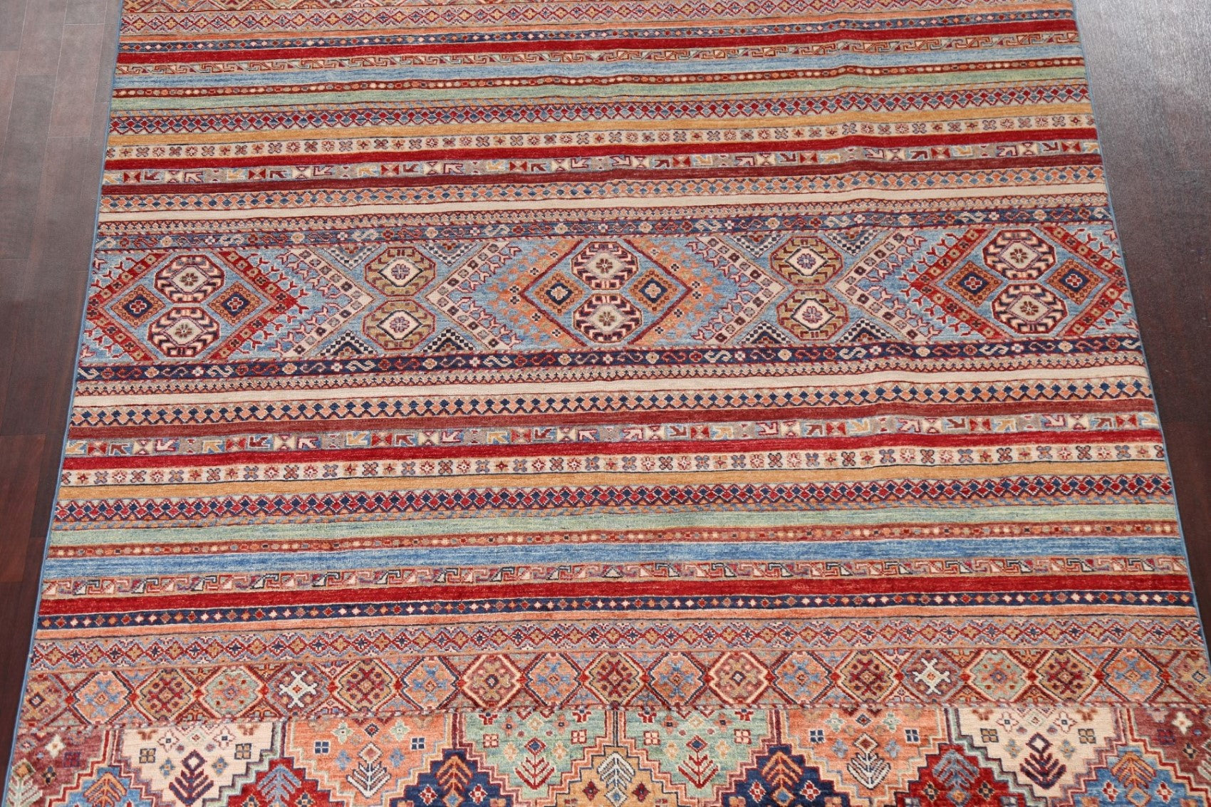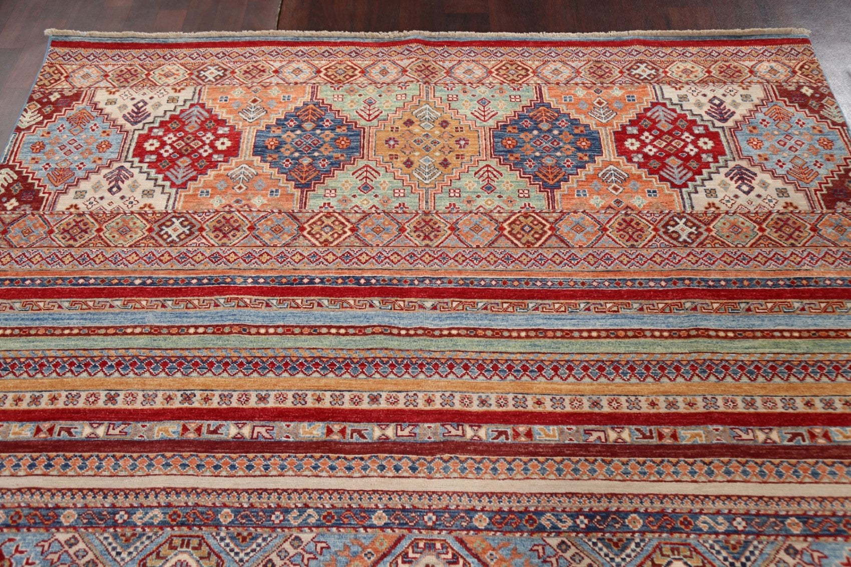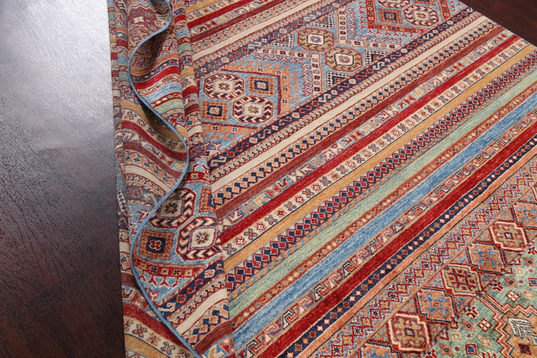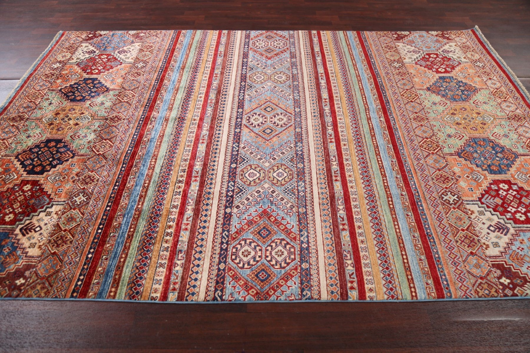 A Beautiful Genuine Pakistan Kazak rug is Hand Knotted by skillful weavers in Pakistan with 100% Wool Material. This rug is in New, First Quality condition. dimensions are 9' 8'' X 6' 7'' in foot and 295 X 201 in centimeter. the primary color is Multi-Colored.