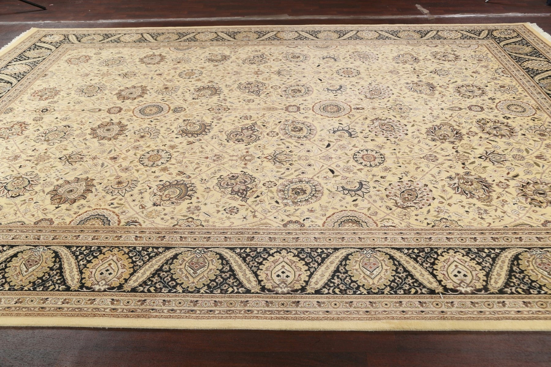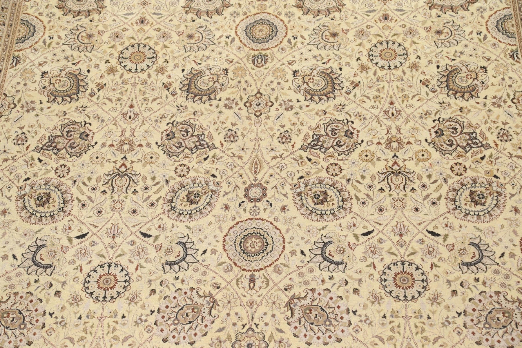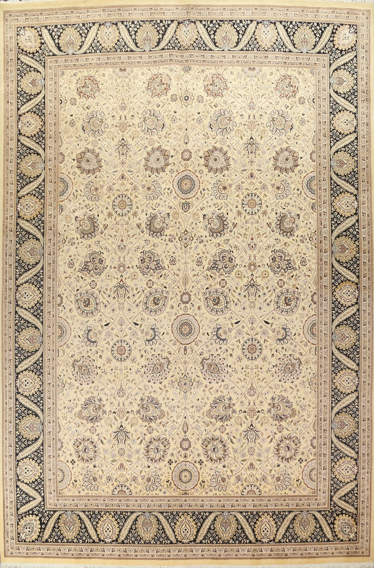 A Beautiful Genuine Pakistan Tabriz rug is Hand Knotted by skillful weavers in Pakistan with Wool & Silk Material. This rug is in New, First Quality condition. dimensions are 14' 2'' X 9' 11'' in foot and 432 X 302 in centimeter. the primary color is Beige & Ivories.