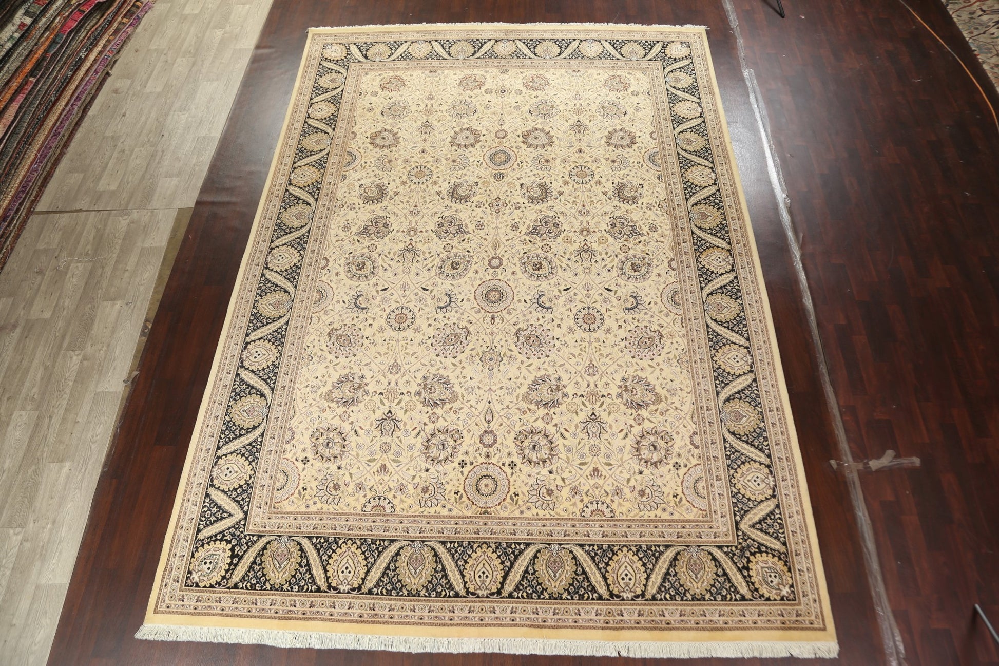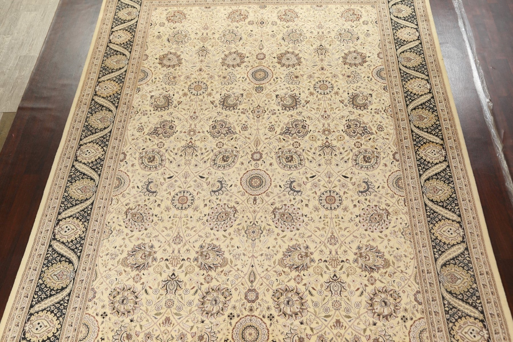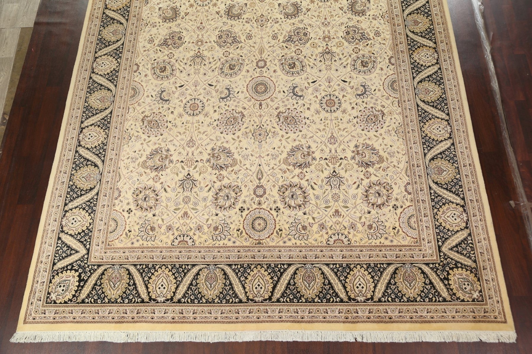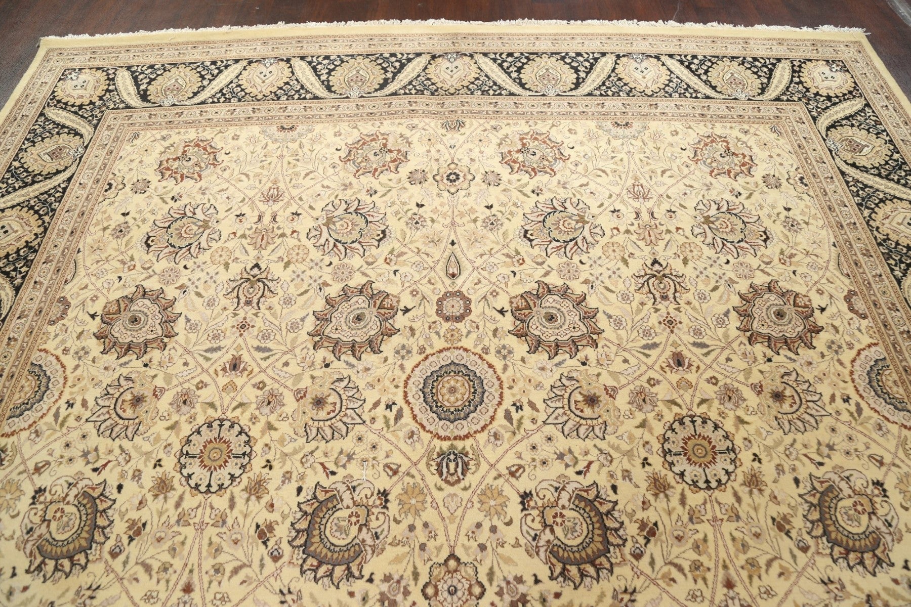 A Beautiful Genuine Pakistan Tabriz rug is Hand Knotted by skillful weavers in Pakistan with Wool & Silk Material. This rug is in New, First Quality condition. dimensions are 14' 2'' X 9' 11'' in foot and 432 X 302 in centimeter. the primary color is Beige & Ivories.