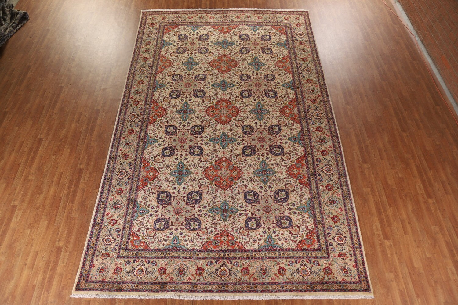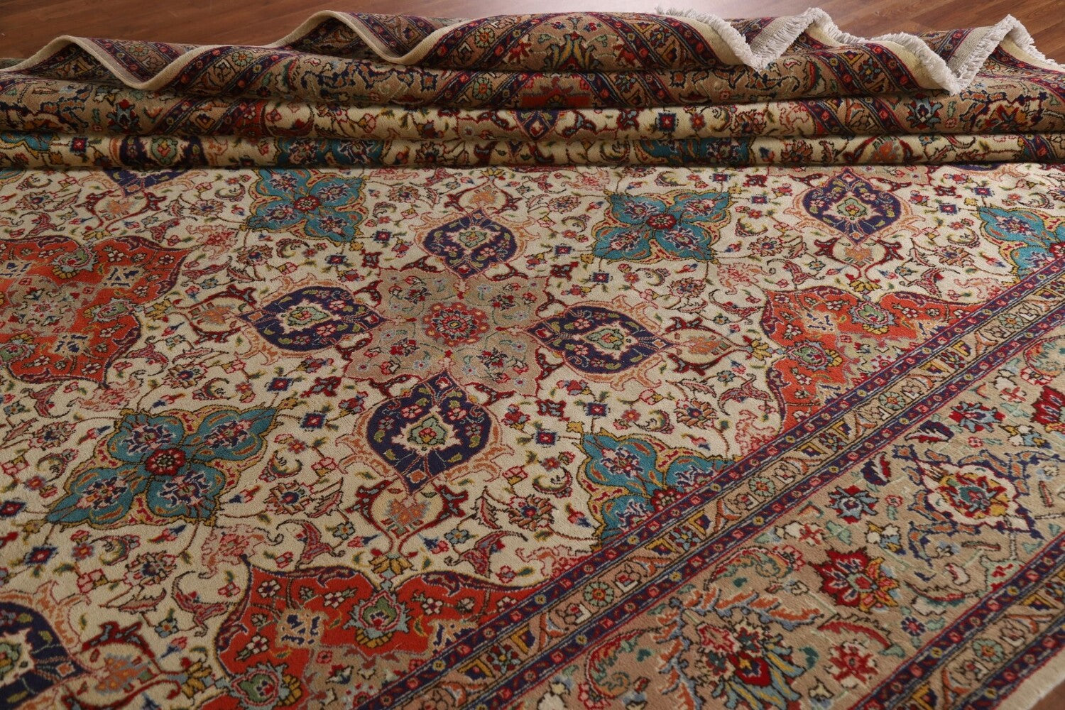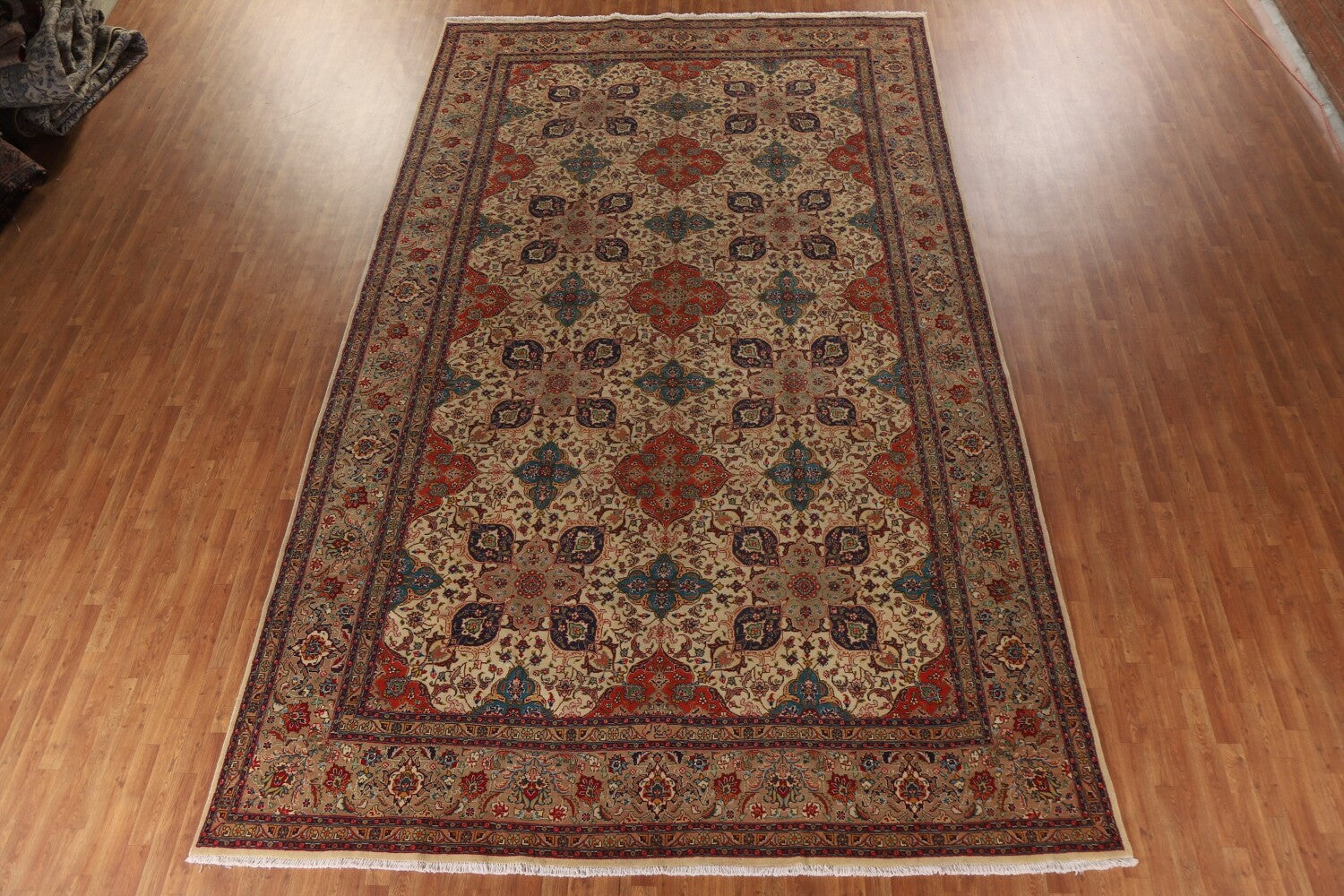 A Beautiful Genuine Persia ( Persia ) Tabriz rug is Hand Knotted by skillful weavers in Persia ( Persia ) with 100% Wool Material. This rug is in Excellent condition. dimensions are 16' 3'' X 9' 10'' in foot and 495 X 300 in centimeter. the primary color is Beige & Ivories.