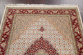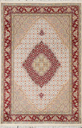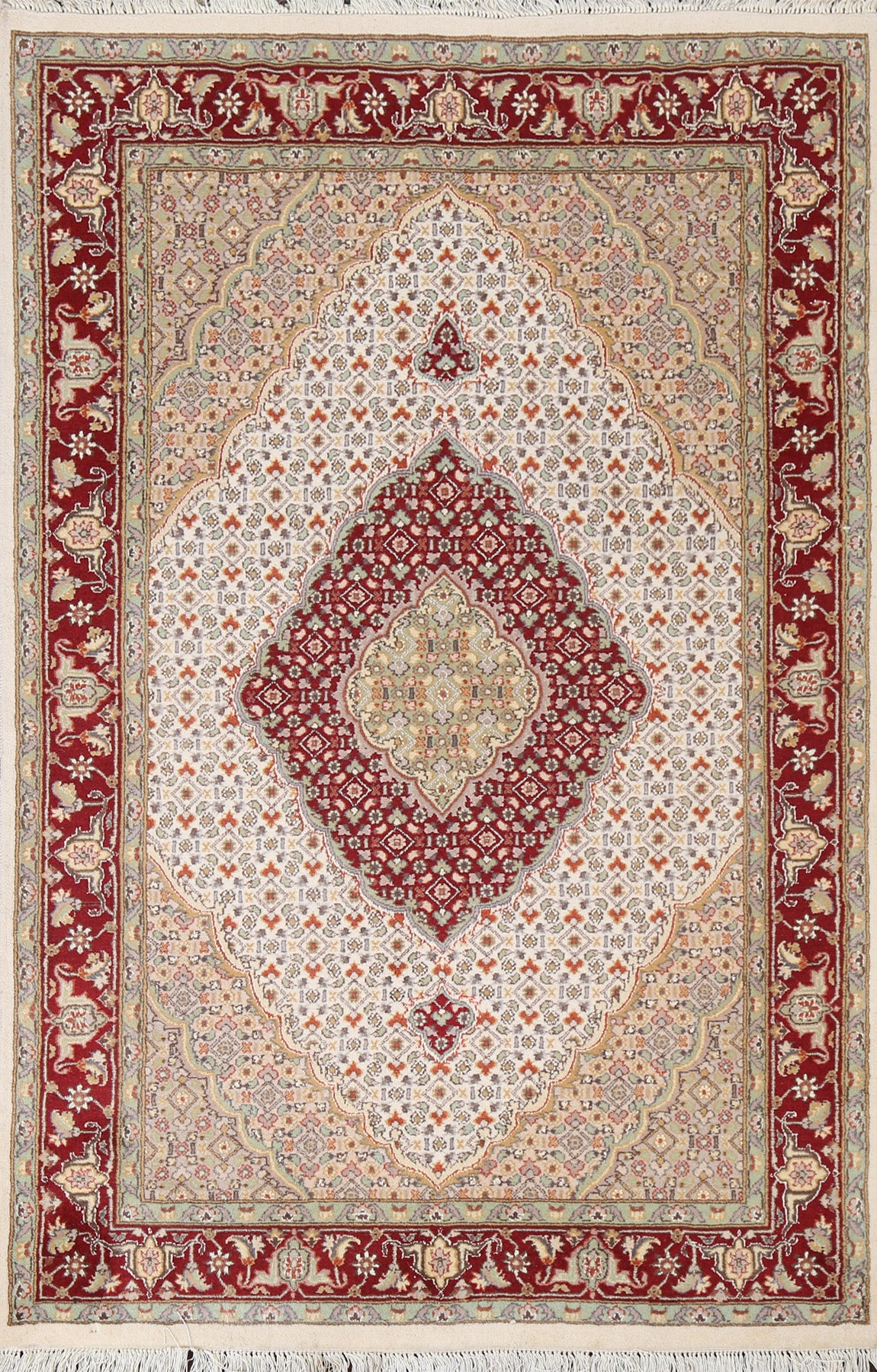 A Beautiful Genuine Pakistan Tabriz-Mahi rug is Hand Knotted by skillful weavers in Pakistan with Wool & Silk Material. This rug is in New, First Quality condition. dimensions are 6' 2'' X 4' 1'' in foot and 188 X 124 in centimeter. the primary color is Beige & Ivories.