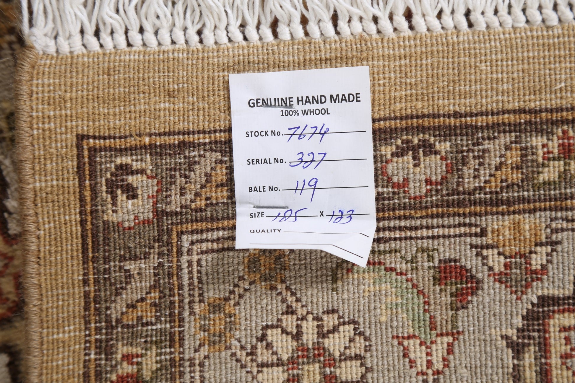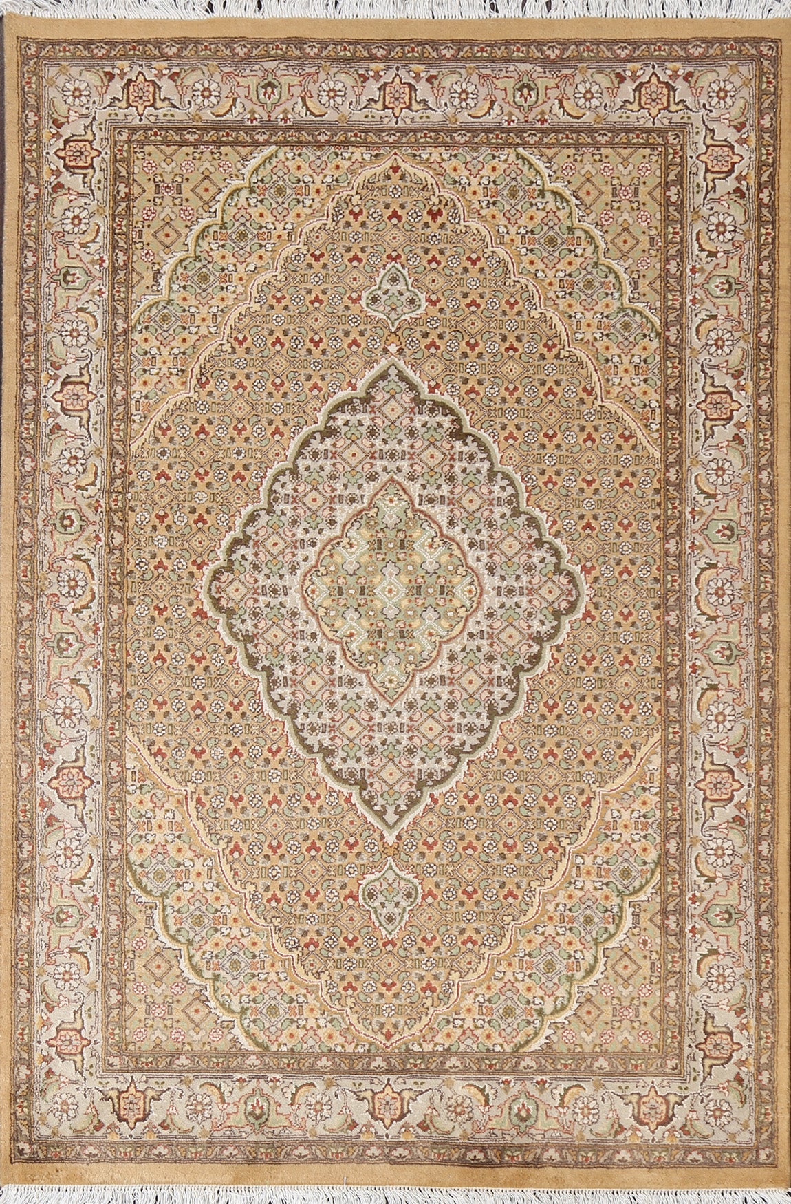 A Beautiful Genuine Pakistan Tabriz-Mahi rug is Hand Knotted by skillful weavers in Pakistan with Wool & Silk Material. This rug is in New, First Quality condition. dimensions are 6' 2'' X 4' 1'' in foot and 188 X 124 in centimeter. the primary color is Brown.