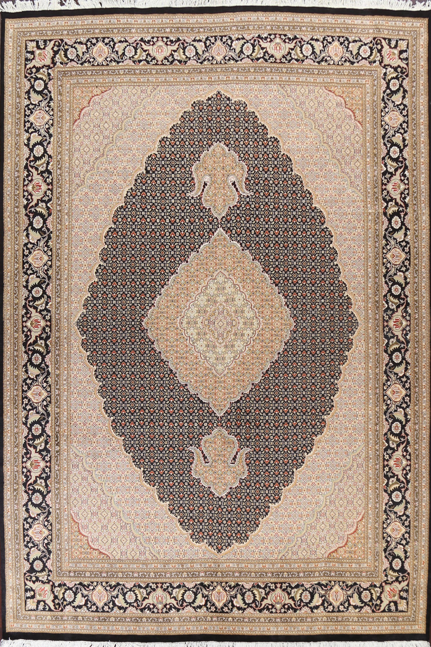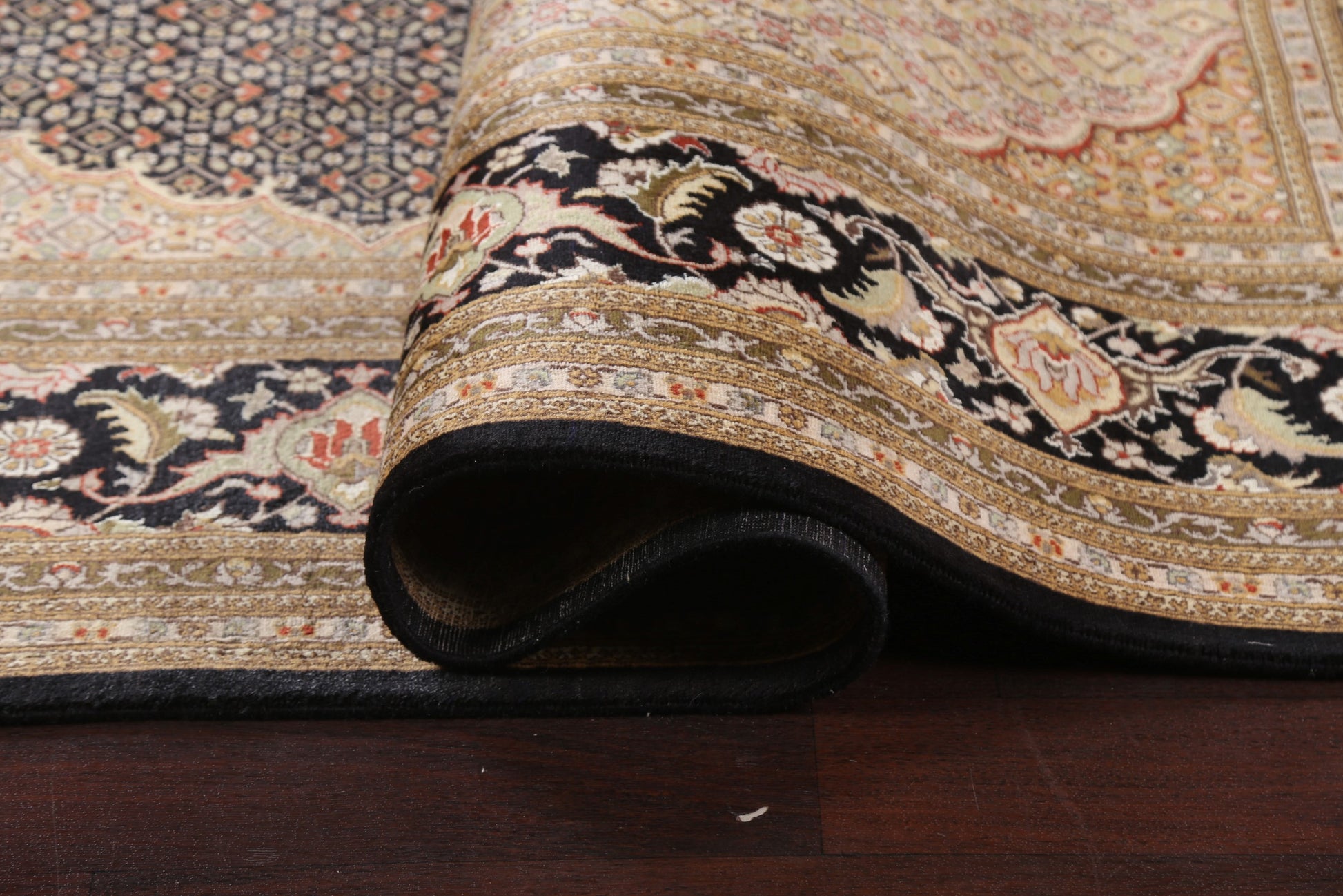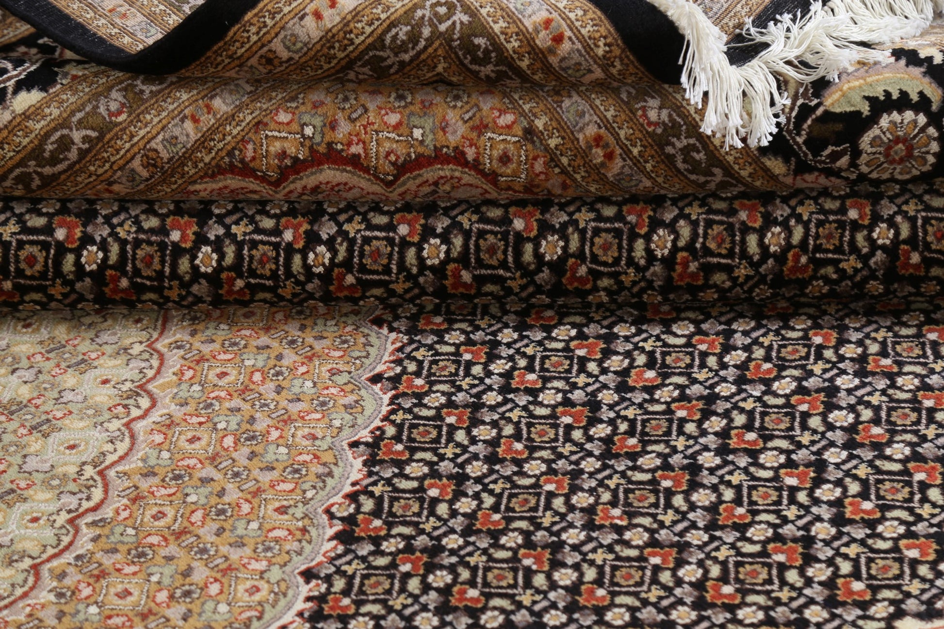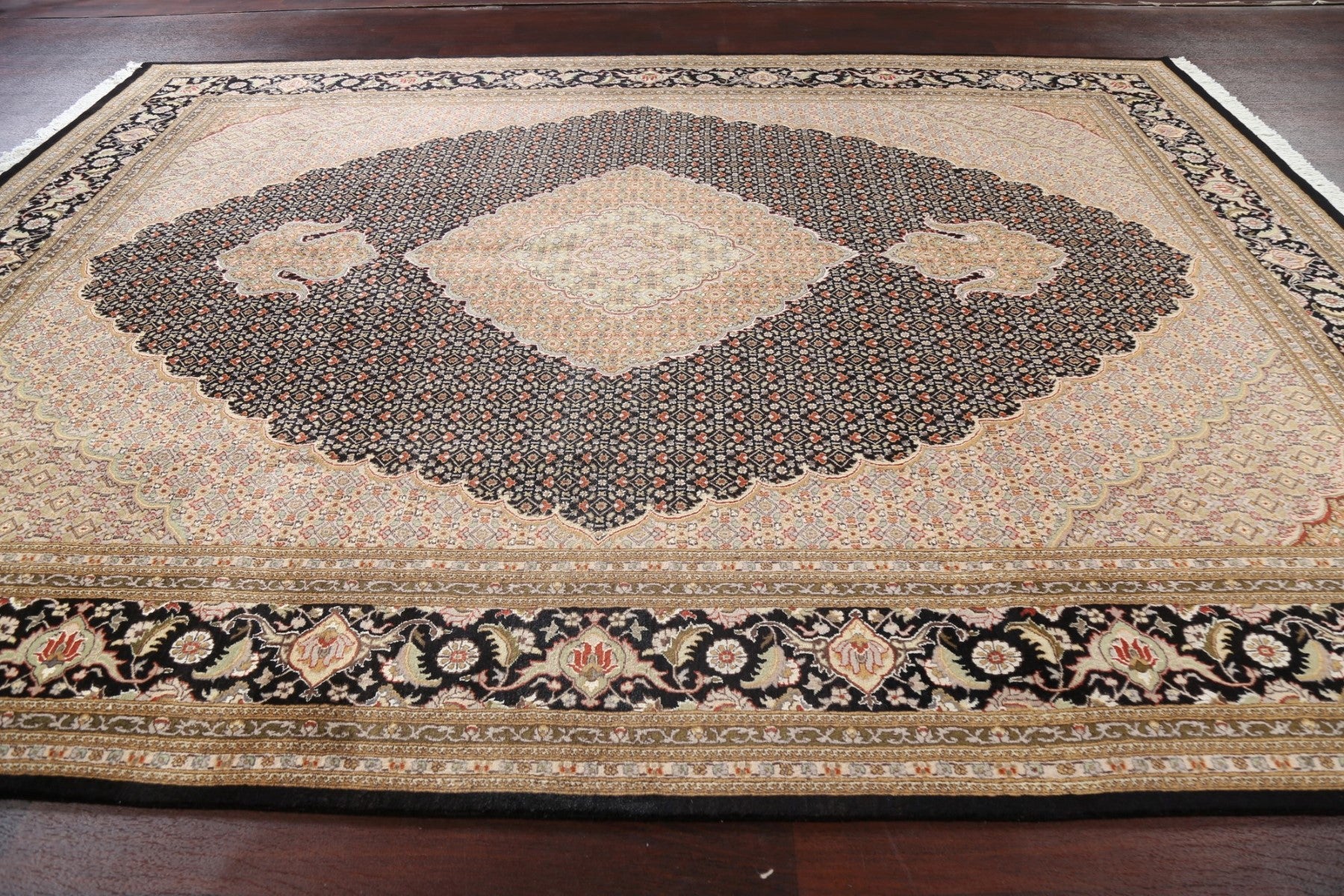 A Beautiful Genuine Pakistan Tabriz rug is Hand Knotted by skillful weavers in Pakistan with Wool & Silk Material. This rug is in New, First Quality condition. dimensions are 12' 1'' X 9' 0'' in foot and 368 X 274 in centimeter. the primary color is Black.