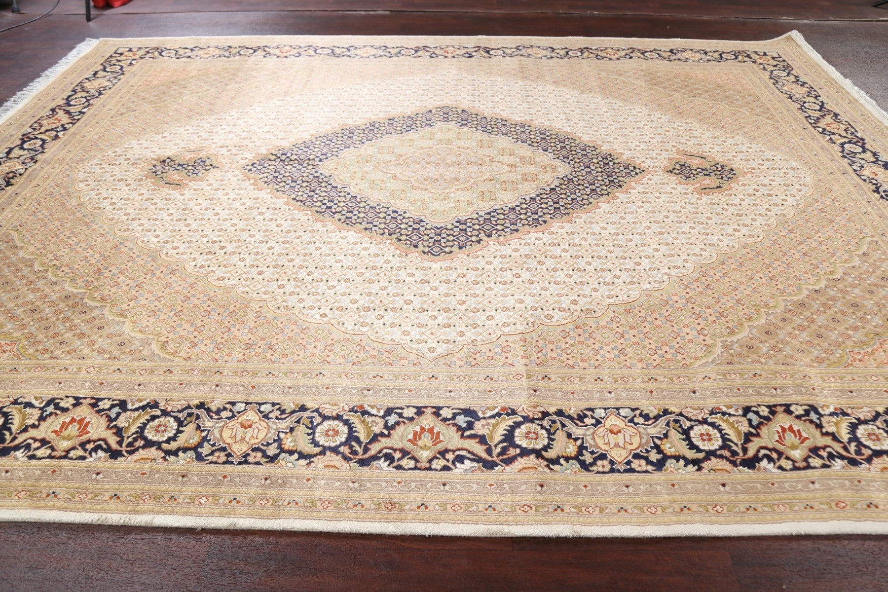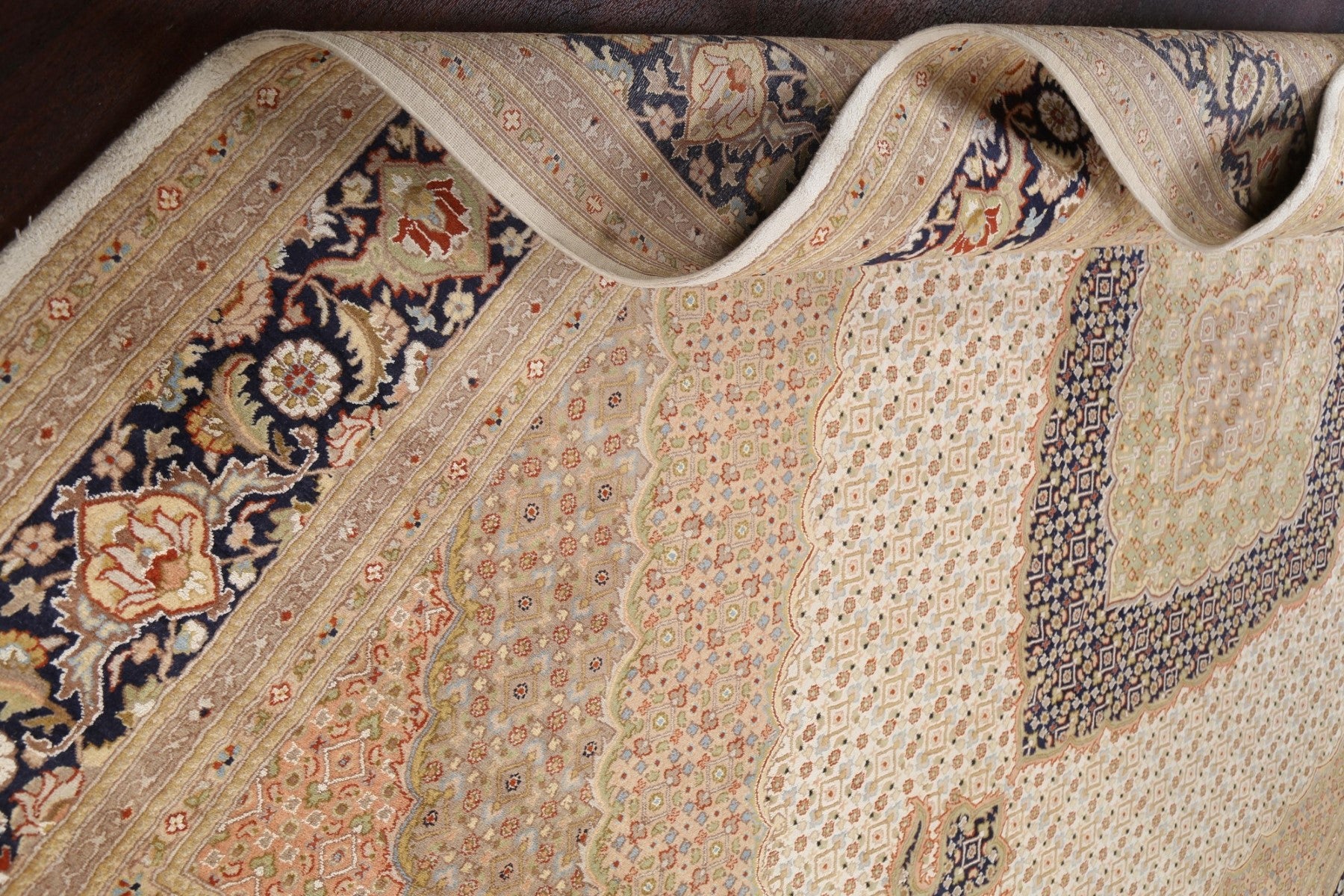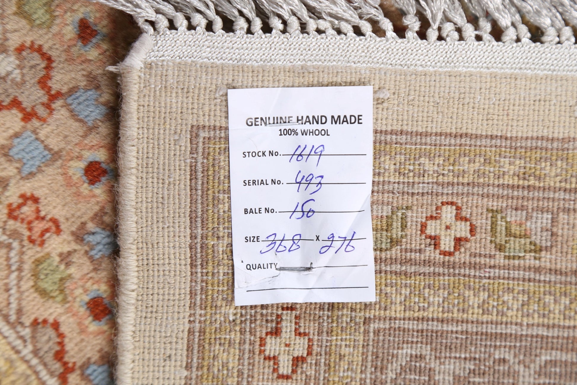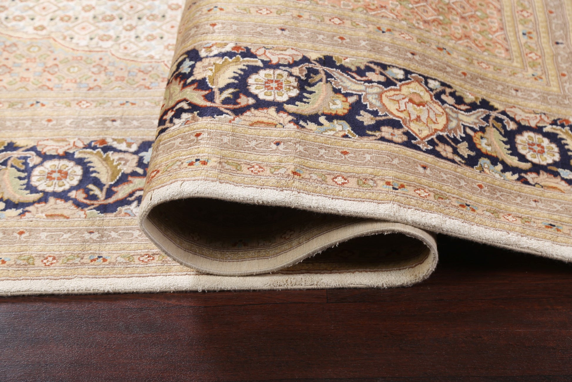 A Beautiful Genuine Pakistan Tabriz rug is Hand Knotted by skillful weavers in Pakistan with Wool & Silk Material. This rug is in New, First Quality condition. dimensions are 12' 1'' X 9' 1'' in foot and 368 X 277 in centimeter. the primary color is Beige & Ivories.
