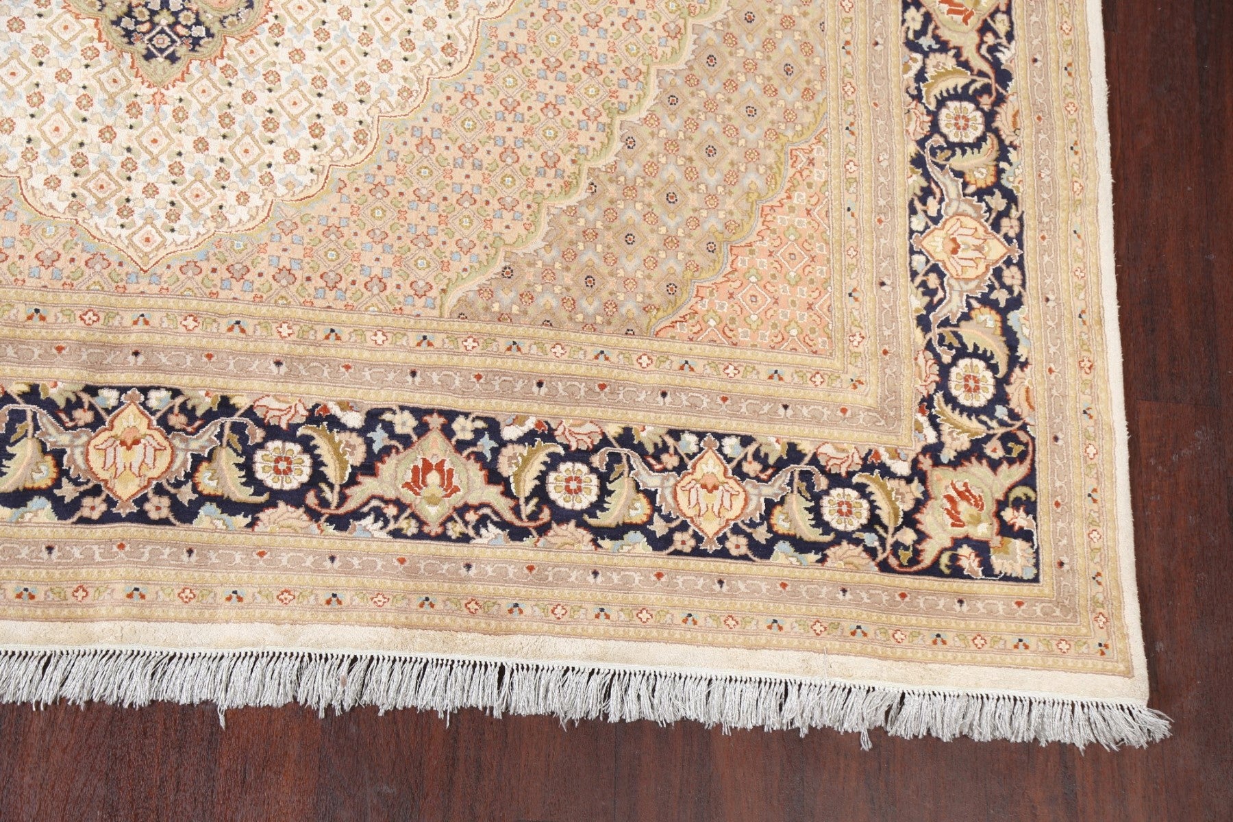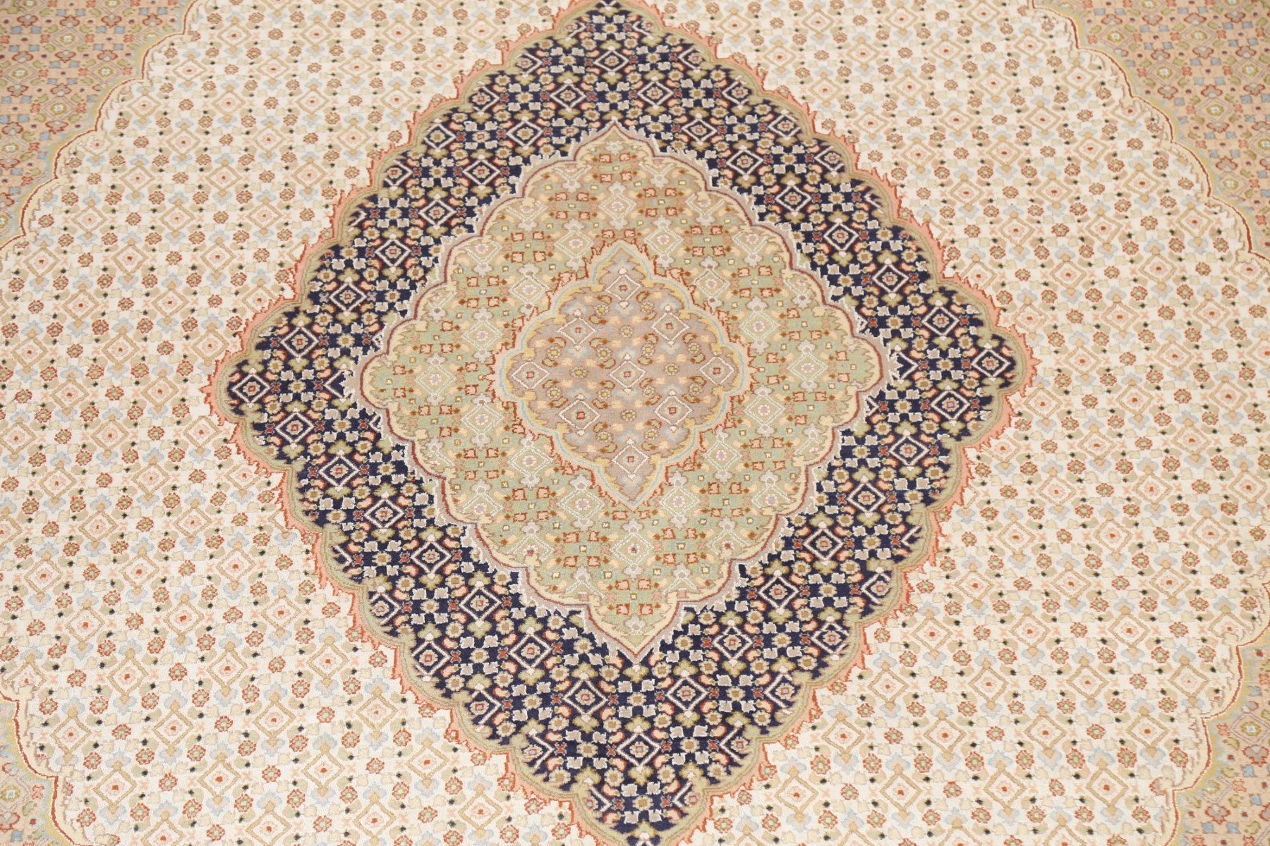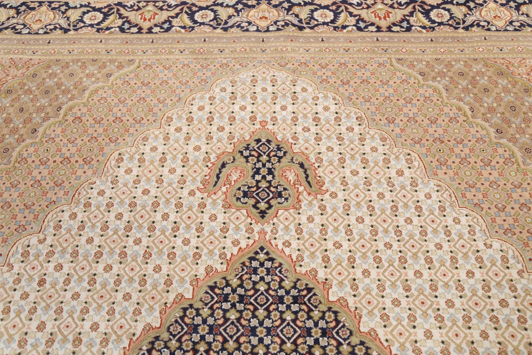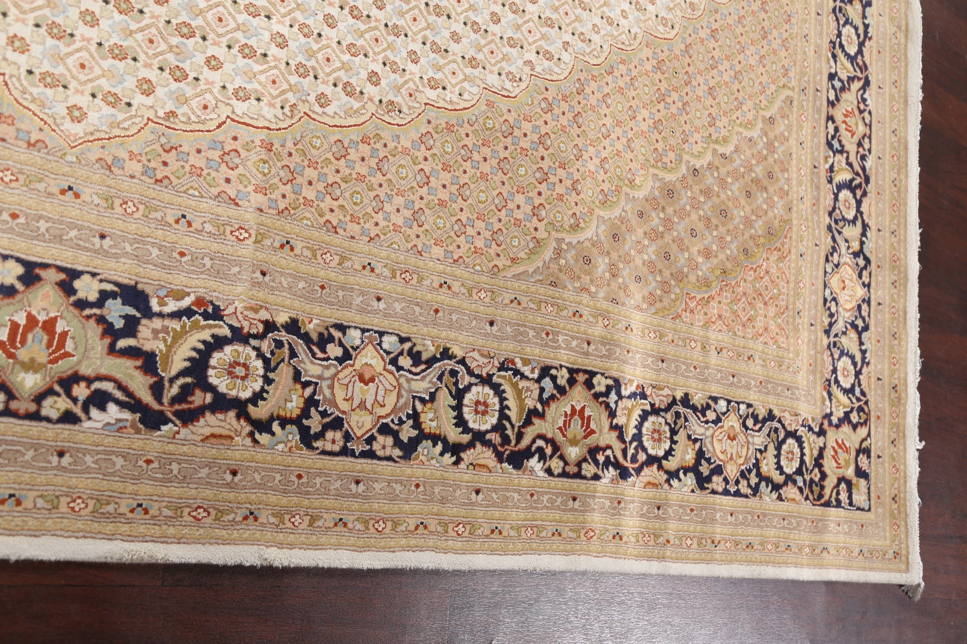 A Beautiful Genuine Pakistan Tabriz rug is Hand Knotted by skillful weavers in Pakistan with Wool & Silk Material. This rug is in New, First Quality condition. dimensions are 12' 1'' X 9' 1'' in foot and 368 X 277 in centimeter. the primary color is Beige & Ivories.