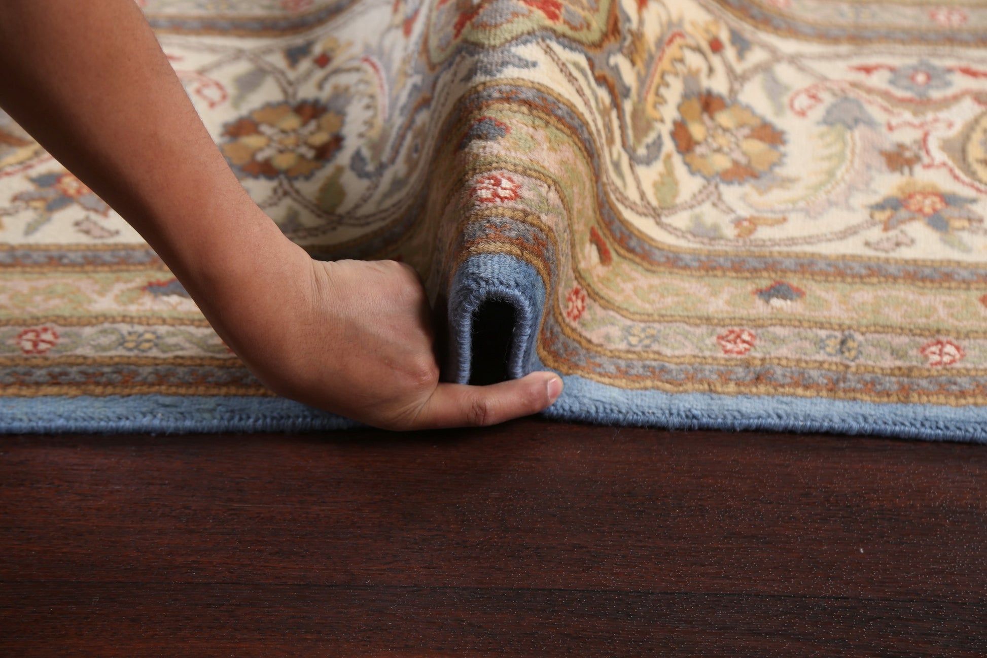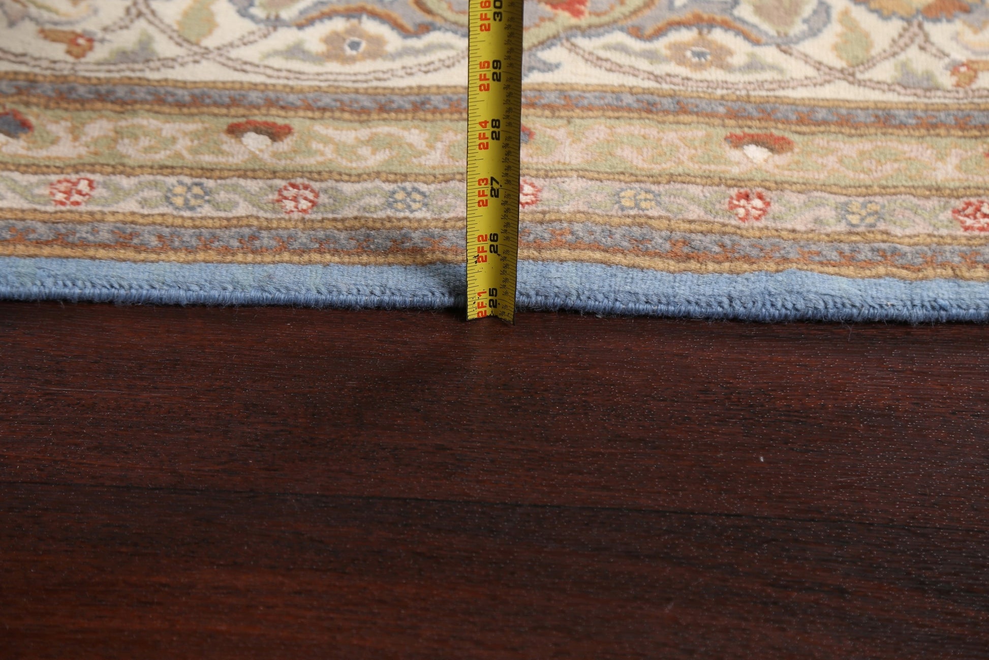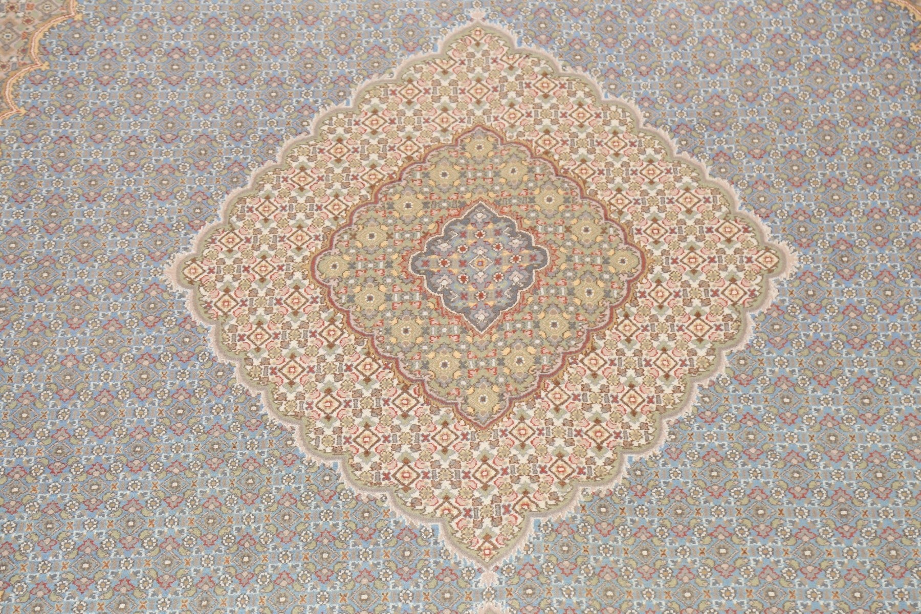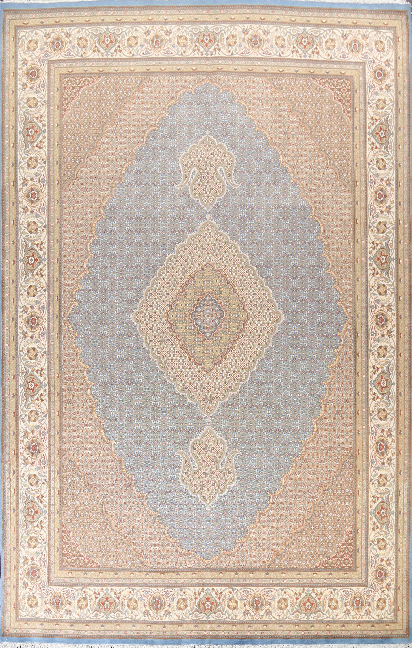 A Beautiful Genuine Pakistan Tabriz rug is Hand Knotted by skillful weavers in Pakistan with Wool & Silk Material. This rug is in New, First Quality condition. dimensions are 12' 7'' X 9' 0'' in foot and 384 X 274 in centimeter. the primary color is Navy Blue & Blues.