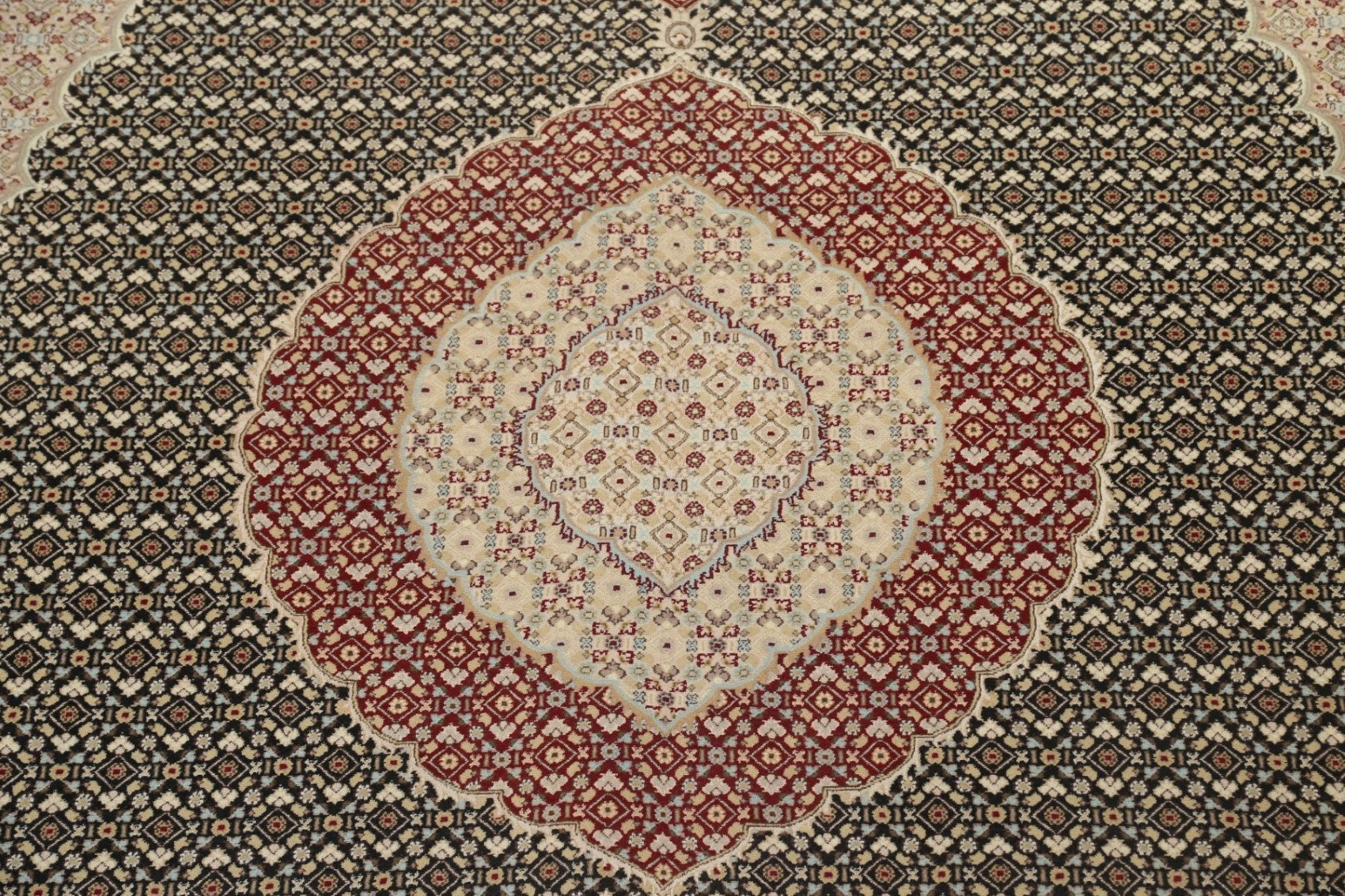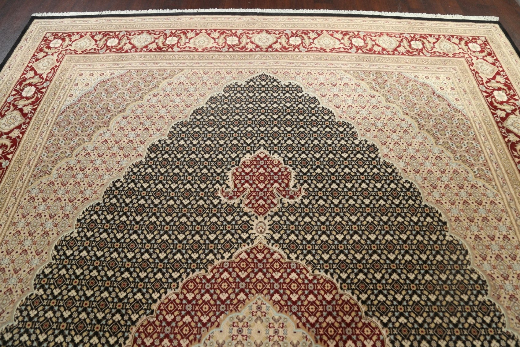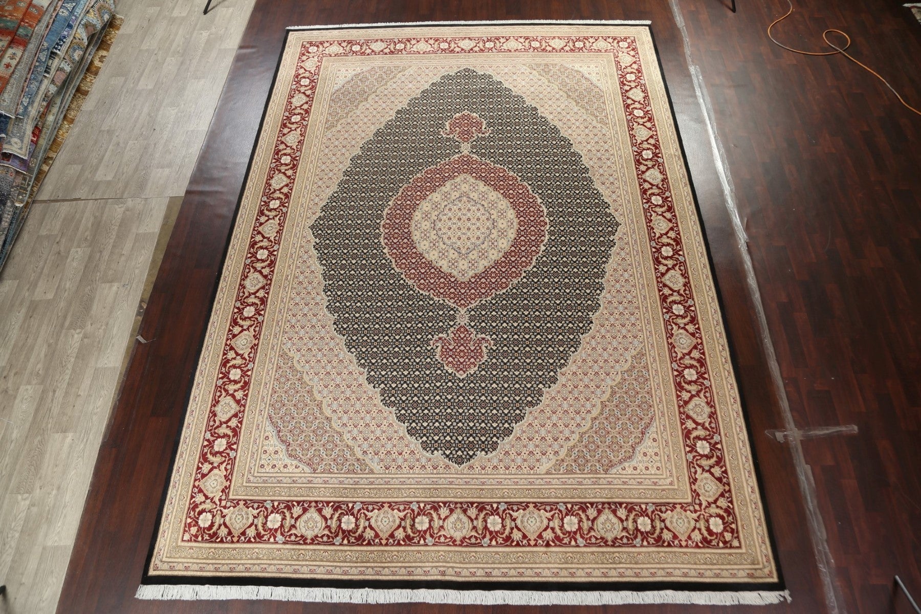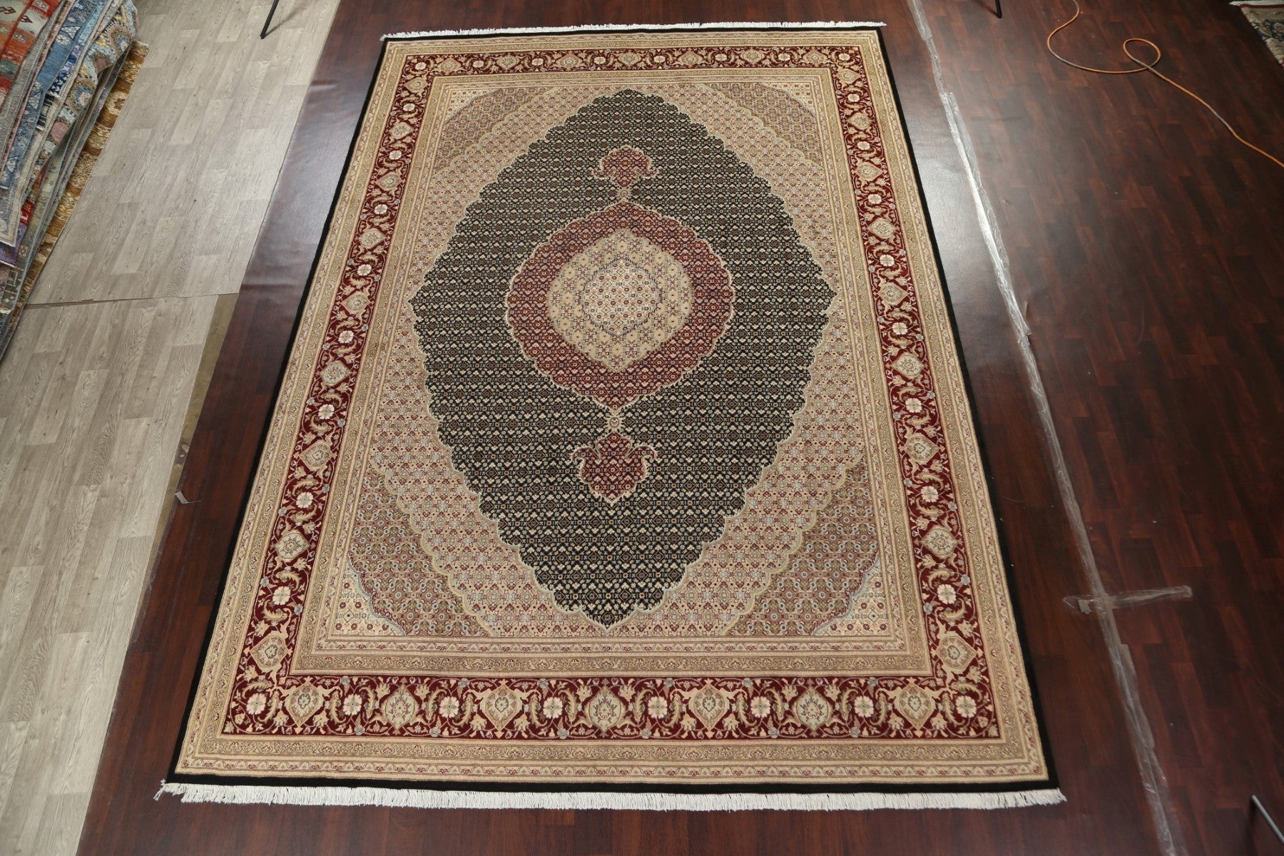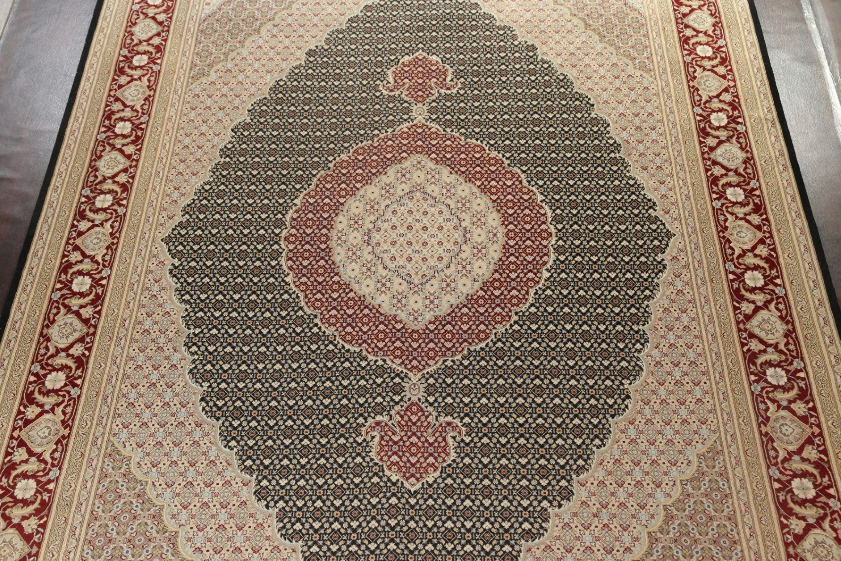 A Beautiful Genuine Persia ( Persia ) Tabriz-Mahi rug is Hand Knotted by skillful weavers in Persia ( Persia ) with Wool & Silk Material. This rug is in New, First Quality condition. dimensions are 14' 4'' X 10' 1'' in foot and 437 X 307 in centimeter. the primary color is Black.