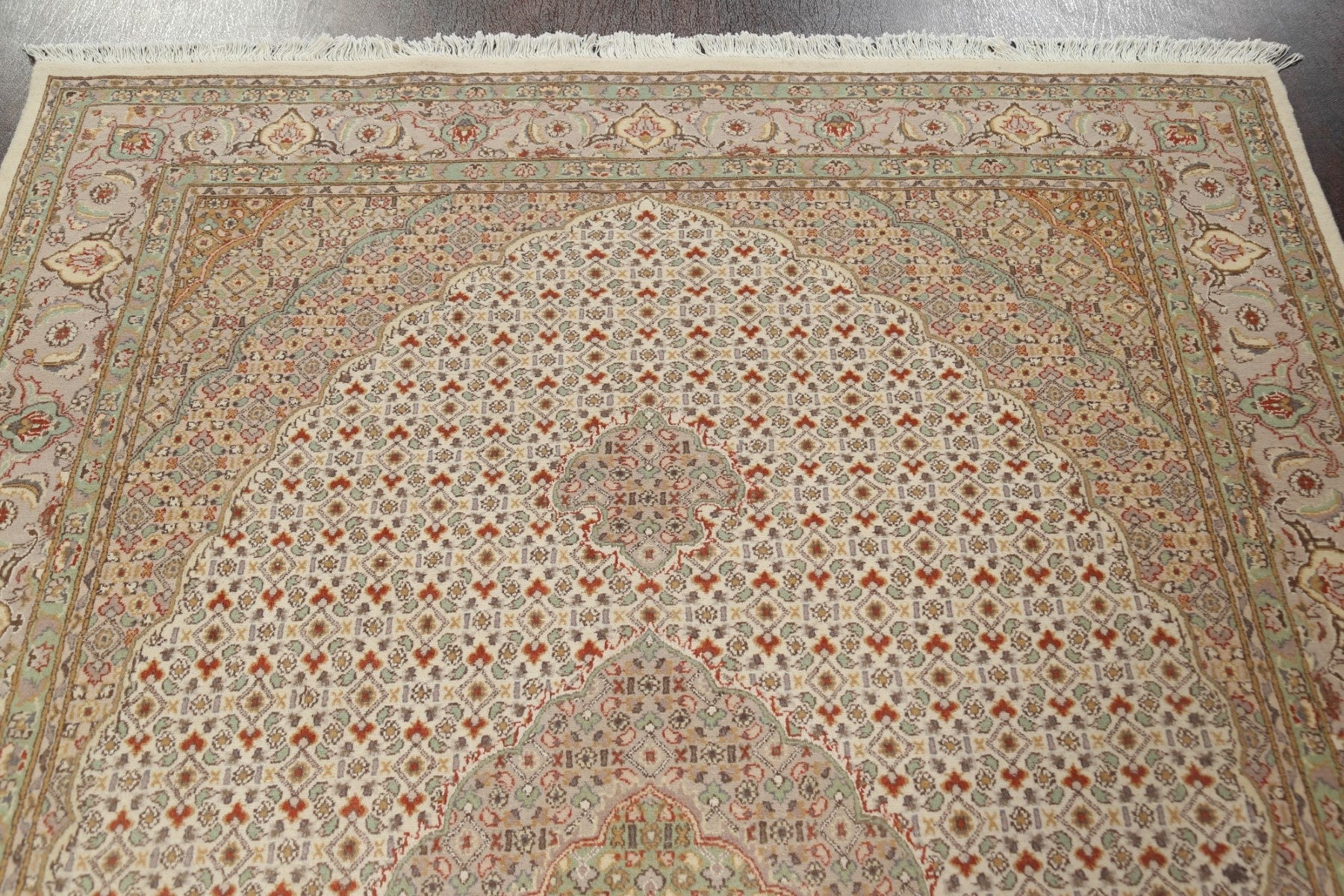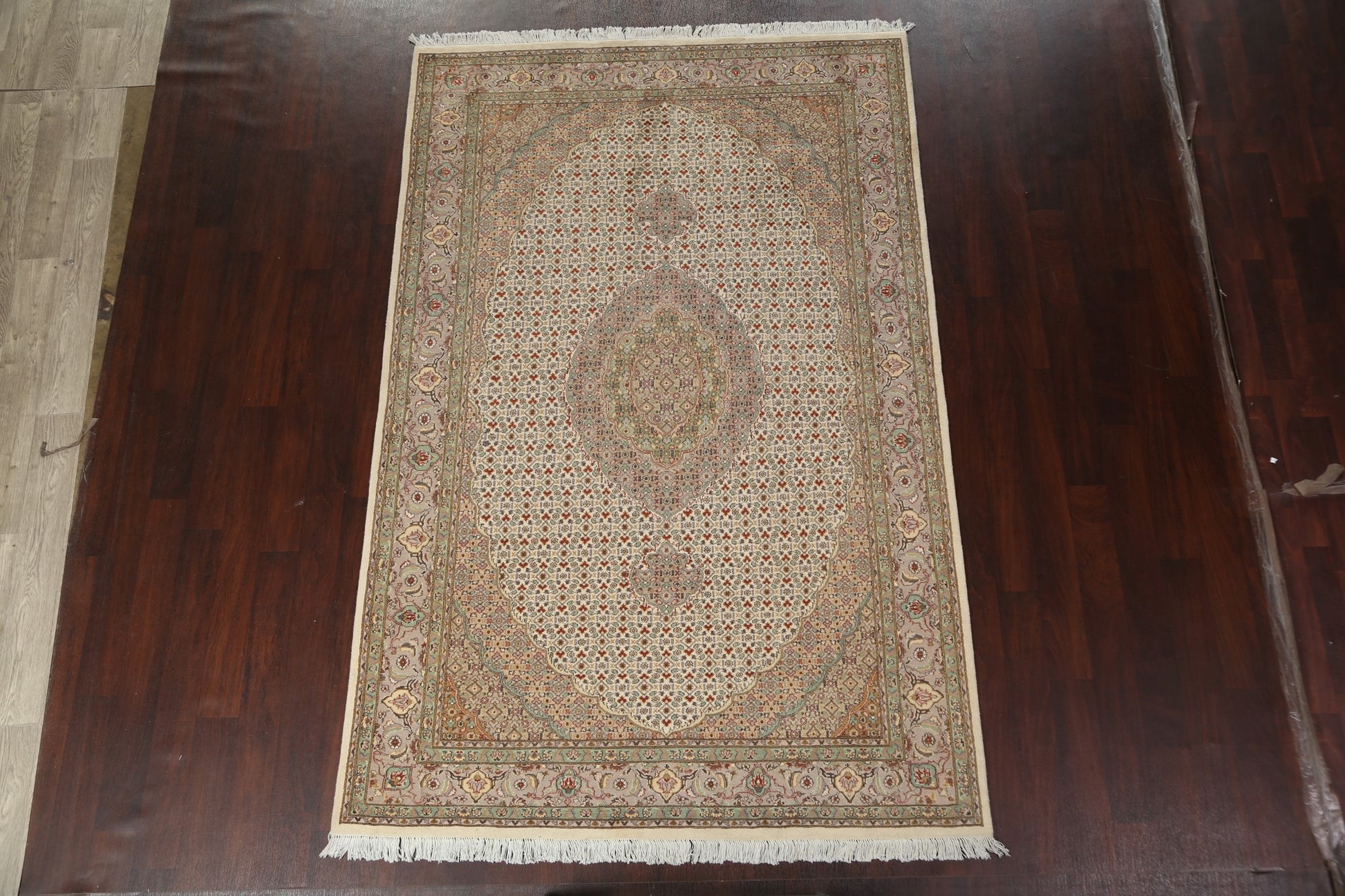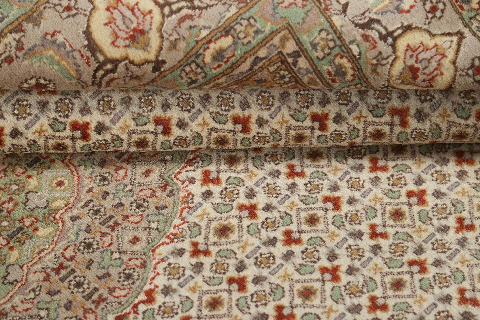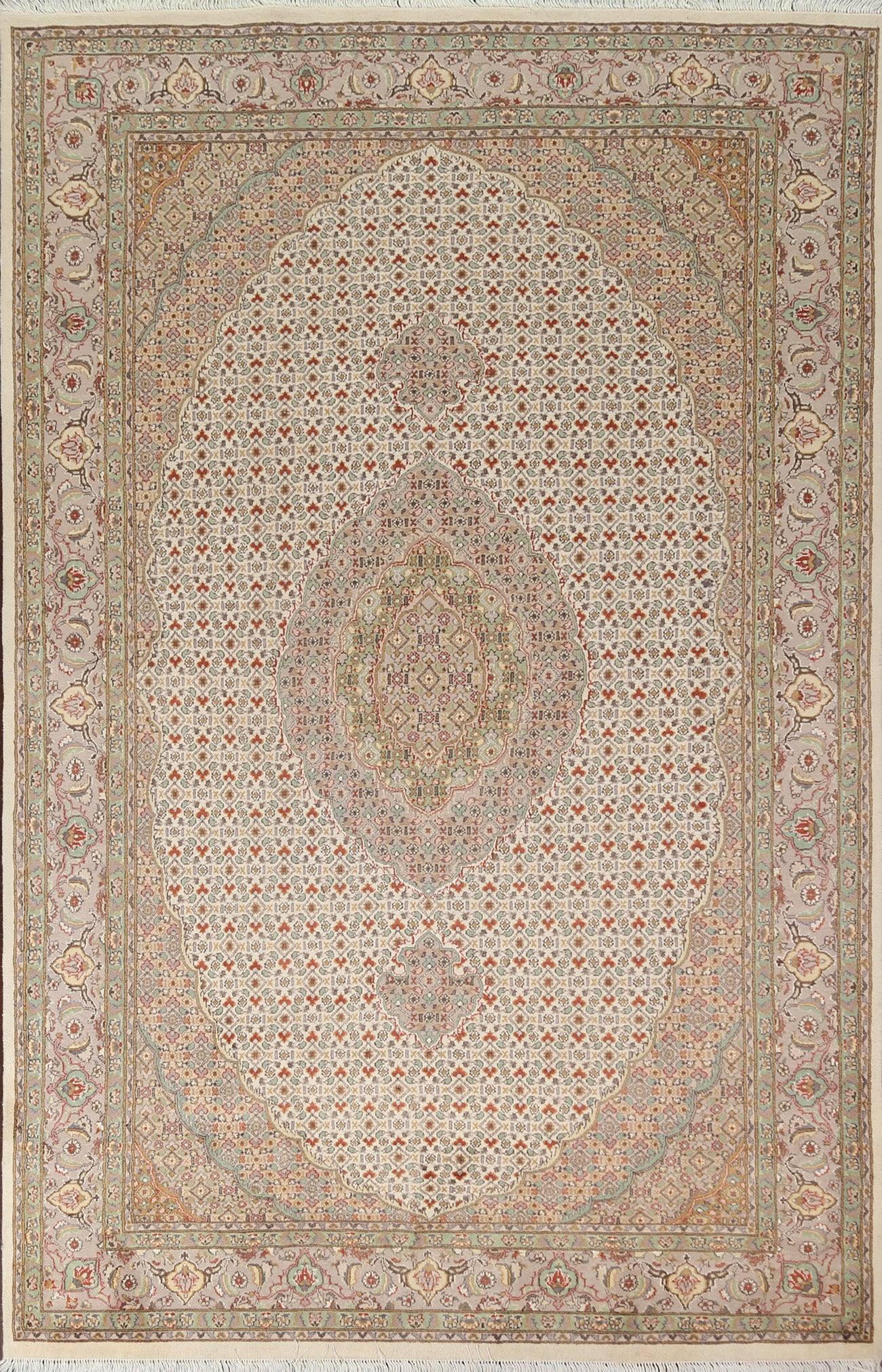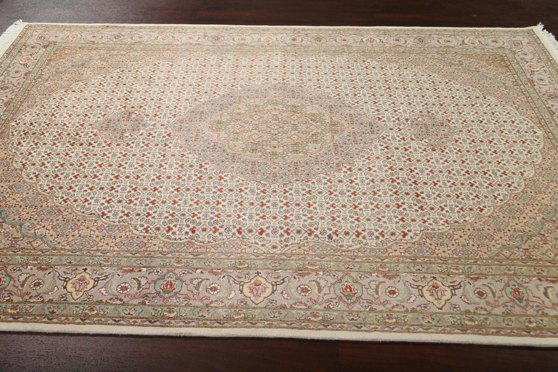A Beautiful Genuine Persia ( Persia ) Tabriz-Mahi rug is Hand Knotted by skillful weavers in Persia ( Persia ) with 100% Wool Material. This rug is in New, First Quality condition. dimensions are 9' 3'' X 5' 11'' in foot and 282 X 180 in centimeter. the primary color is Beige & Ivories.