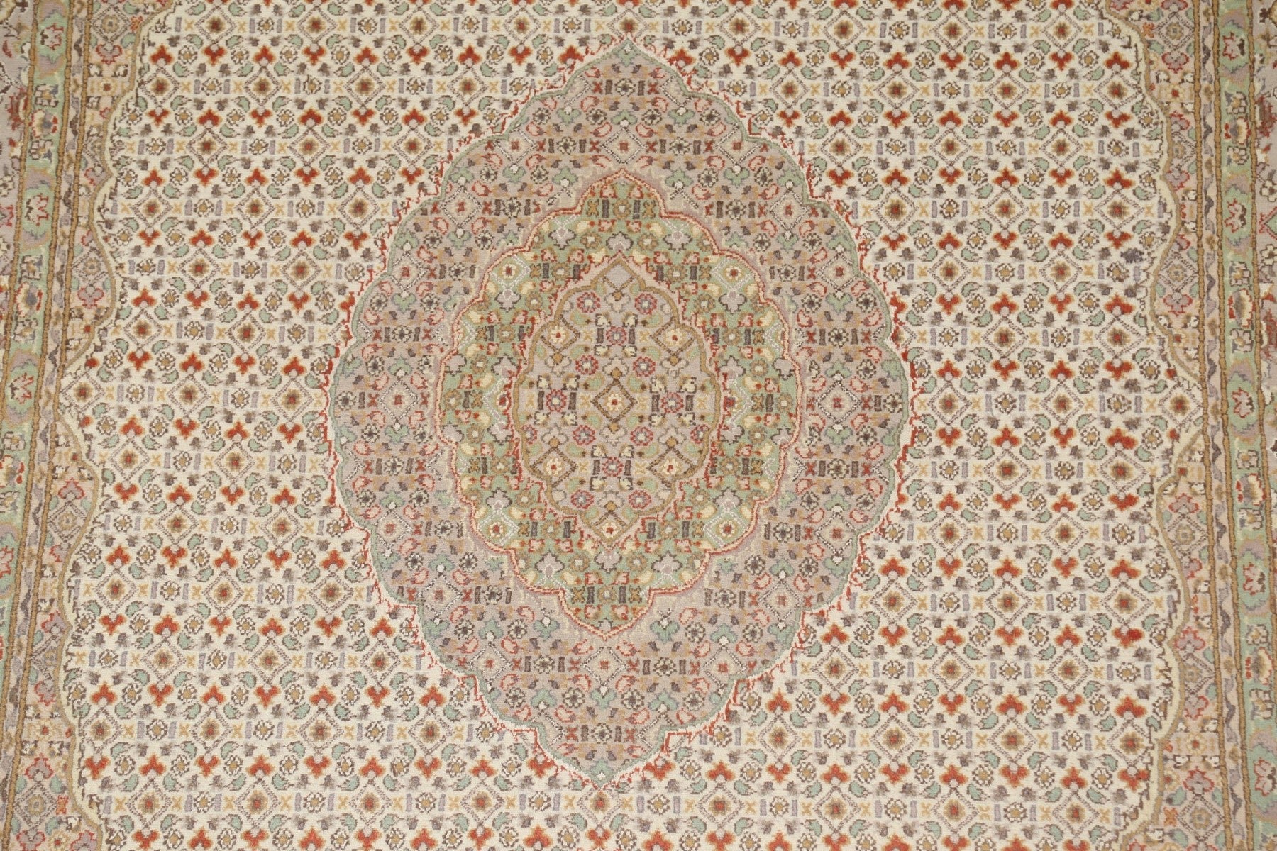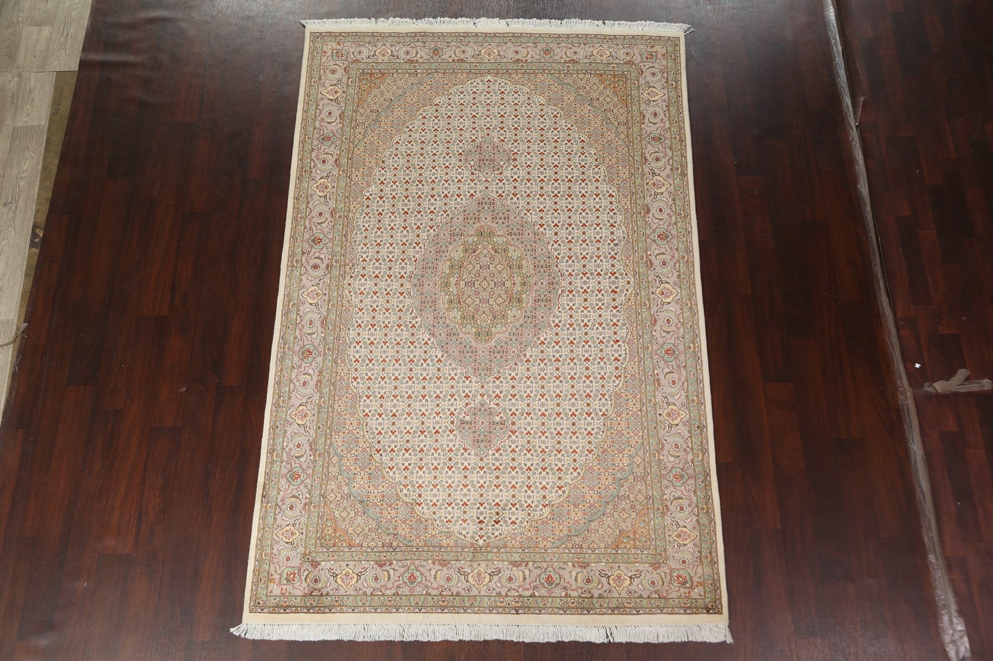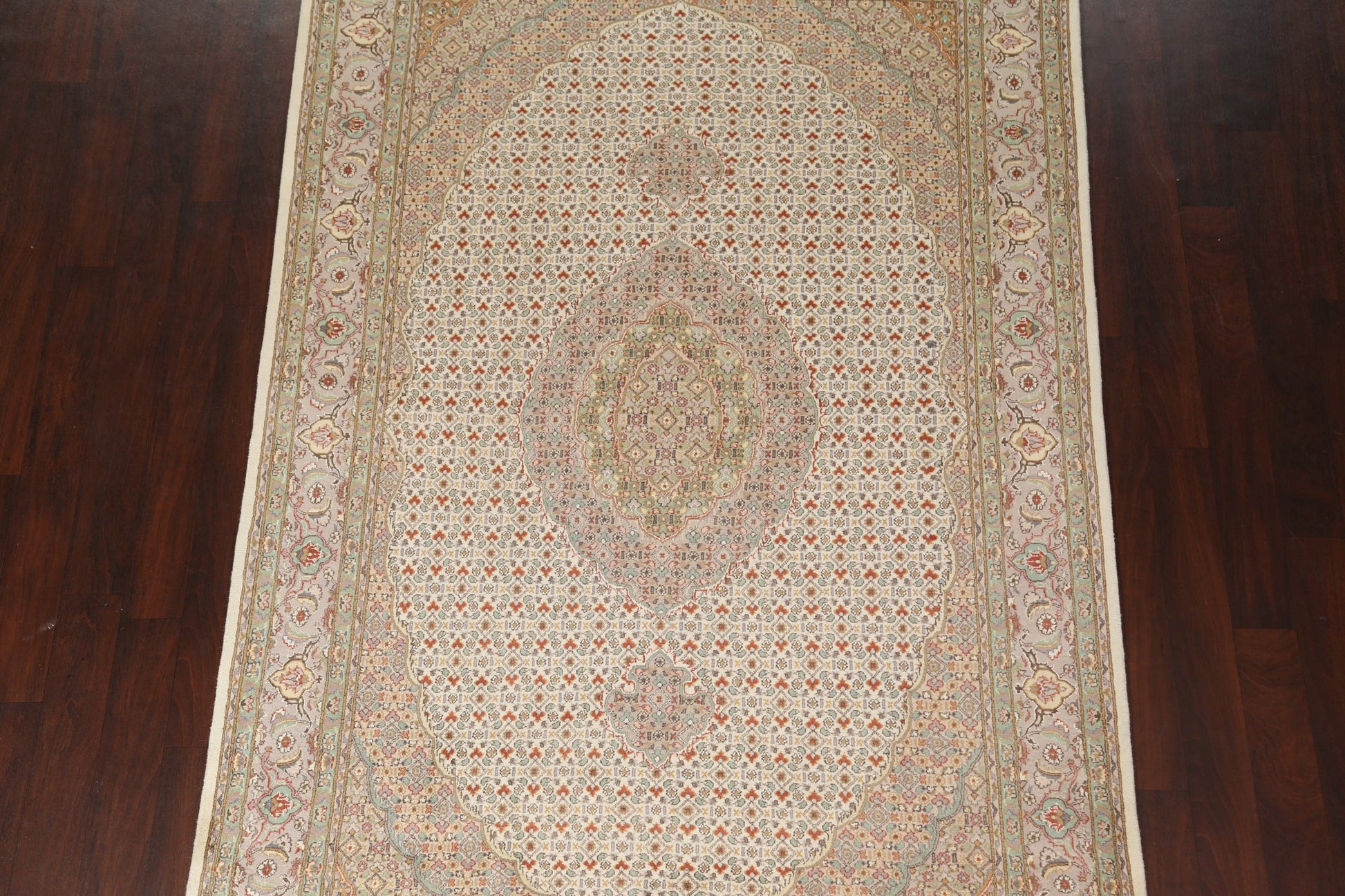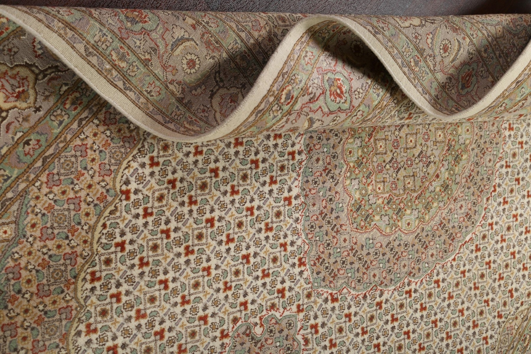 A Beautiful Genuine Persia ( Persia ) Tabriz-Mahi rug is Hand Knotted by skillful weavers in Persia ( Persia ) with 100% Wool Material. This rug is in New, First Quality condition. dimensions are 9' 3'' X 5' 11'' in foot and 282 X 180 in centimeter. the primary color is Beige & Ivories.