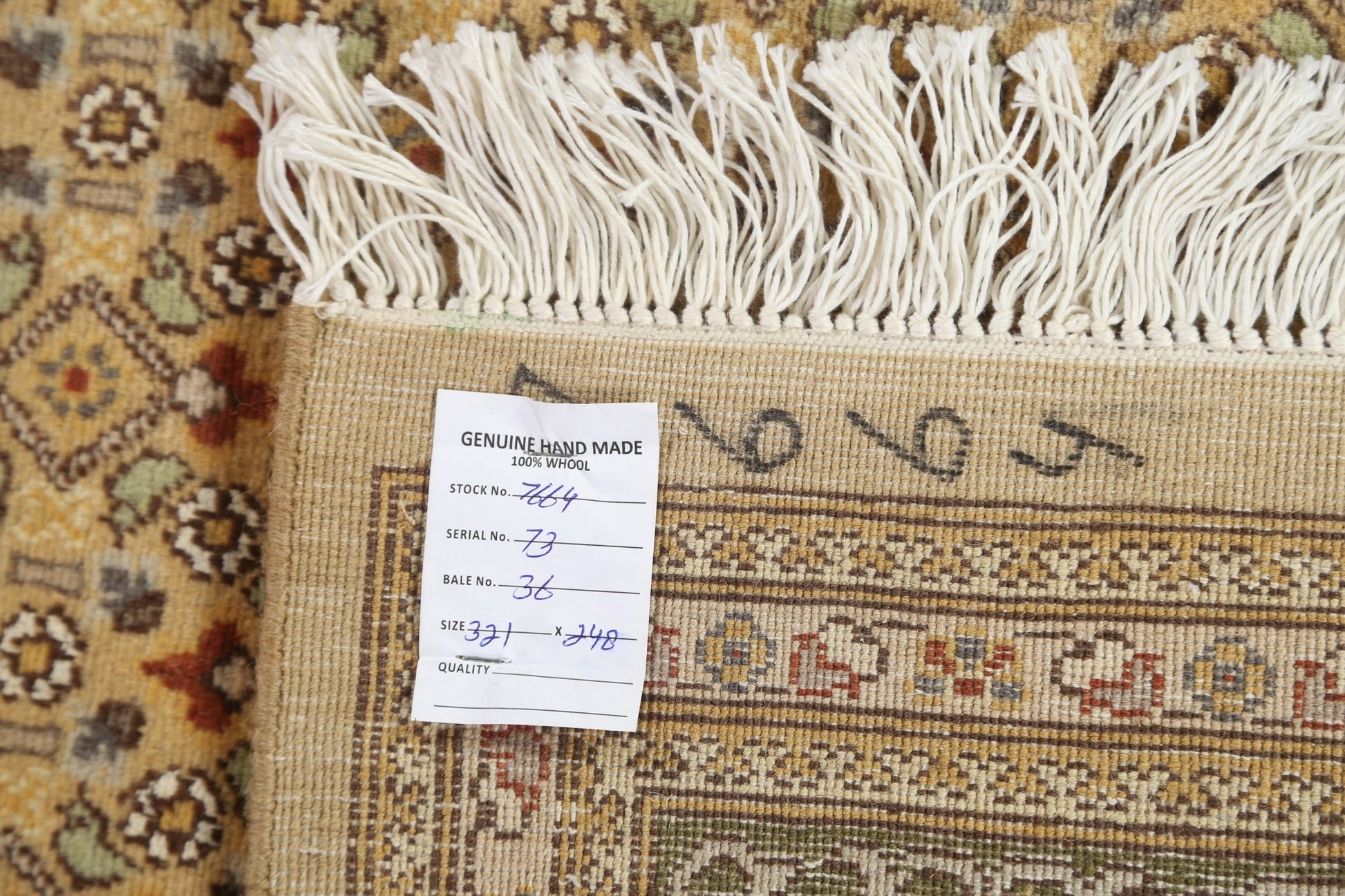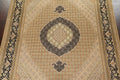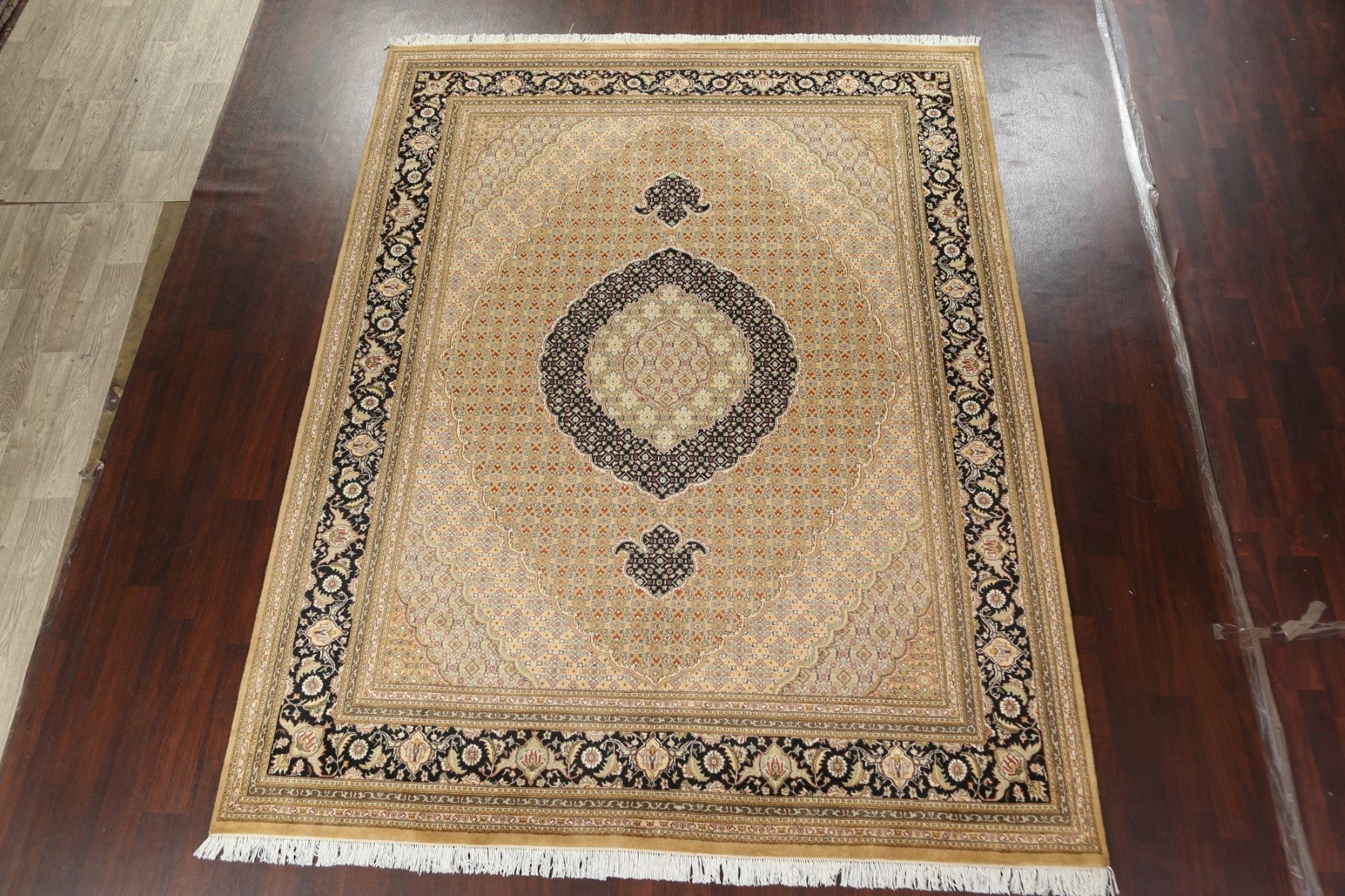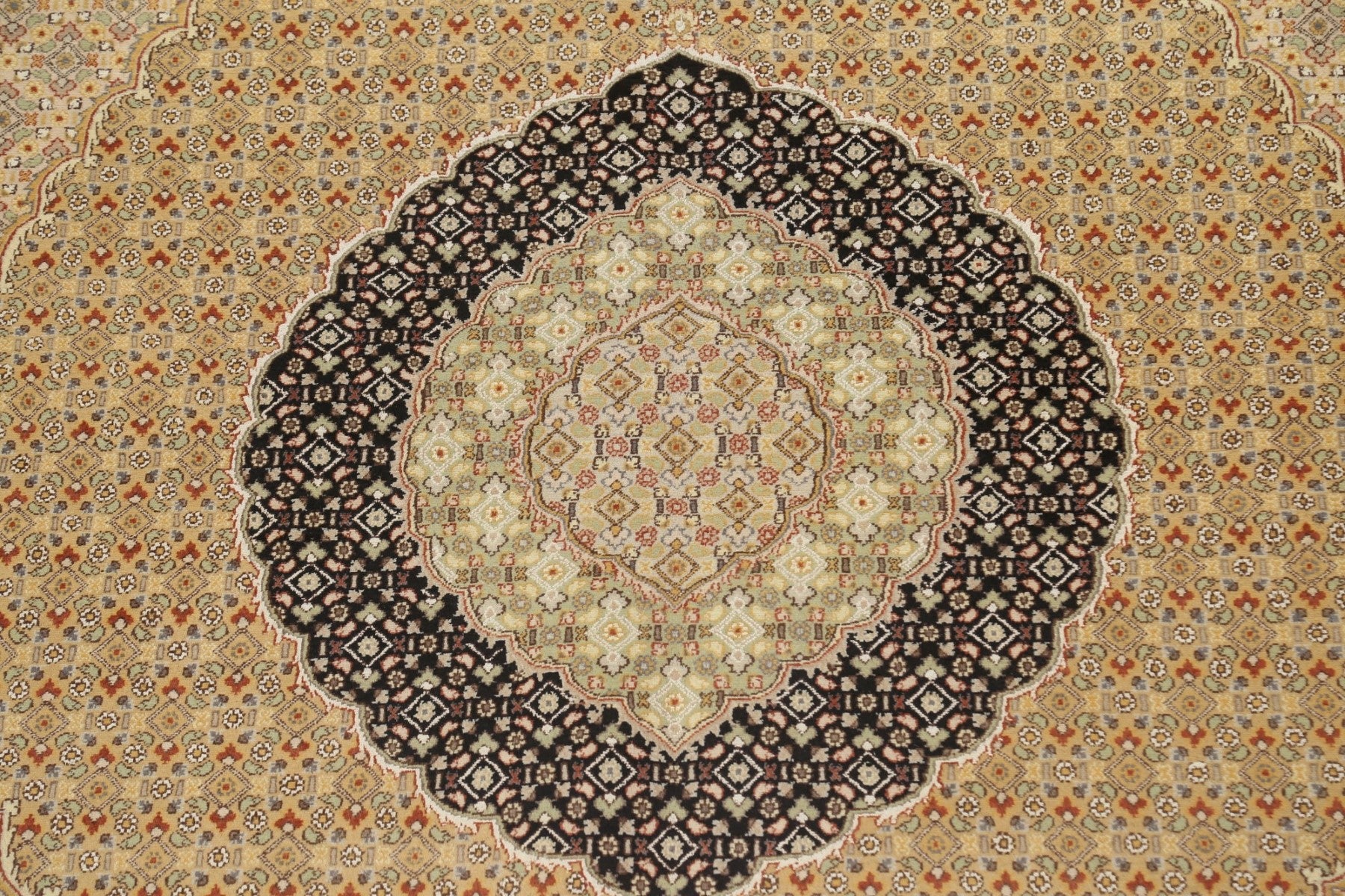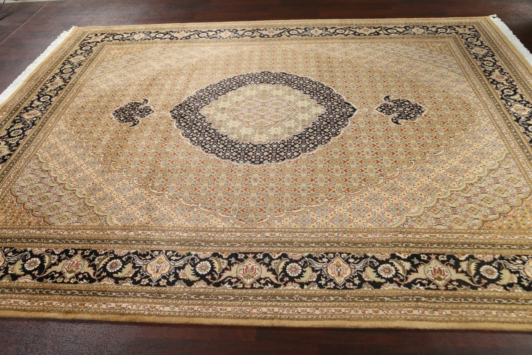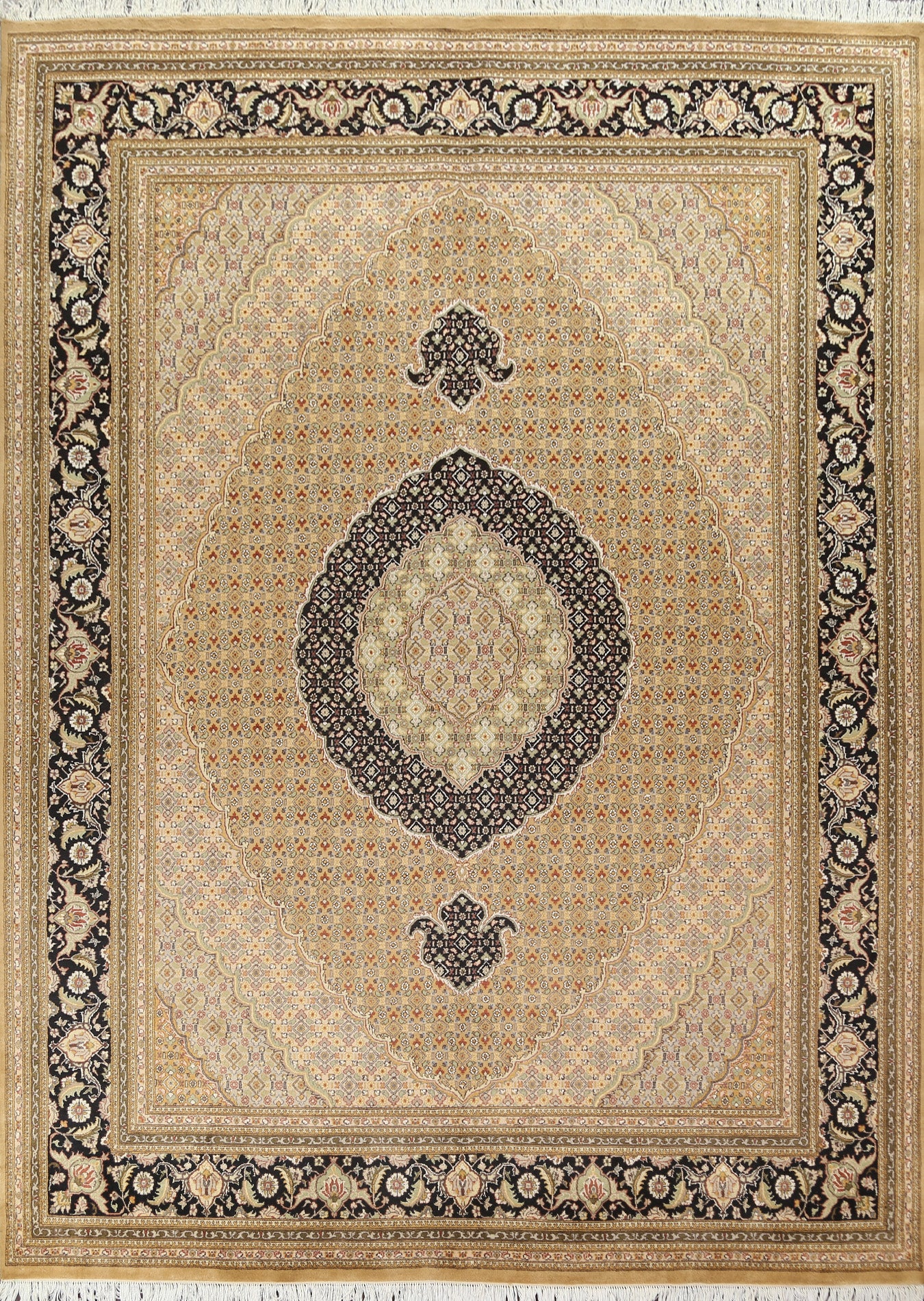 A Beautiful Genuine Persia ( Persia ) Tabriz-Mahi rug is Hand Knotted by skillful weavers in Persia ( Persia ) with Wool & Silk Material. This rug is in New, First Quality condition. dimensions are 10' 7'' X 8' 2'' in foot and 323 X 249 in centimeter. the primary color is Brown.