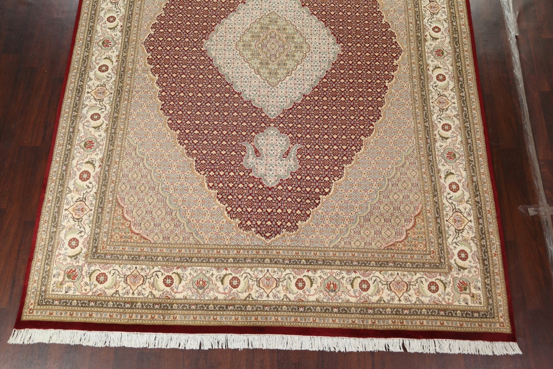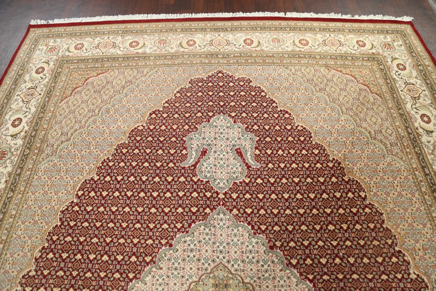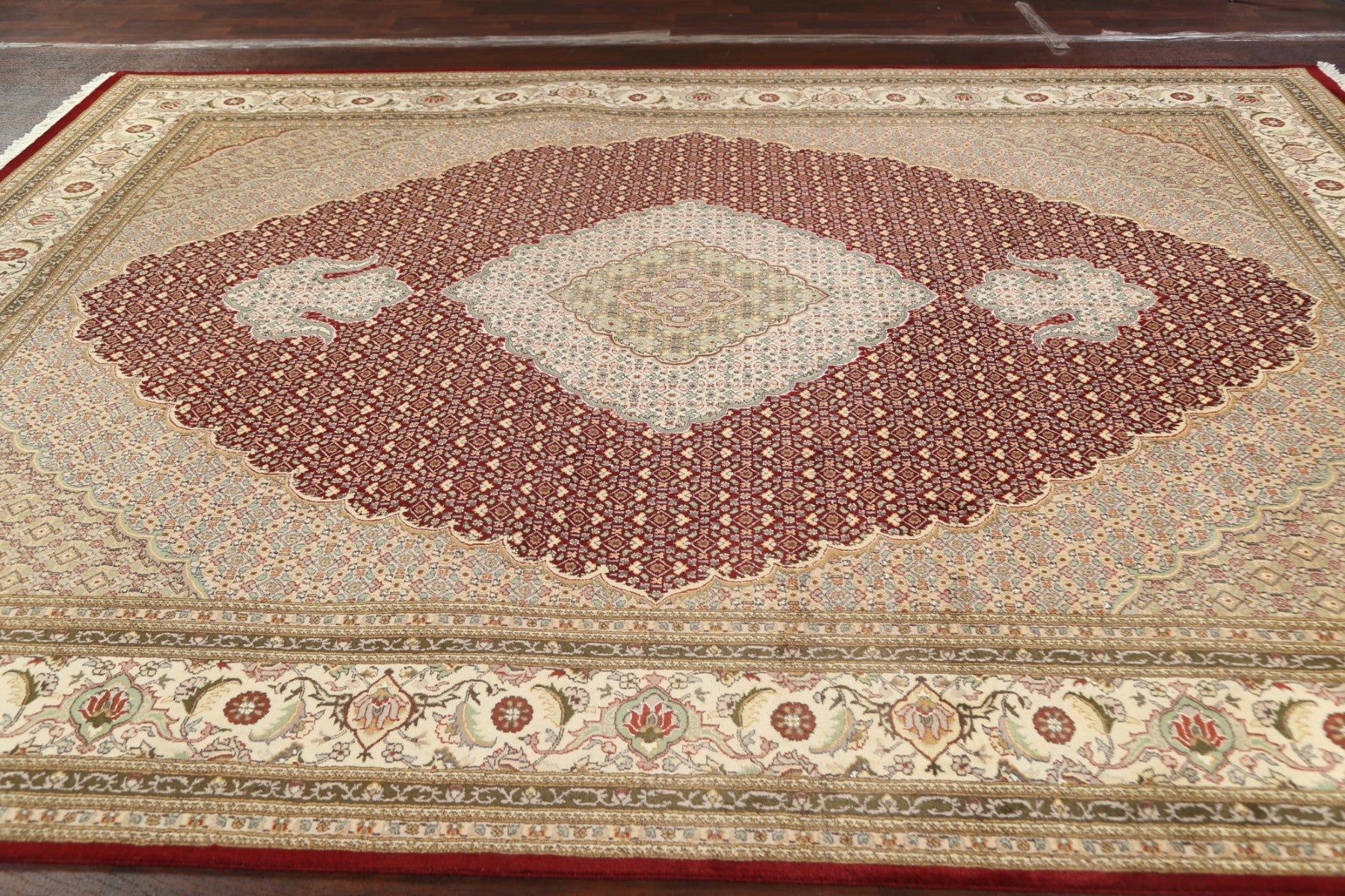 A Beautiful Genuine Persia ( Persia ) Tabriz-Mahi rug is Hand Knotted by skillful weavers in Persia ( Persia ) with Wool & Silk Material. This rug is in New, First Quality condition. dimensions are 12' 5'' X 9' 0'' in foot and 378 X 274 in centimeter. the primary color is Red.