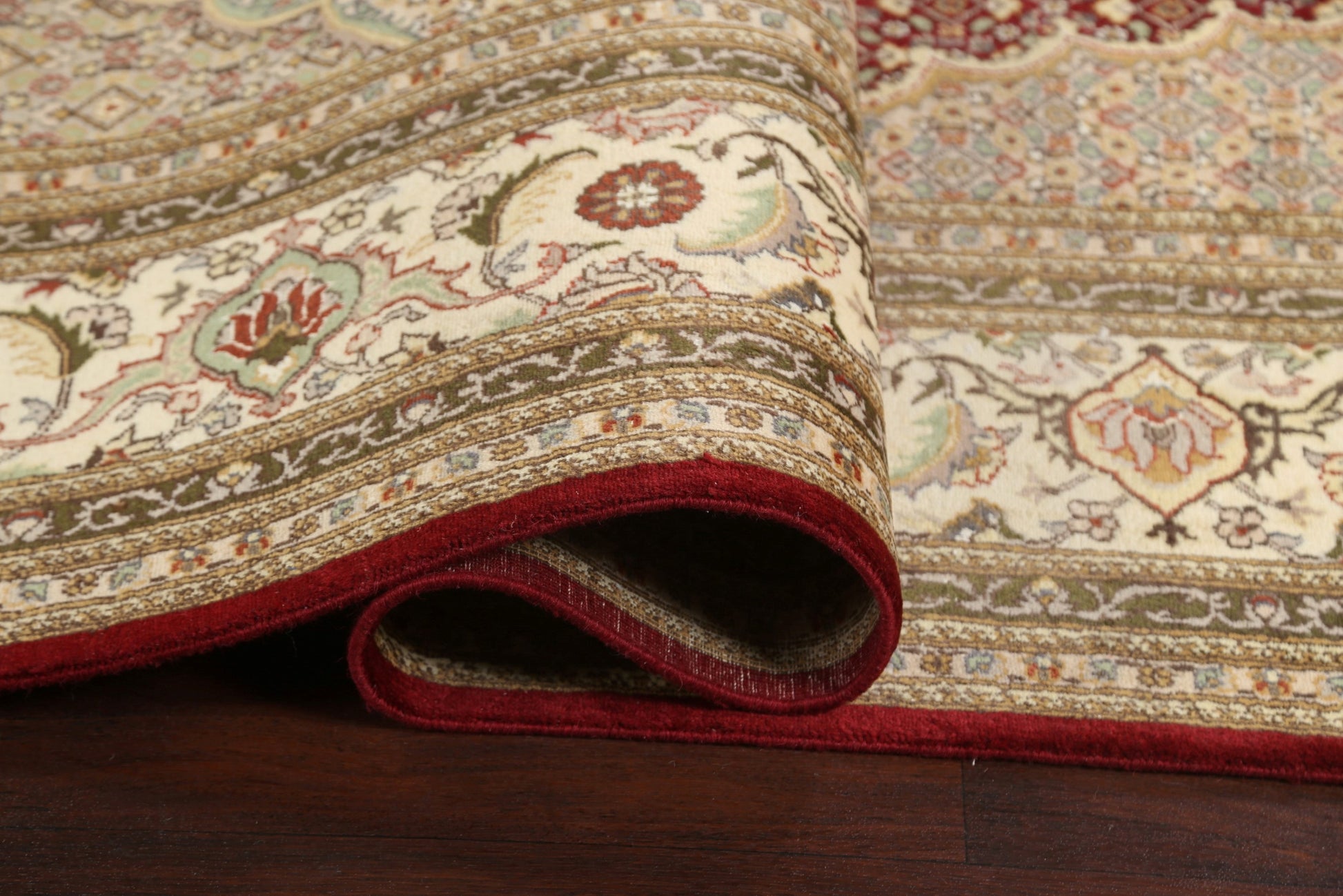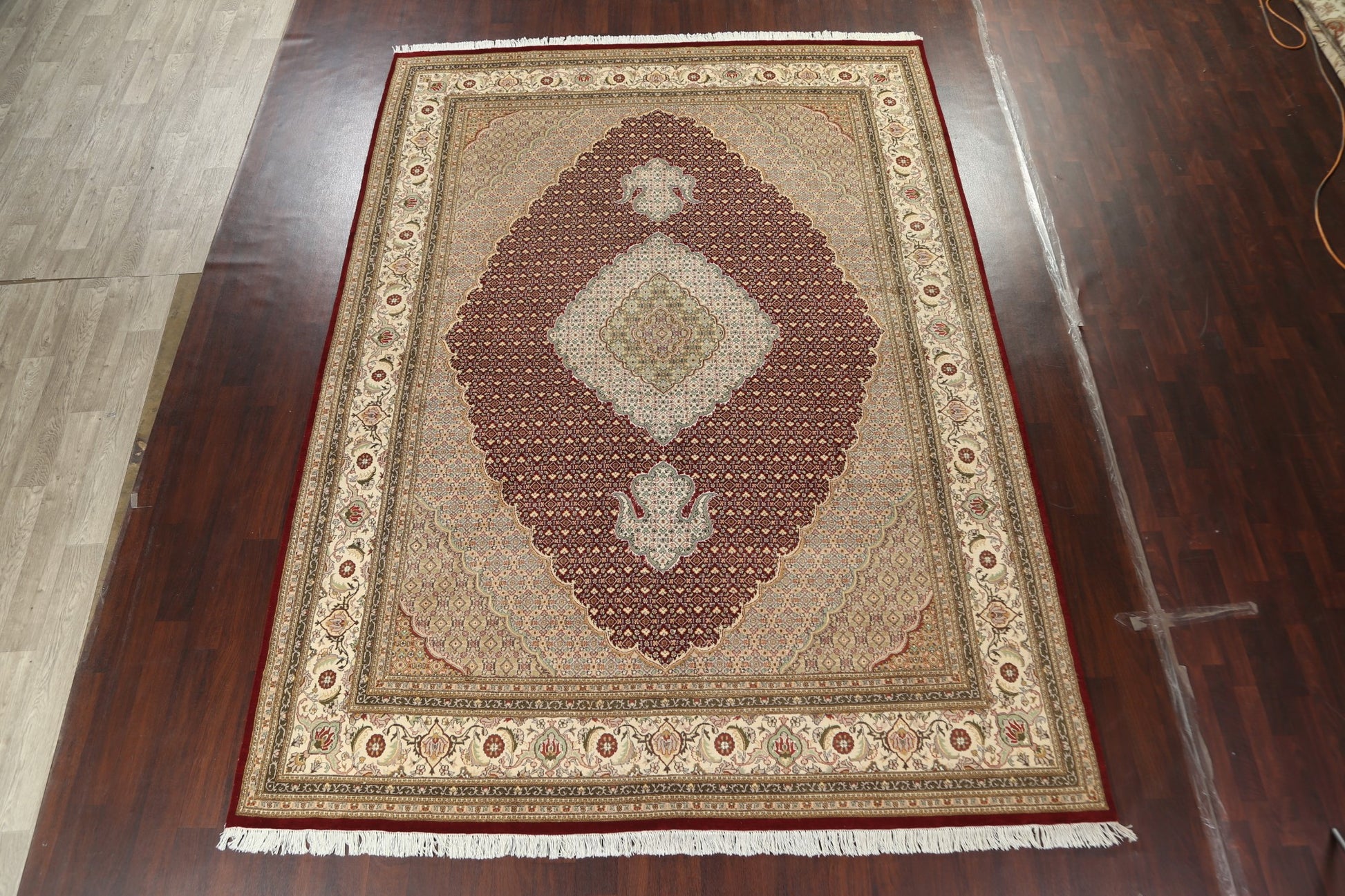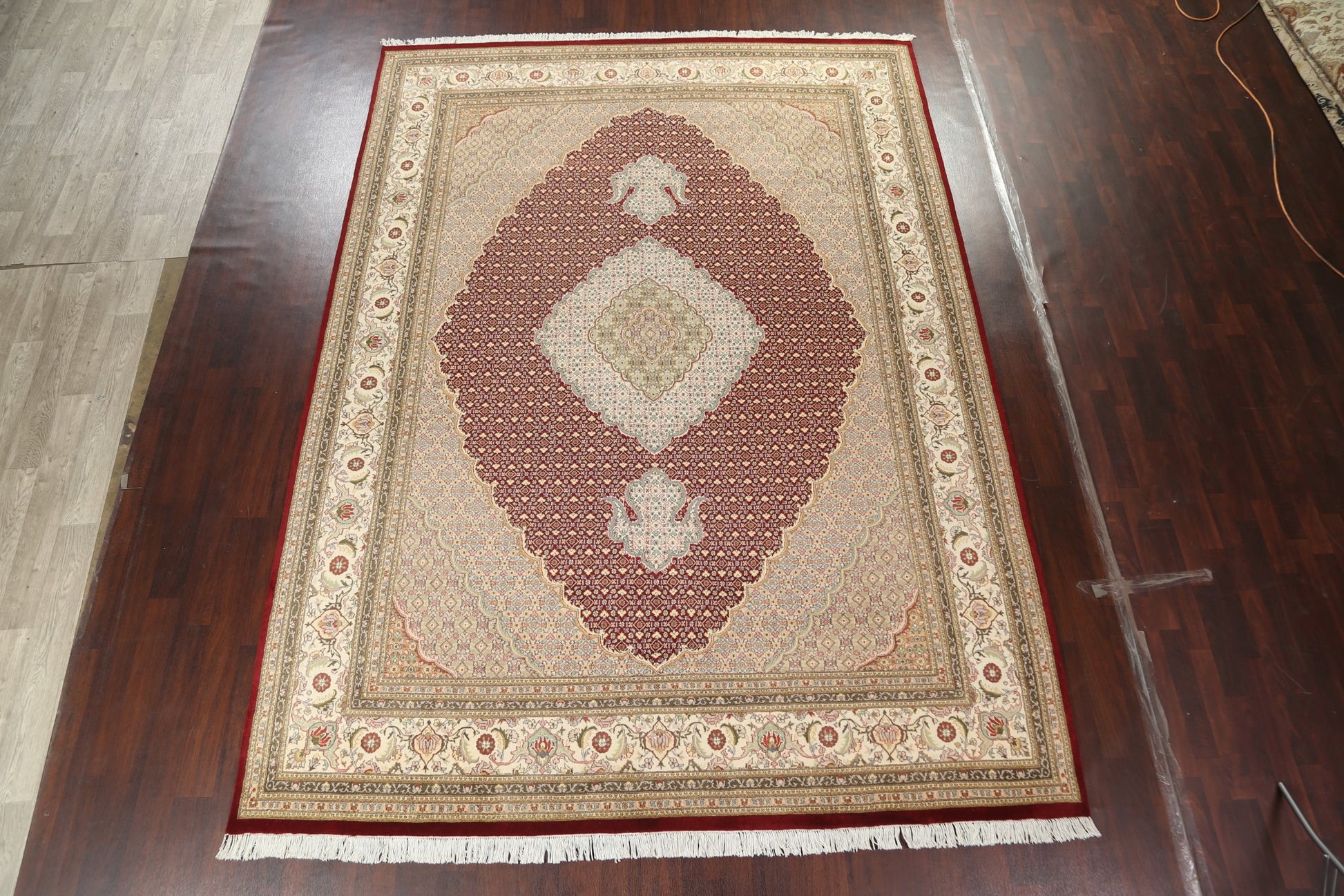 A Beautiful Genuine Persia ( Persia ) Tabriz-Mahi rug is Hand Knotted by skillful weavers in Persia ( Persia ) with Wool & Silk Material. This rug is in New, First Quality condition. dimensions are 12' 5'' X 9' 0'' in foot and 378 X 274 in centimeter. the primary color is Red.