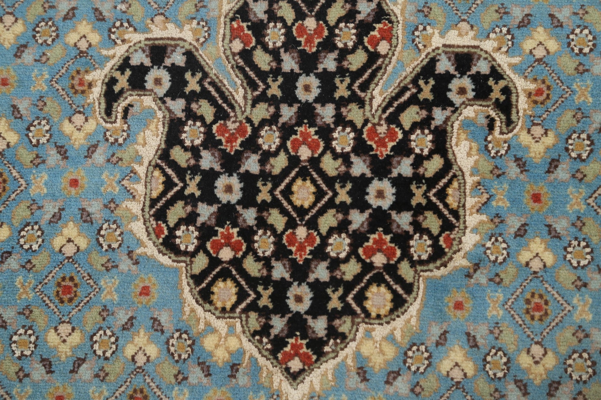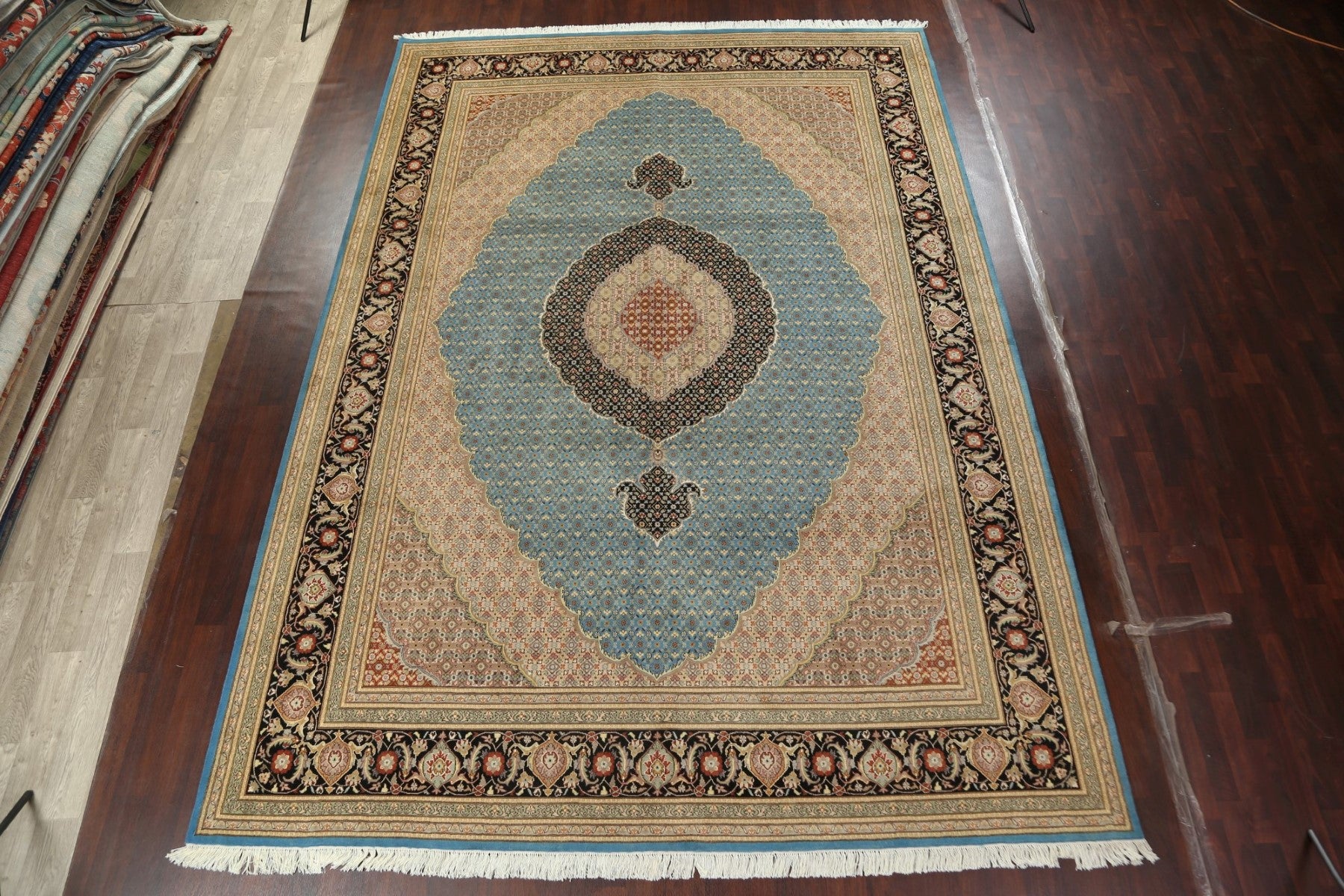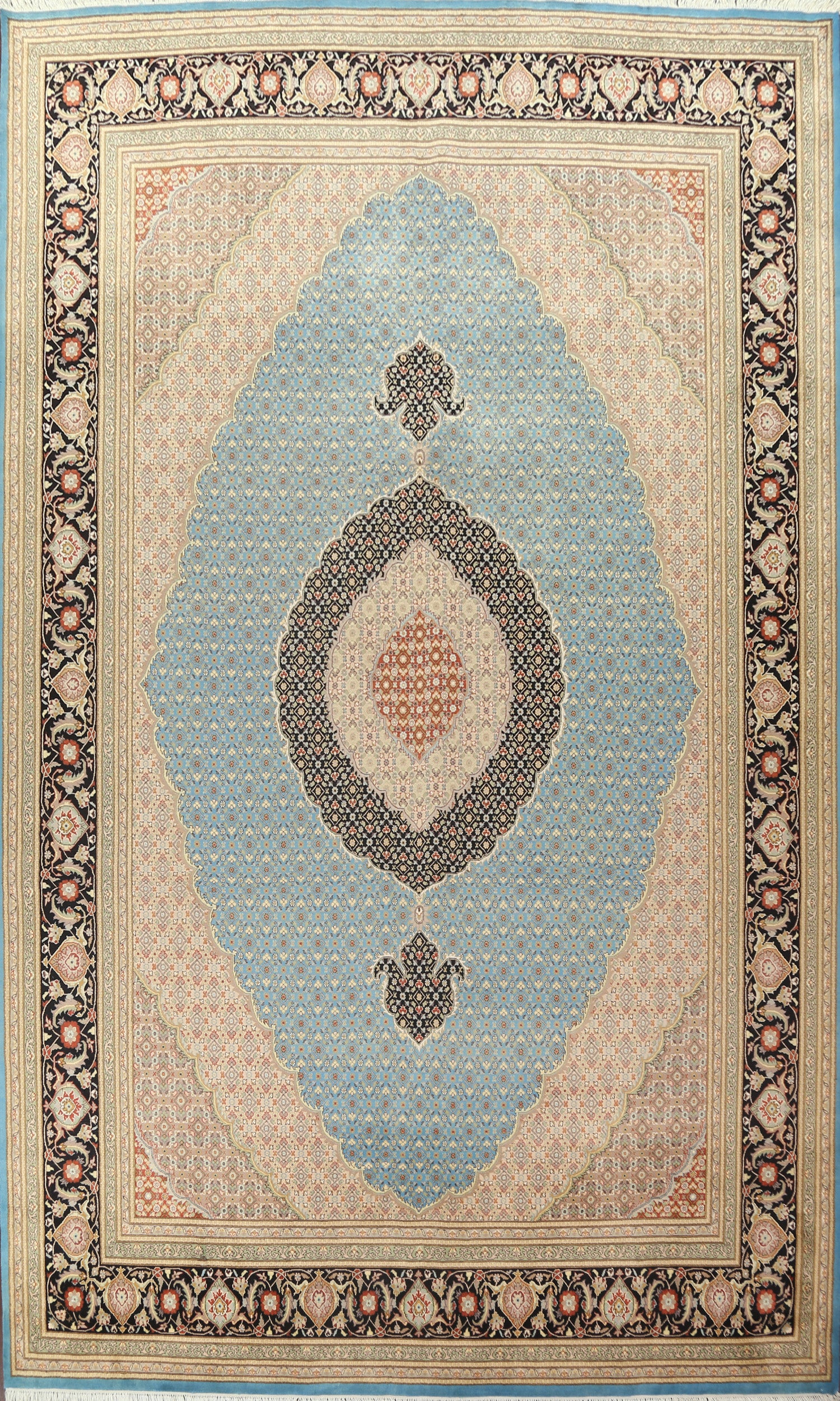 A Beautiful Genuine Persia ( Persia ) Tabriz-Mahi rug is Hand Knotted by skillful weavers in Persia ( Persia ) with Wool & Silk Material. This rug is in New, First Quality condition. dimensions are 14' 7'' X 10' 3'' in foot and 445 X 312 in centimeter. the primary color is Navy Blue & Blues.