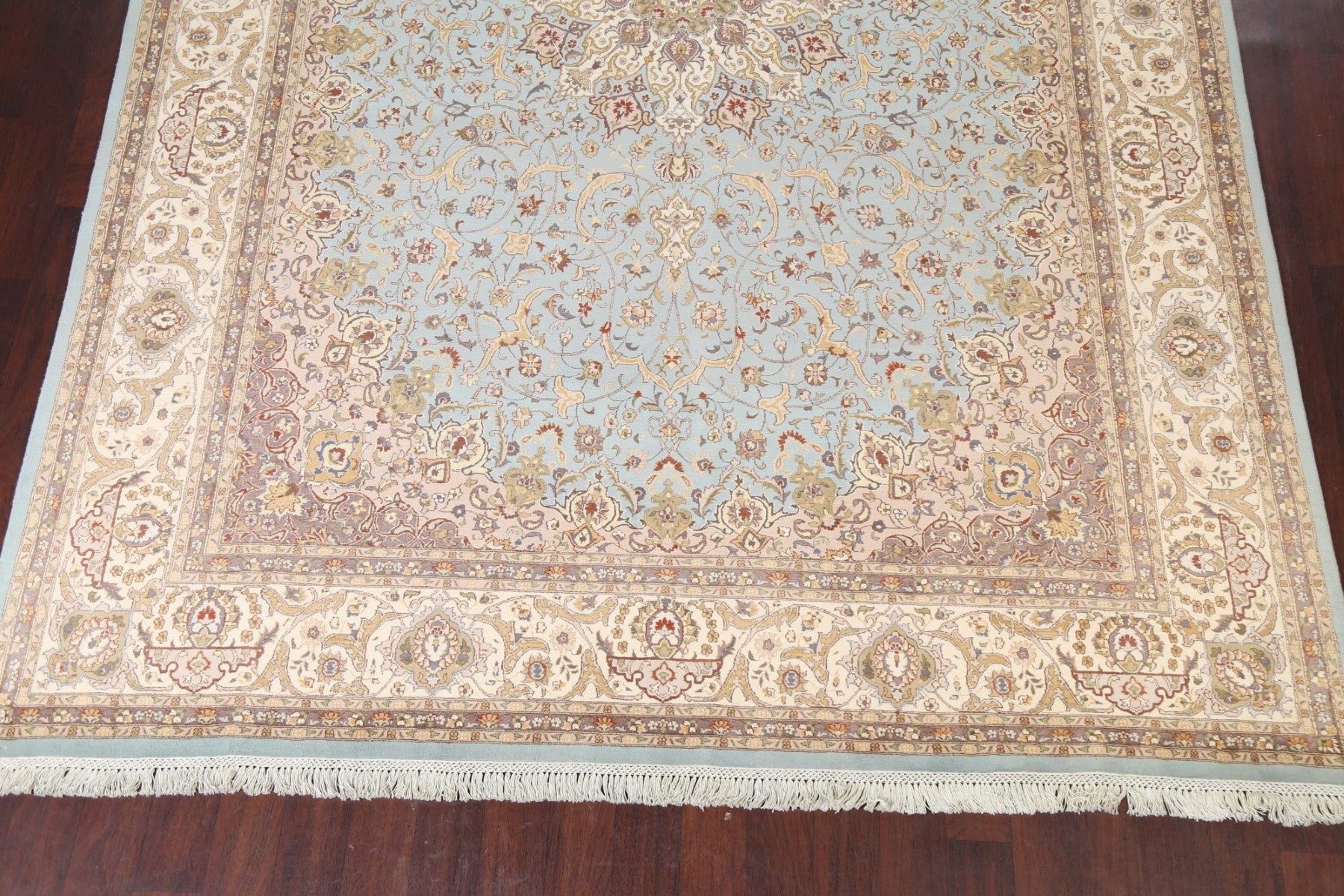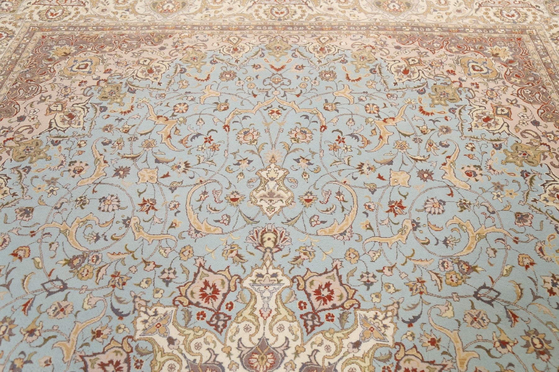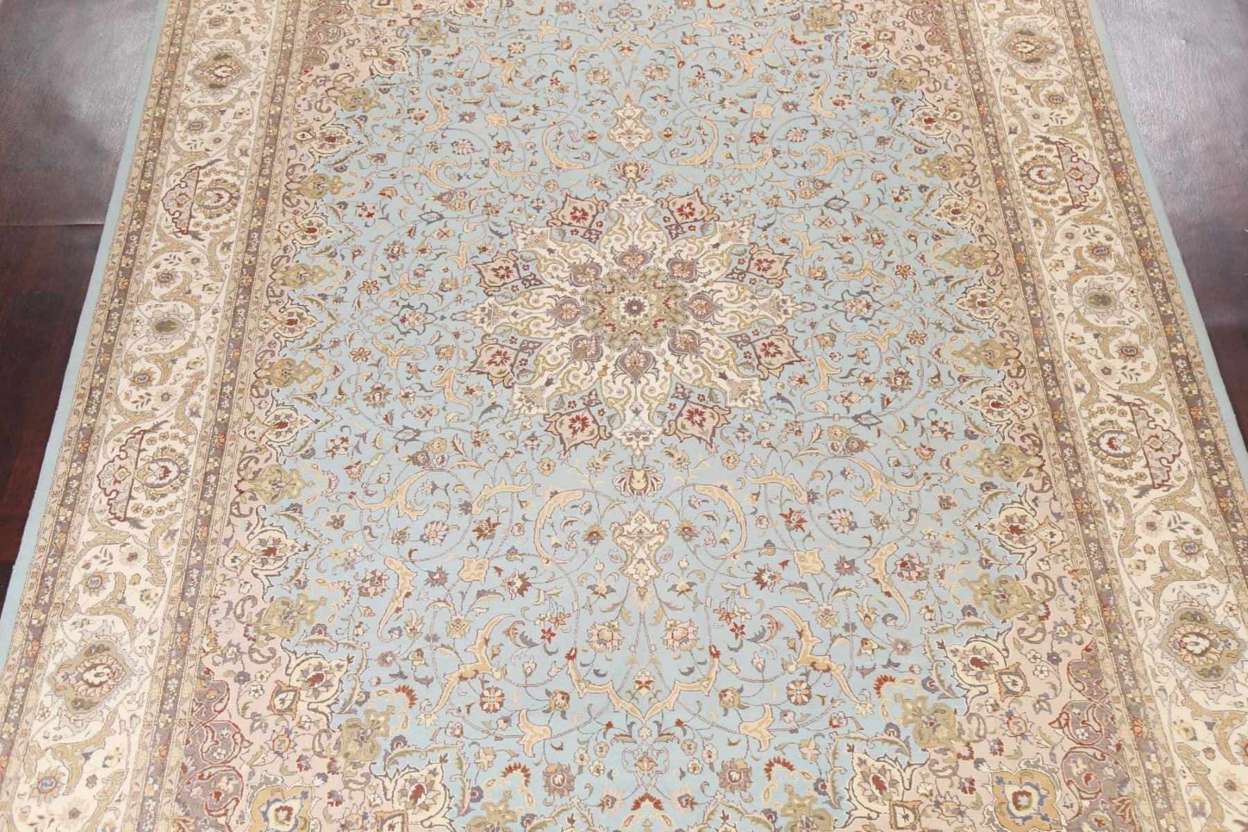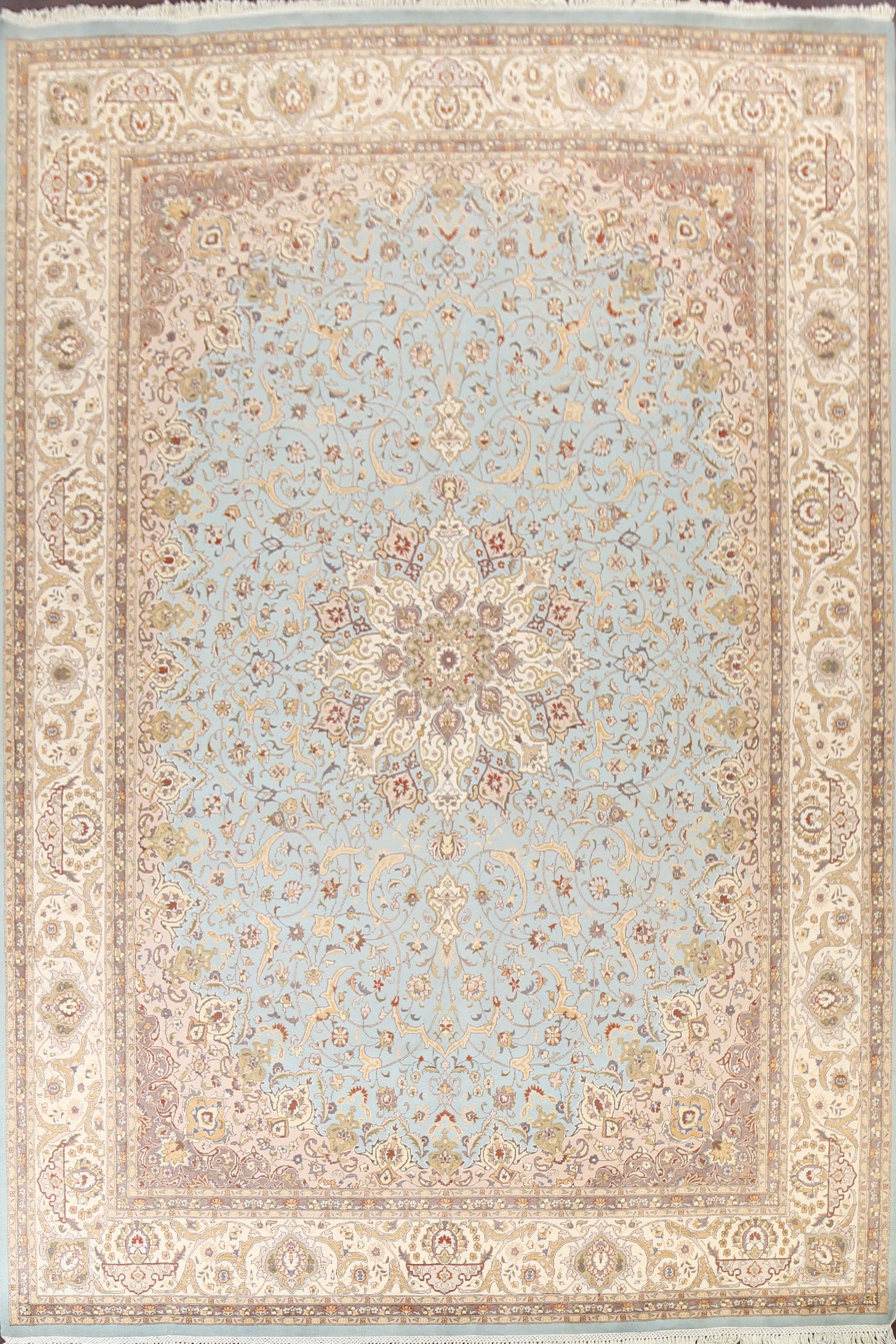 A Beautiful Genuine Pakistan Tabriz rug is Hand Knotted by skillful weavers in Pakistan with 100% Wool Material. This rug is in New, First Quality condition. dimensions are 12' 8'' X 9' 0'' in foot and 386 X 274 in centimeter. the primary color is Navy Blue & Blues.