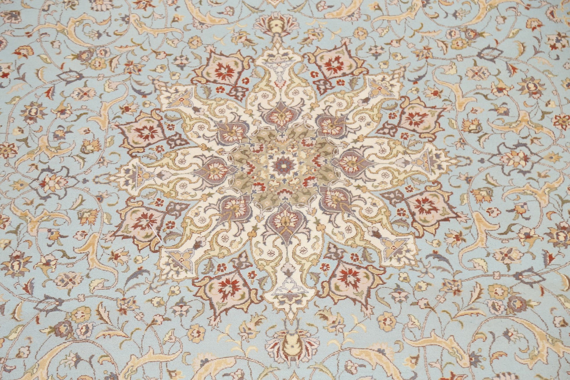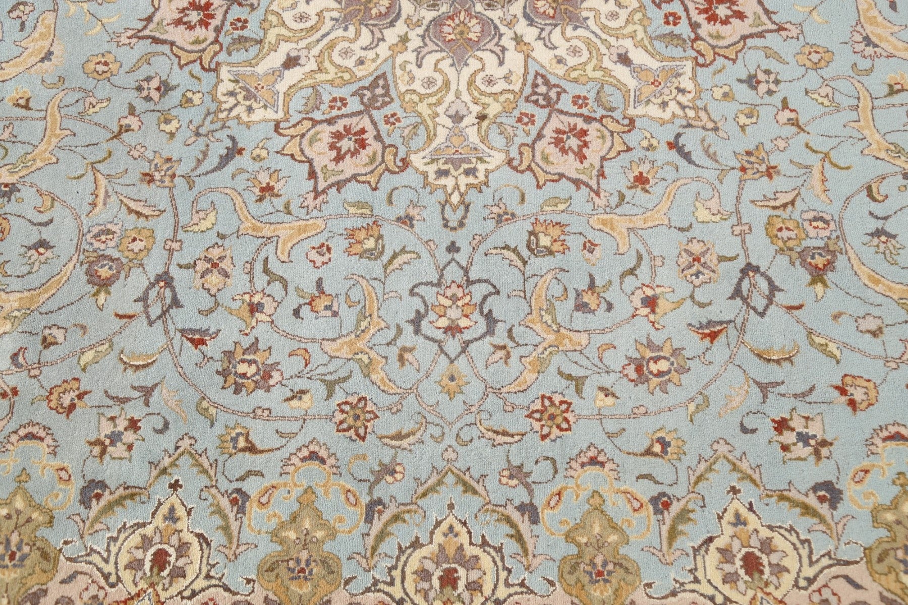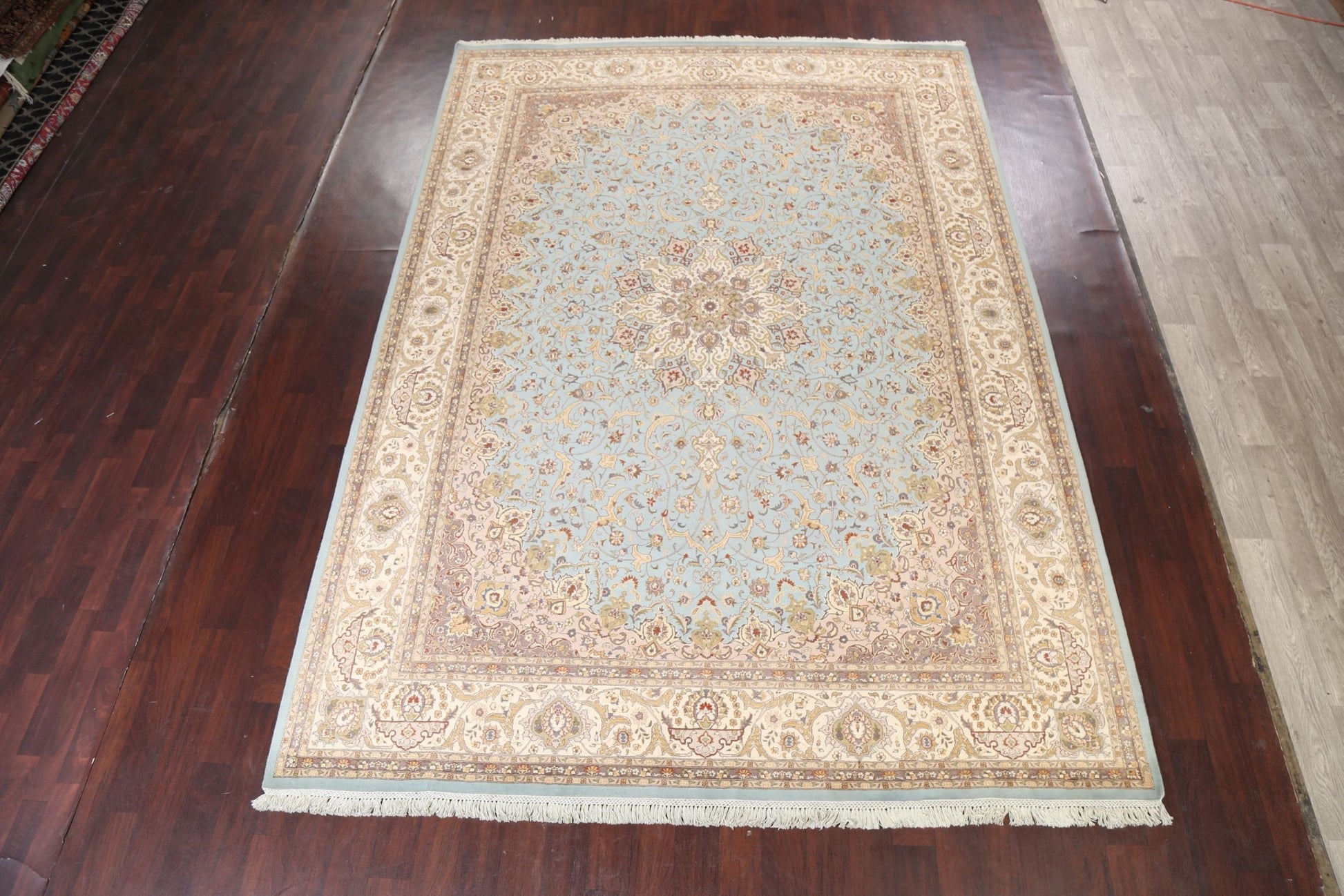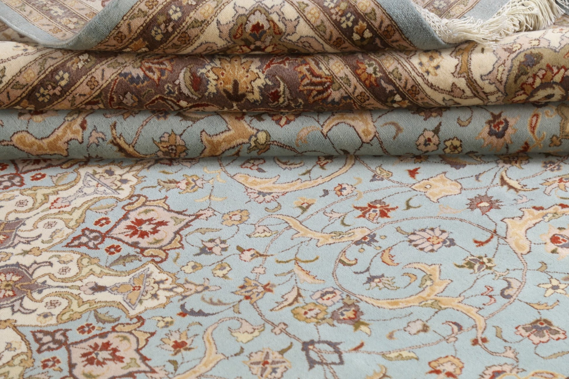 A Beautiful Genuine Pakistan Tabriz rug is Hand Knotted by skillful weavers in Pakistan with 100% Wool Material. This rug is in New, First Quality condition. dimensions are 12' 8'' X 9' 0'' in foot and 386 X 274 in centimeter. the primary color is Navy Blue & Blues.