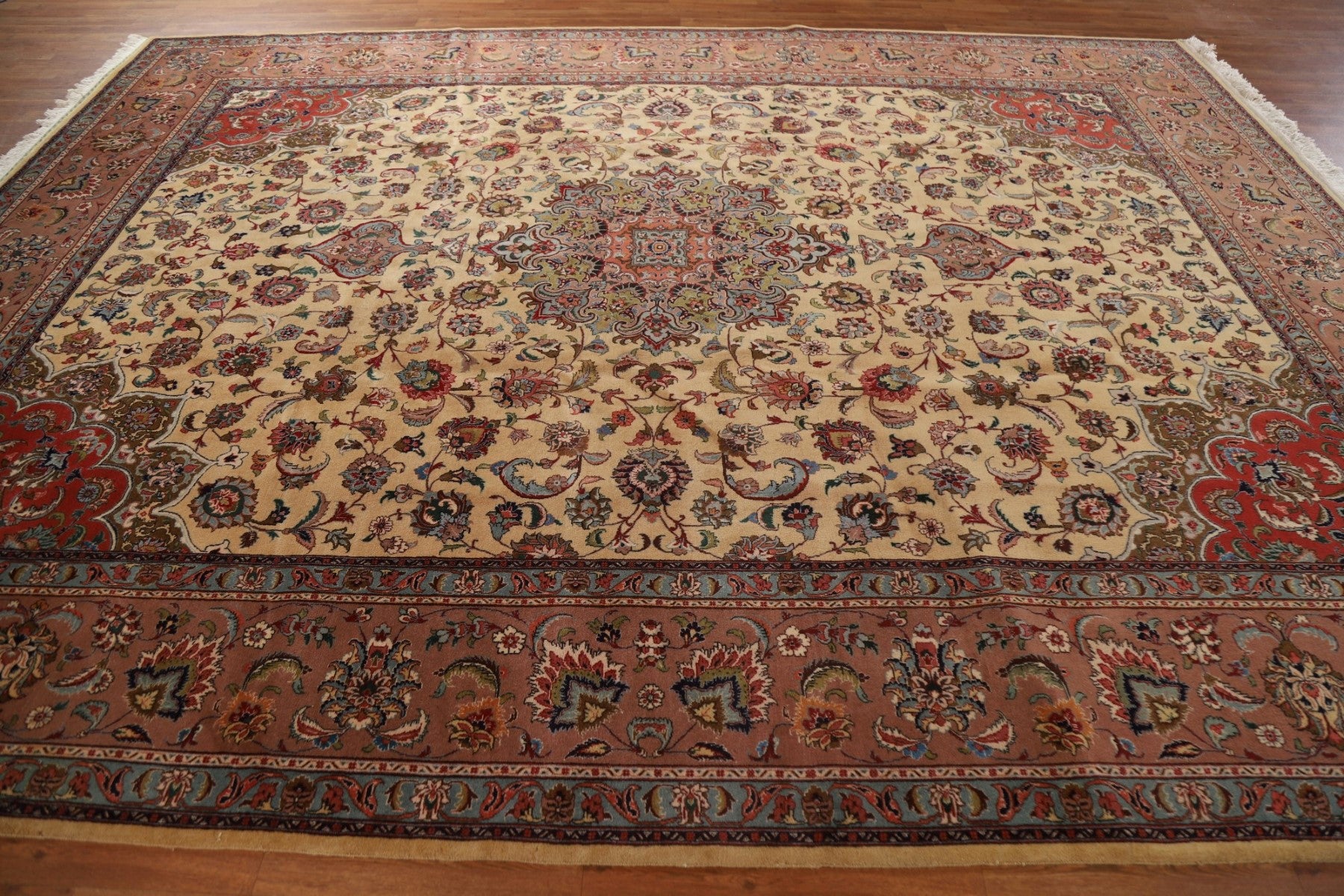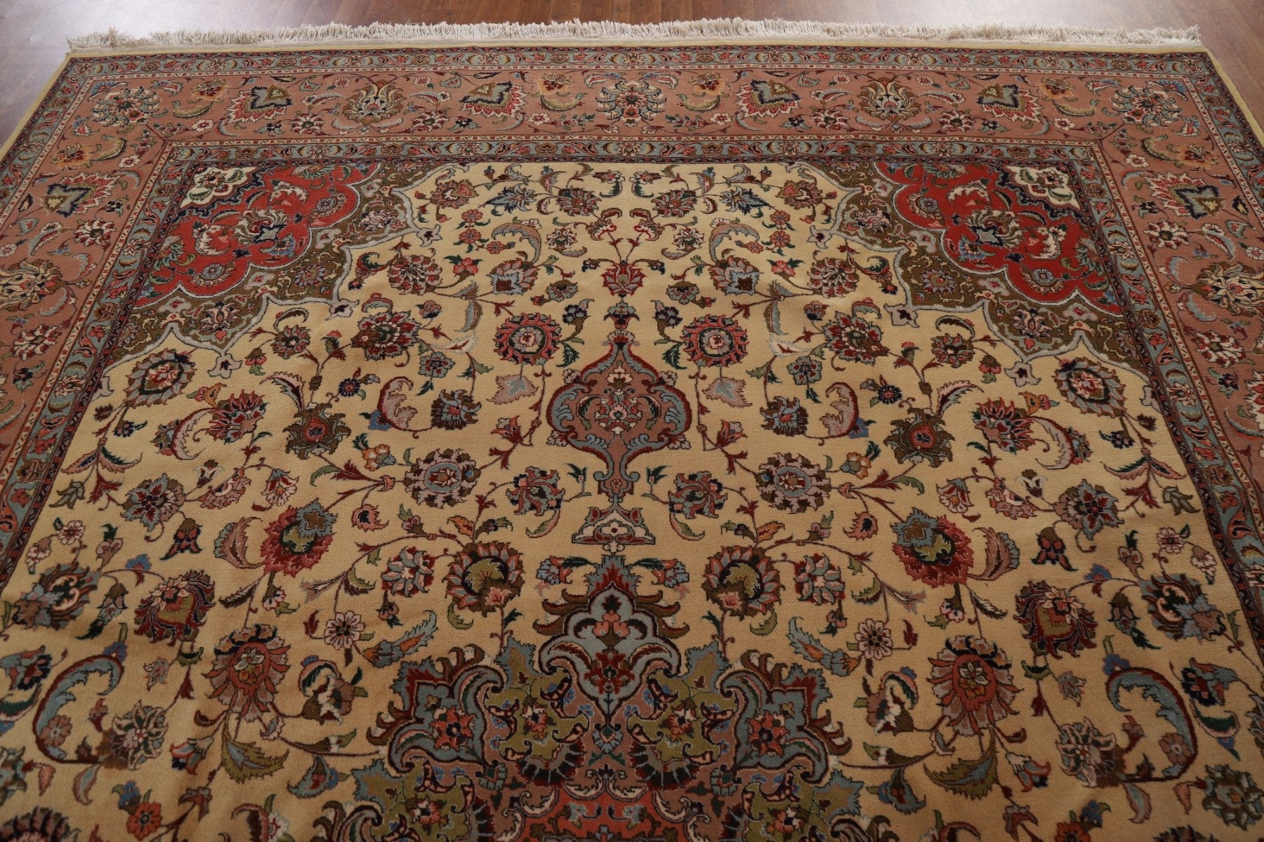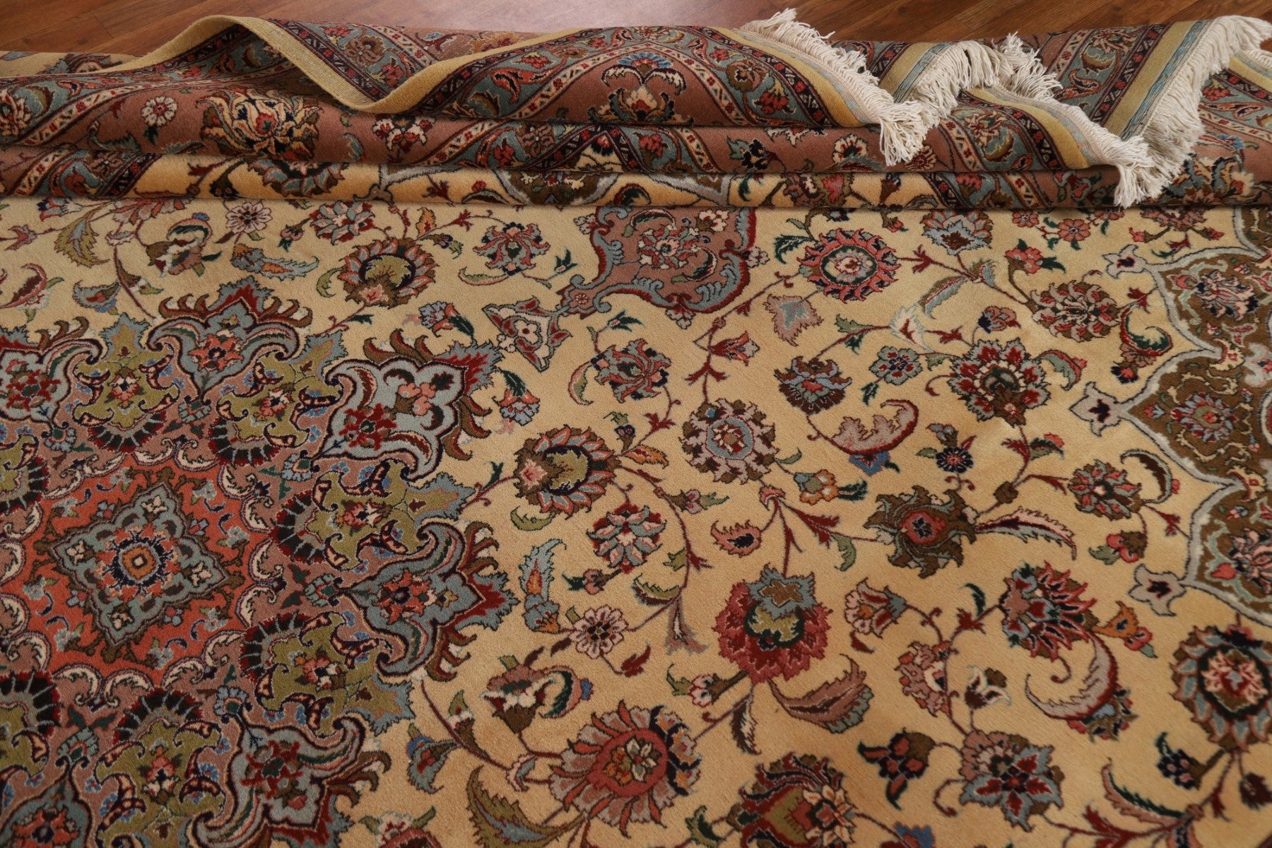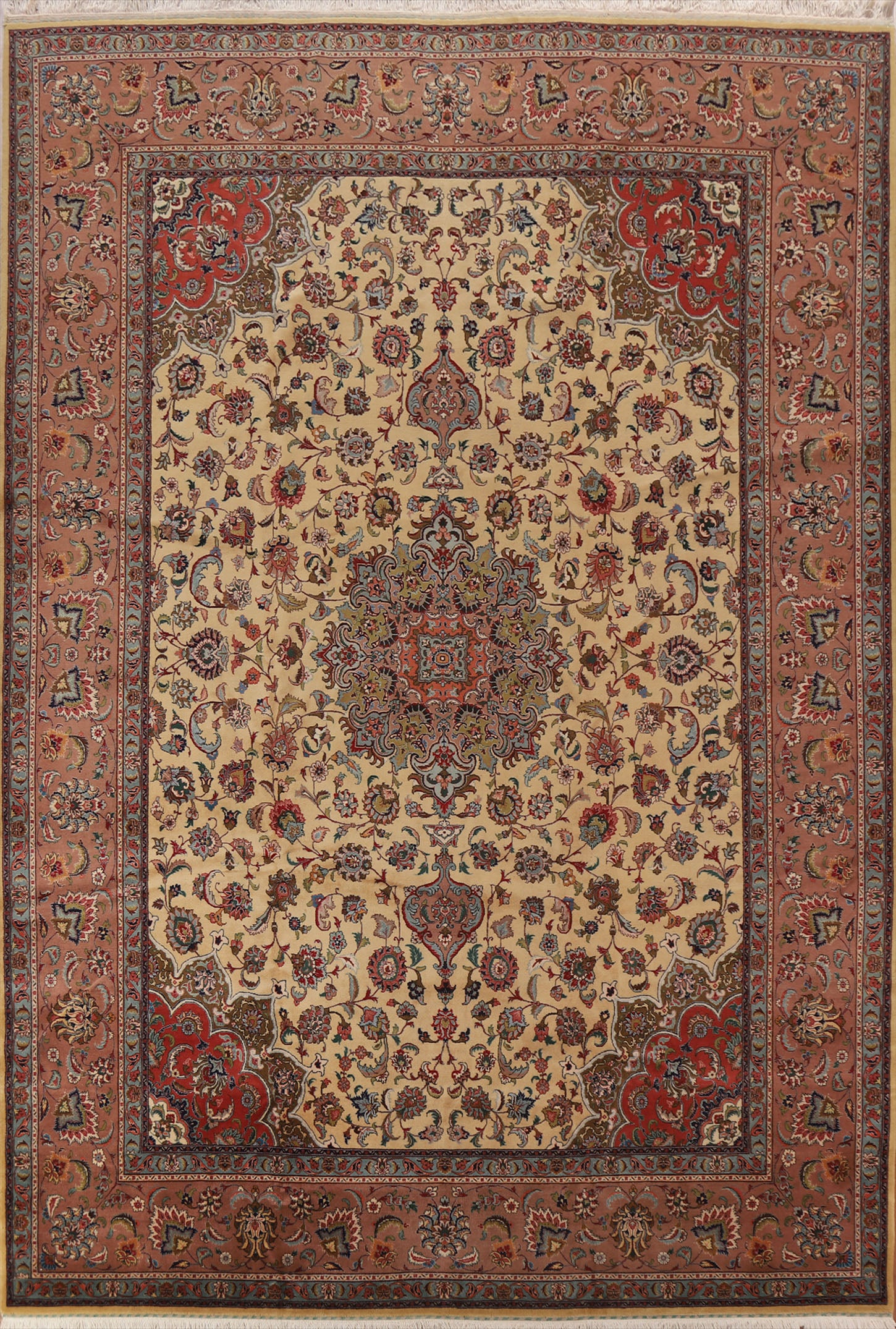 A Beautiful Genuine Persia ( Persia ) Tabriz rug is Hand Knotted by skillful weavers in Persia ( Persia ) with 100% Wool Material. This rug is in Excellent condition. dimensions are 12' 9'' X 9' 9'' in foot and 389 X 297 in centimeter. the primary color is Beige & Ivories.