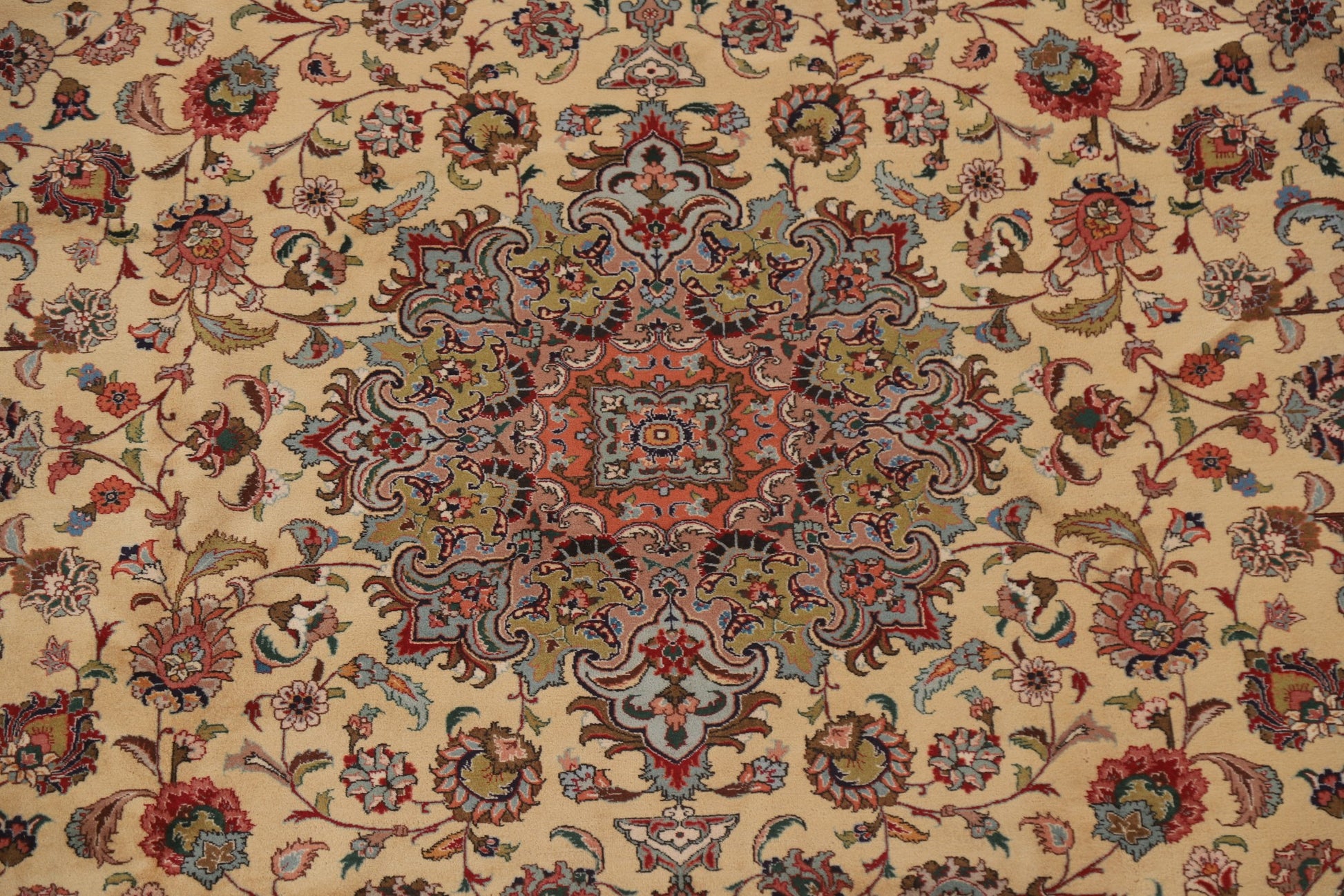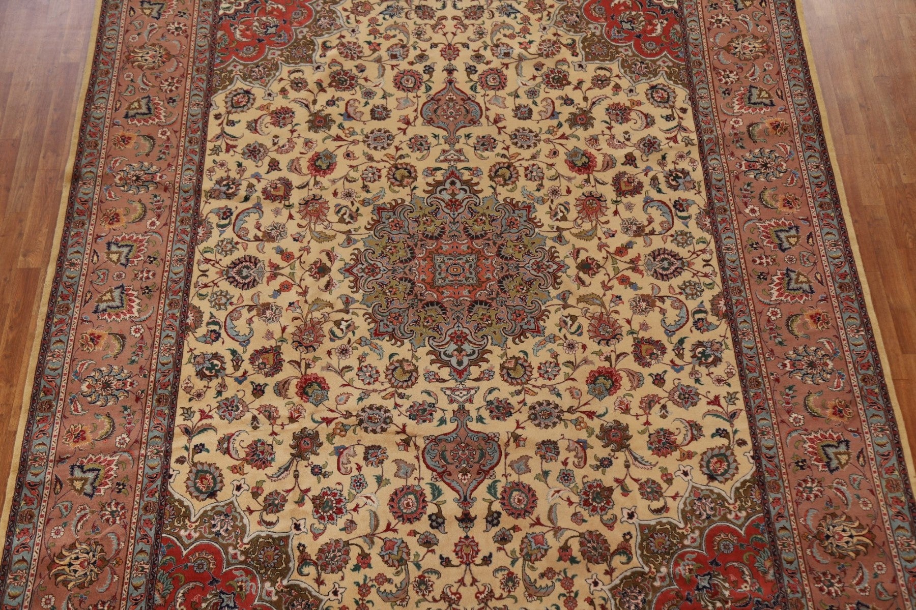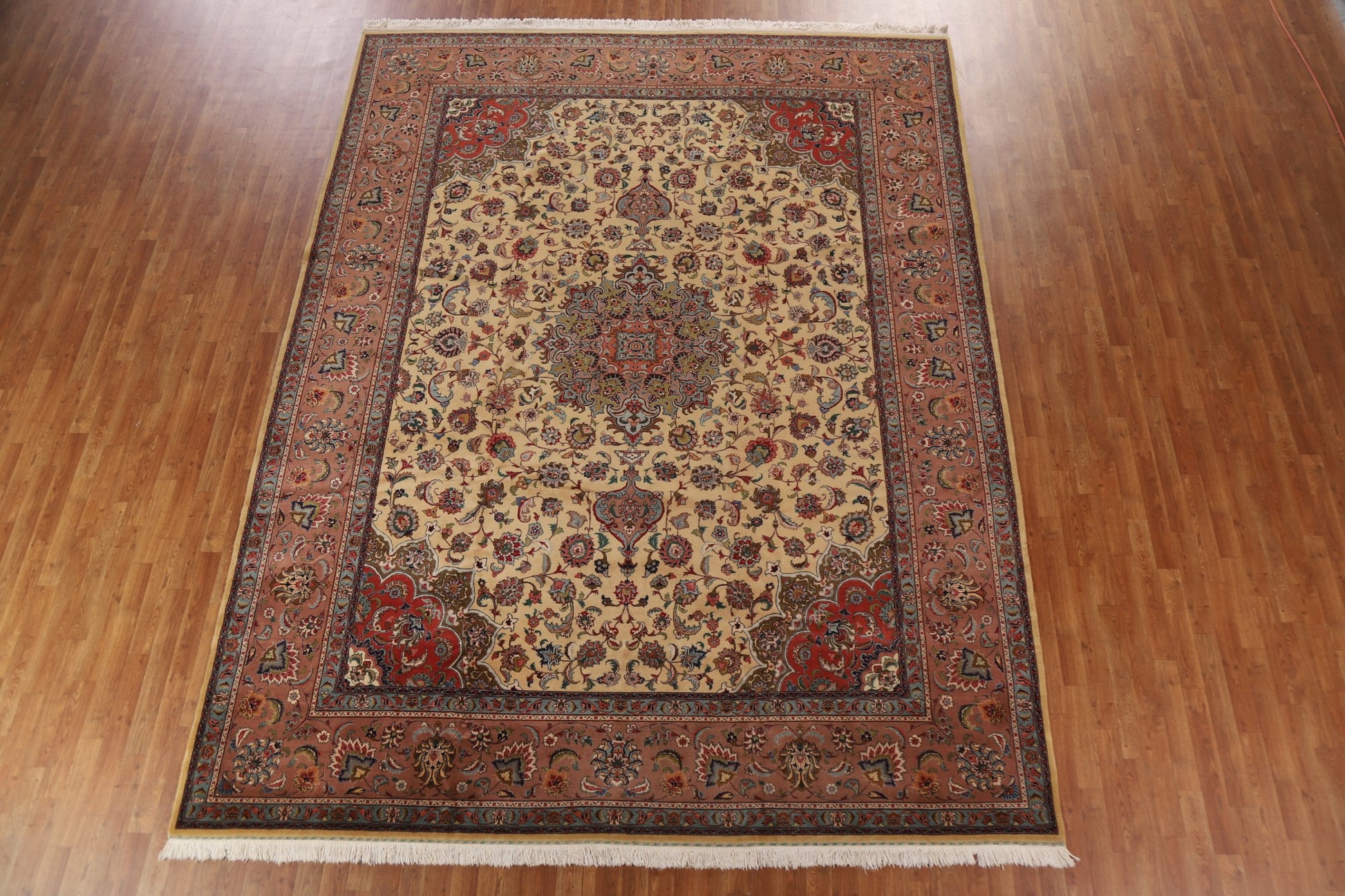 A Beautiful Genuine Persia ( Persia ) Tabriz rug is Hand Knotted by skillful weavers in Persia ( Persia ) with 100% Wool Material. This rug is in Excellent condition. dimensions are 12' 9'' X 9' 9'' in foot and 389 X 297 in centimeter. the primary color is Beige & Ivories.
