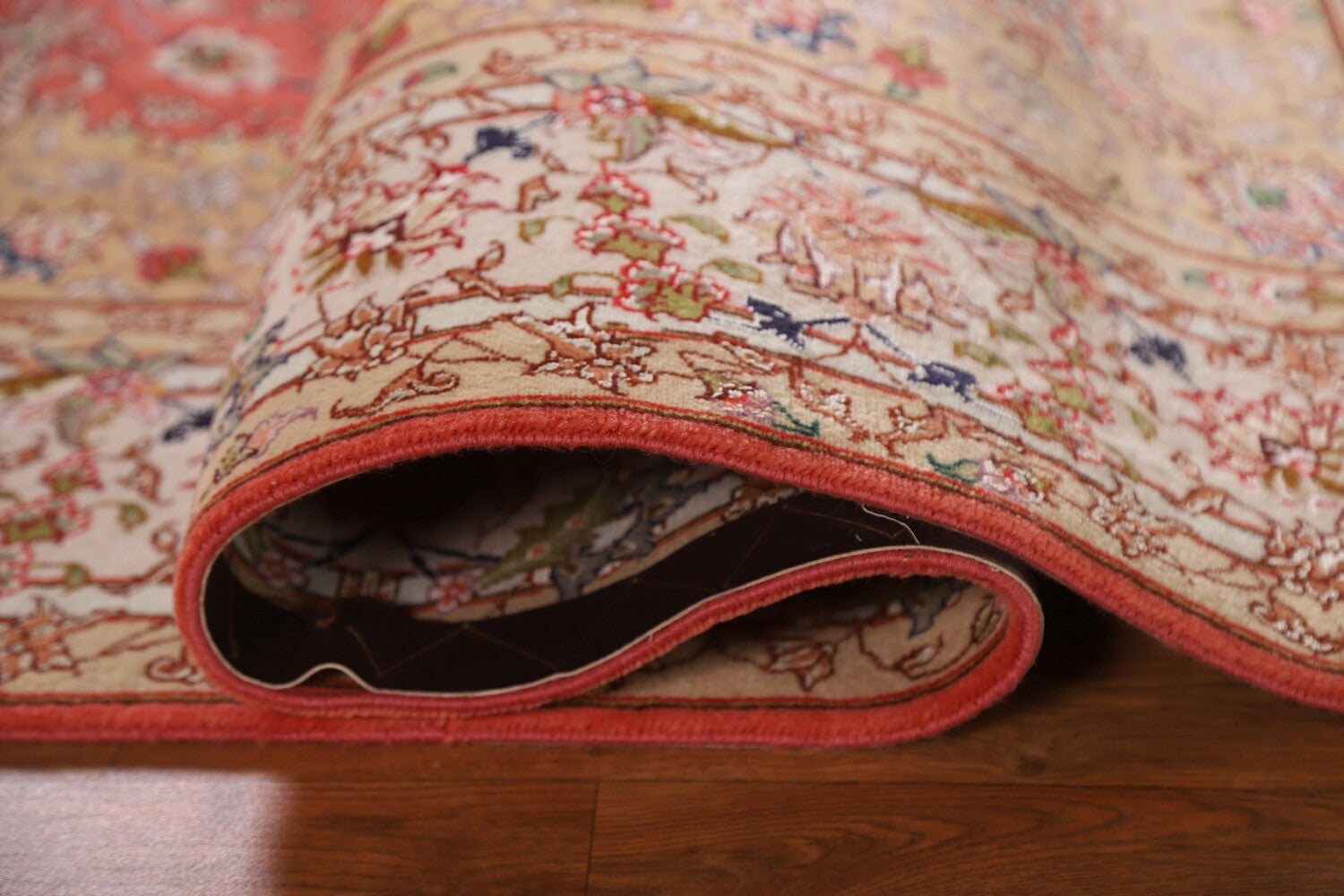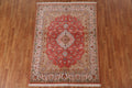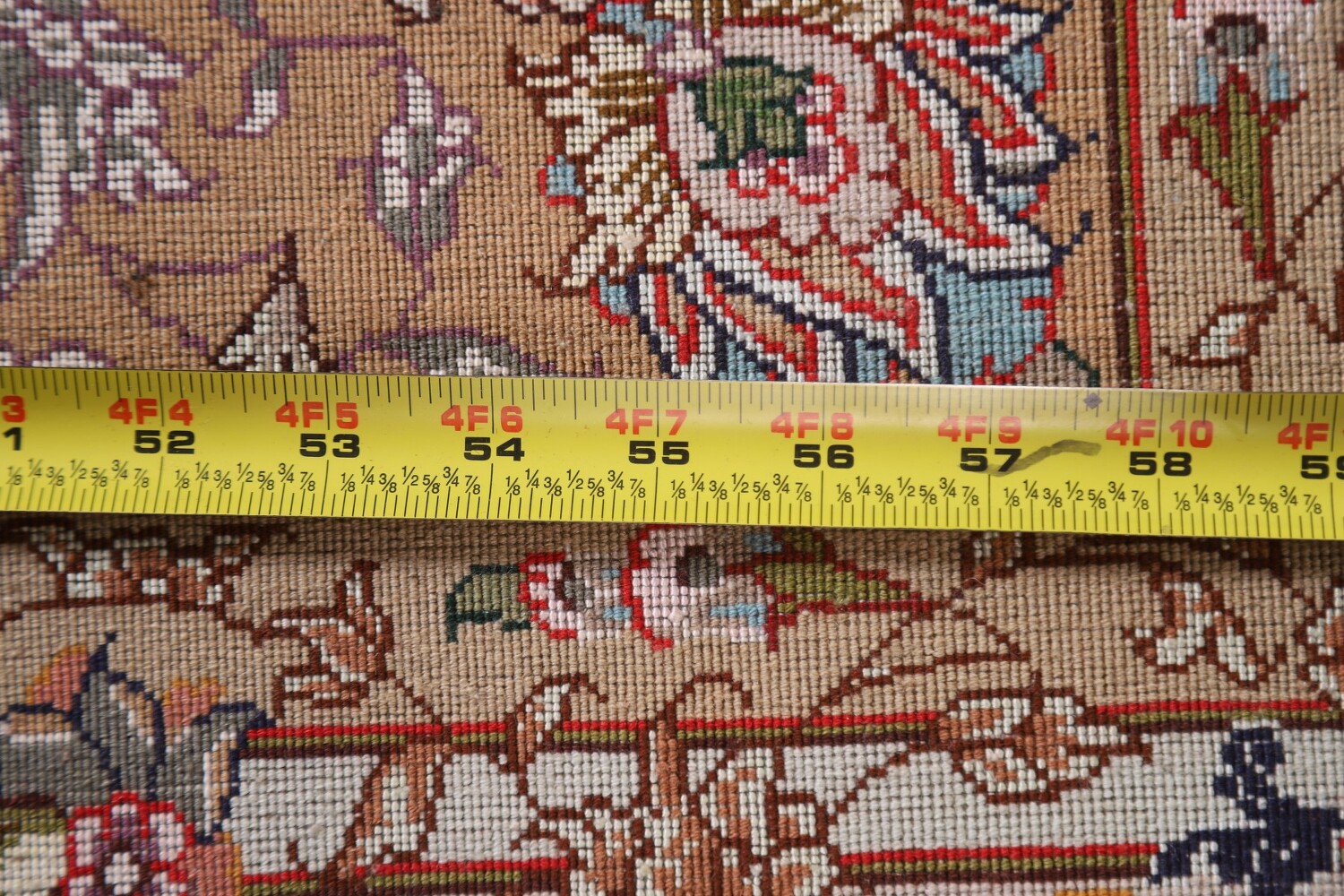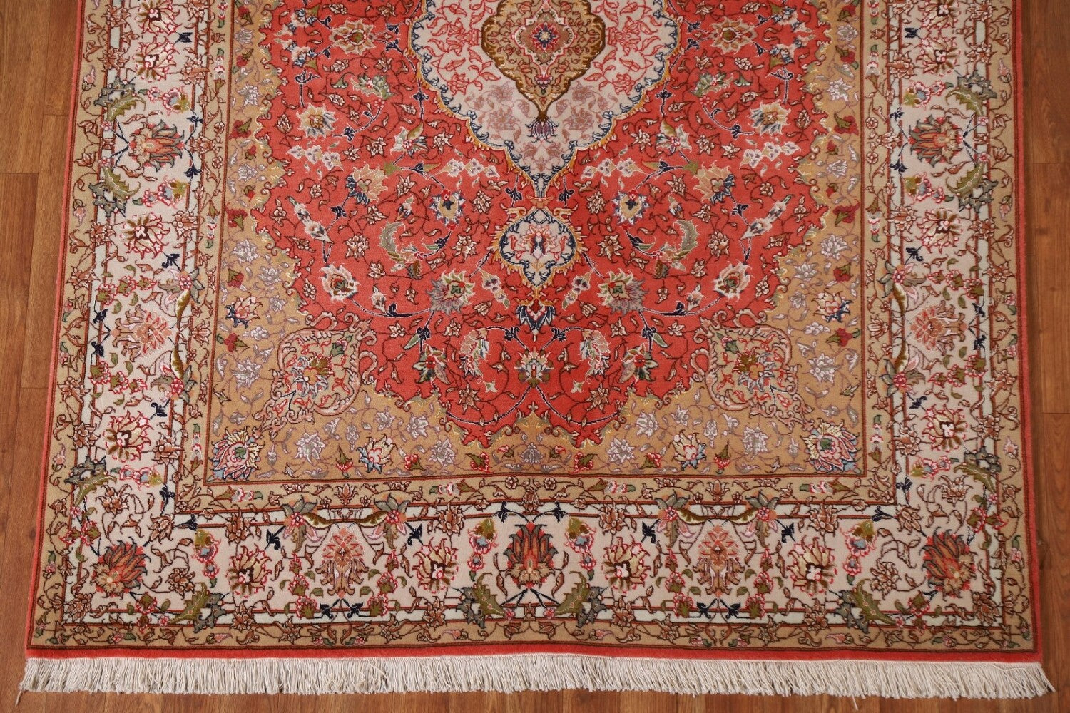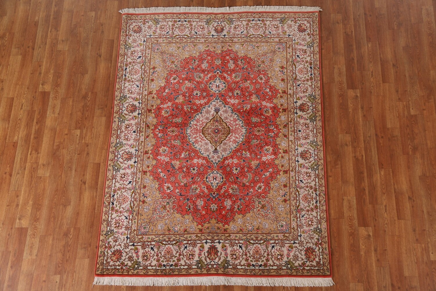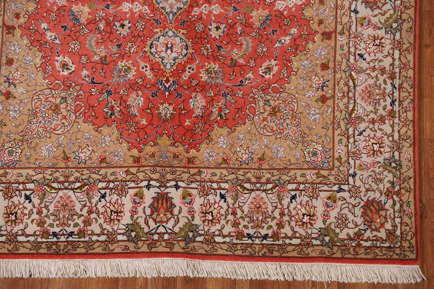 A Beautiful Genuine Persia ( Persia ) Tabriz rug is Hand Knotted by skillful weavers in Persia ( Persia ) with Wool & Silk Material. This rug is in condition. dimensions are 6' 7'' X 4' 11'' in foot and 201 X 150 in centimeter. the primary color is Red.