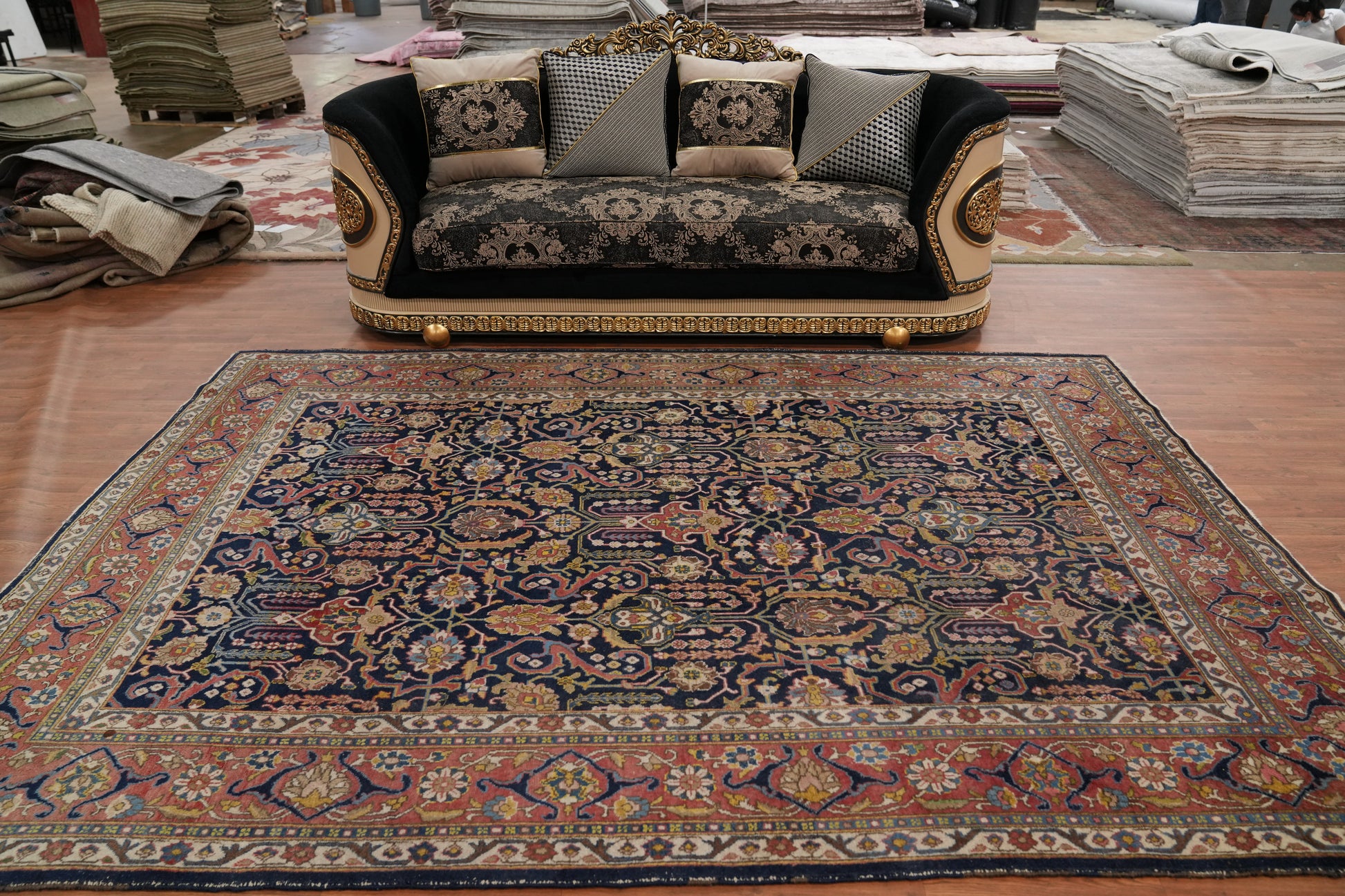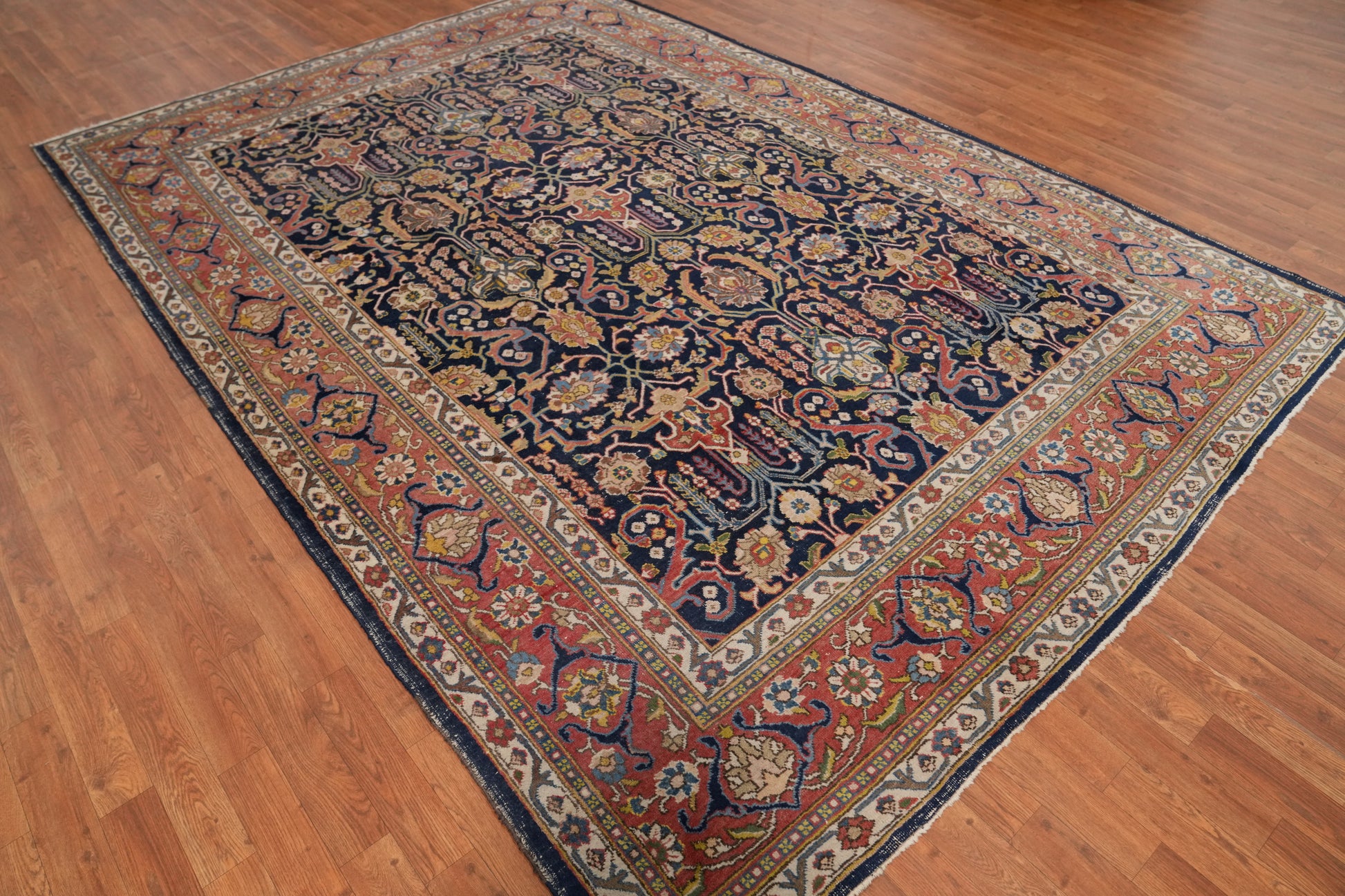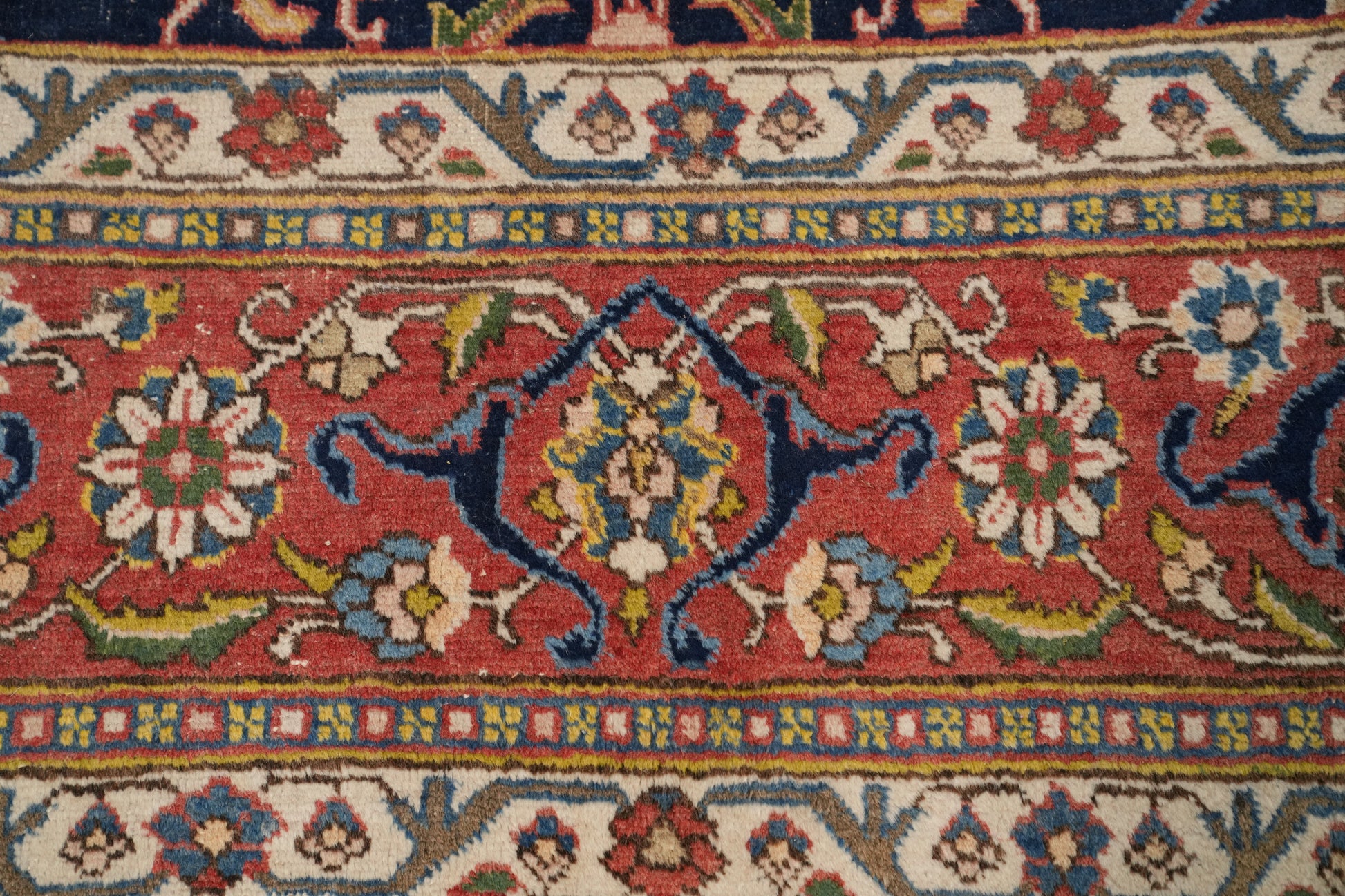 A Beautiful Genuine Persia ( Persia ) Tabriz rug is Hand Knotted by skillful weavers in Persia ( Persia ) with 100% Wool Material. This rug is in Very Good ( Low Pile ) condition. dimensions are 10' 6'' X 7' 2'' in foot and 320 X 218 in centimeter. the primary color is Navy Blue & Blues.