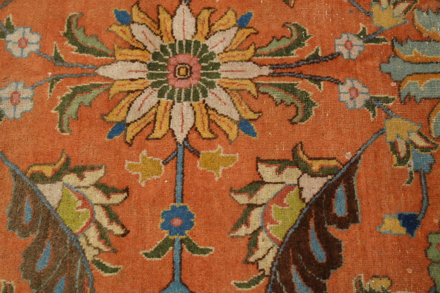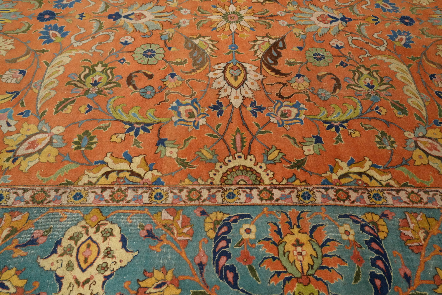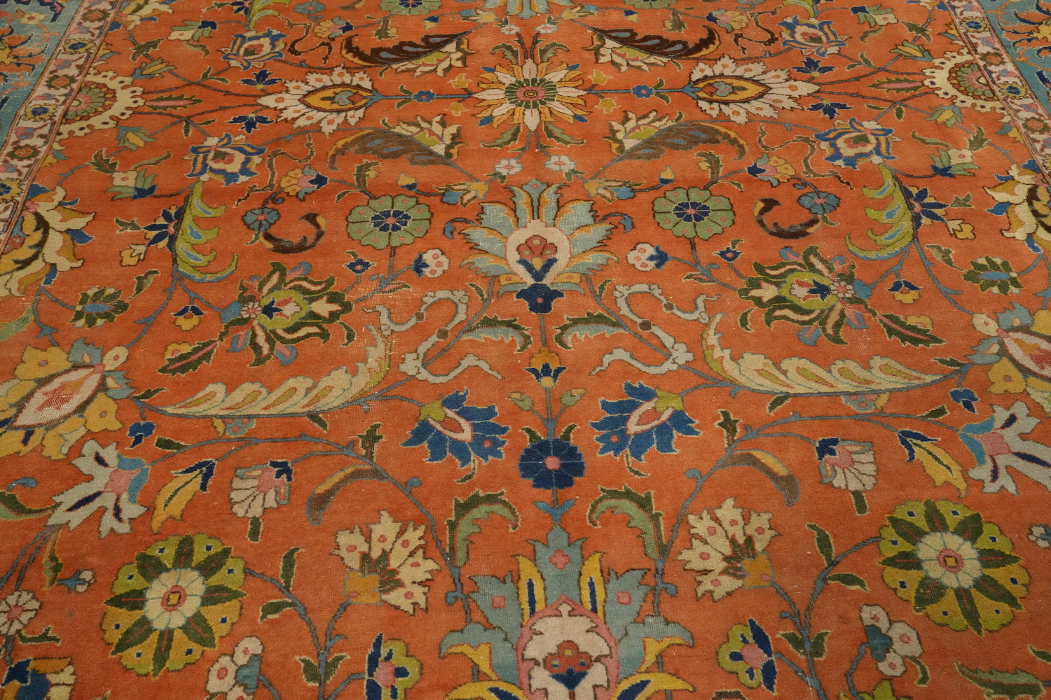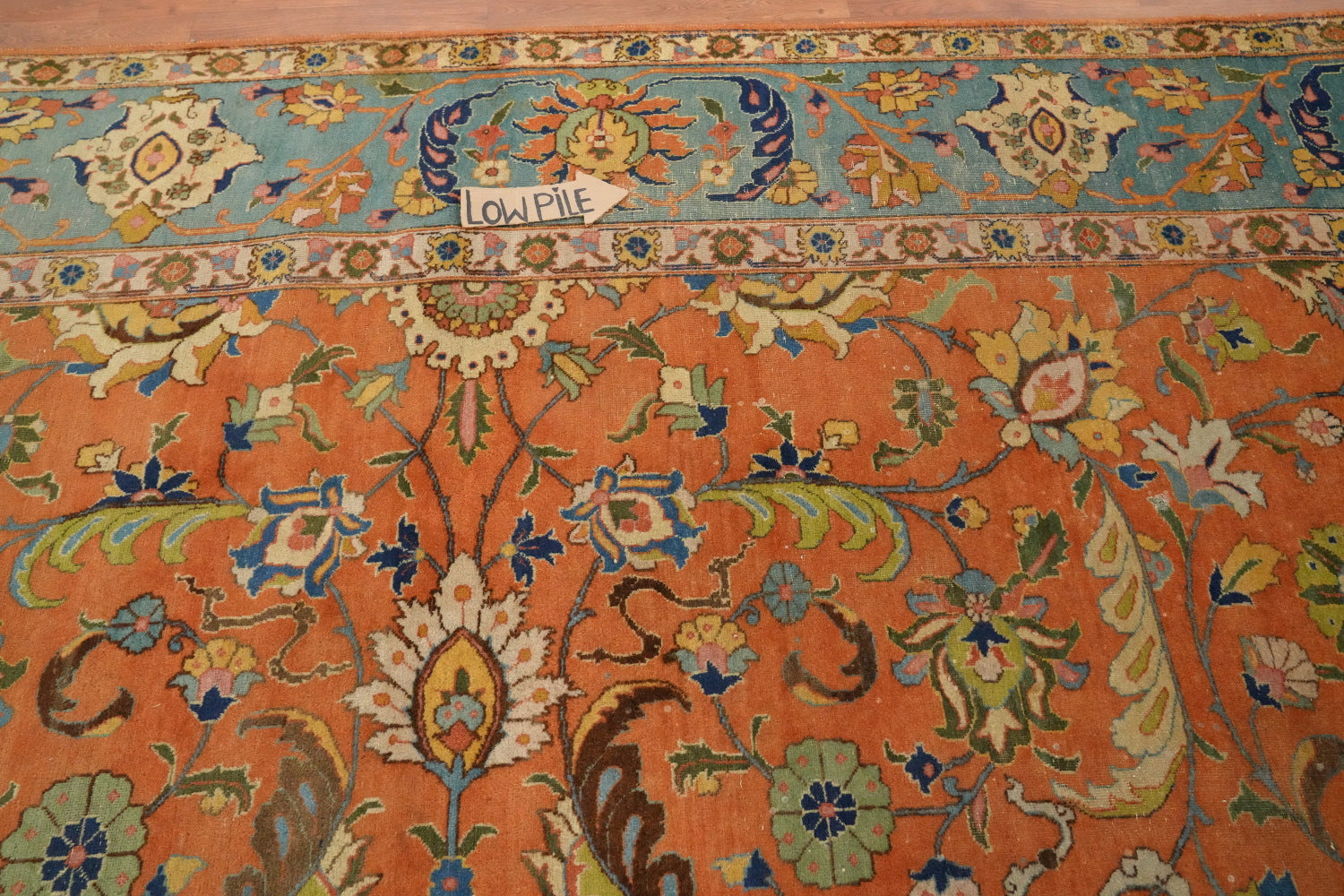 A Beautiful Genuine Persia ( Persia ) Tabriz rug is Hand Knotted by skillful weavers in Persia ( Persia ) with 100% Wool Material. This rug is in Very Good ( Low Pile ) condition. dimensions are 12' 8'' X 9' 3'' in foot and 386 X 282 in centimeter. the primary color is Oranges & Rust.