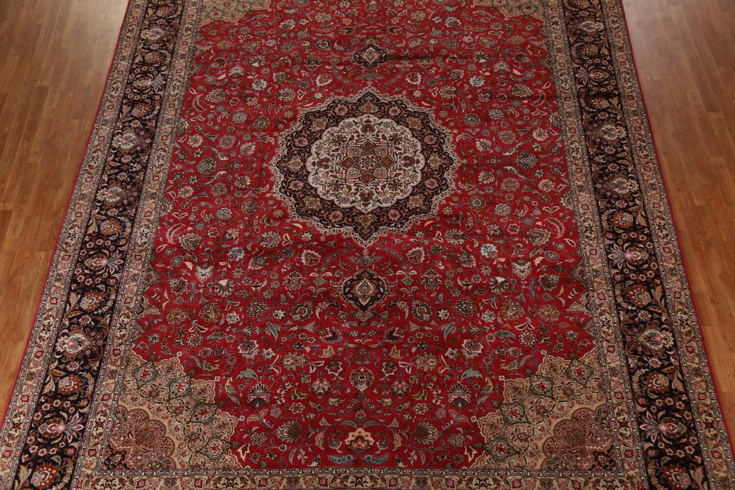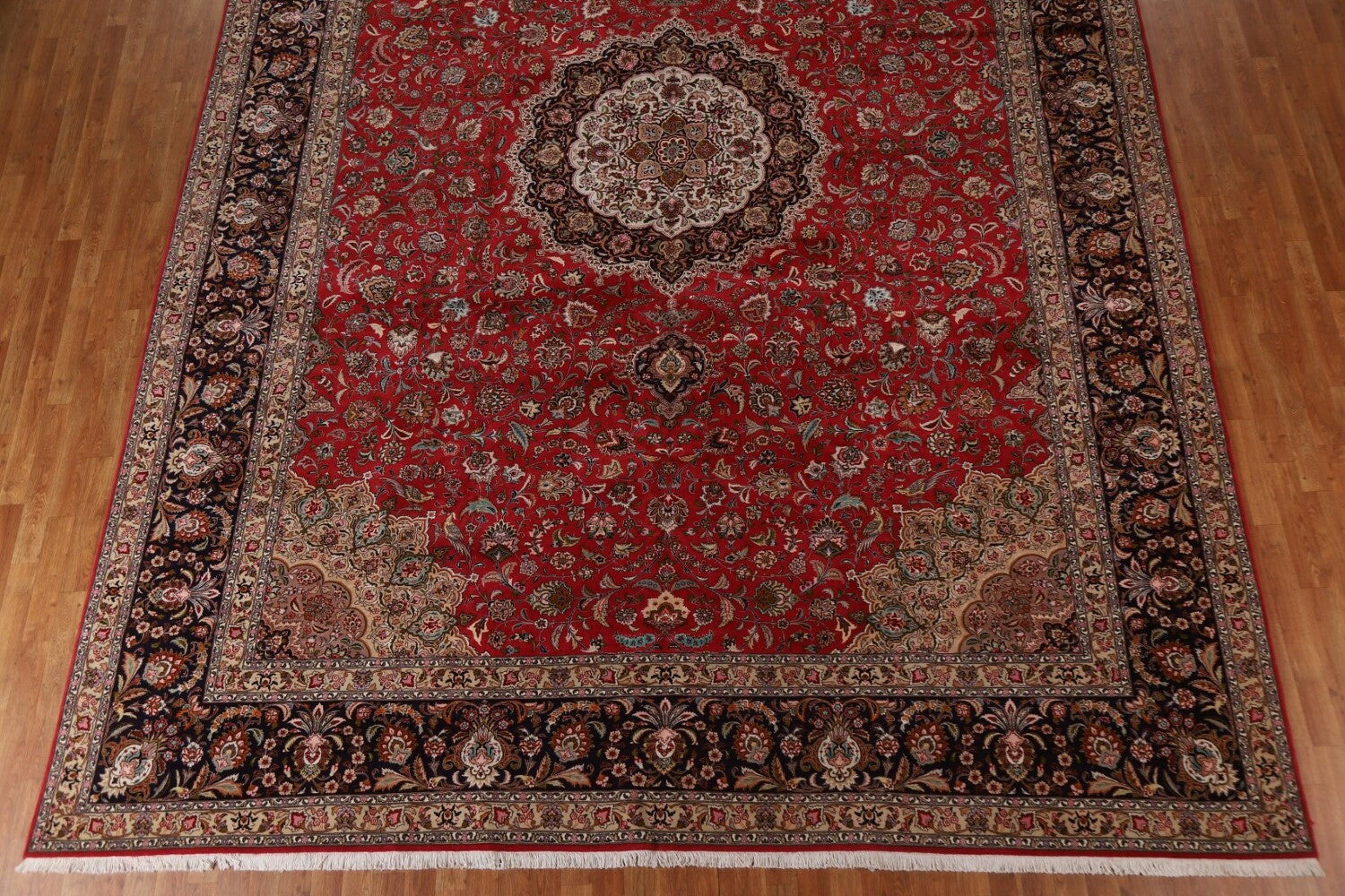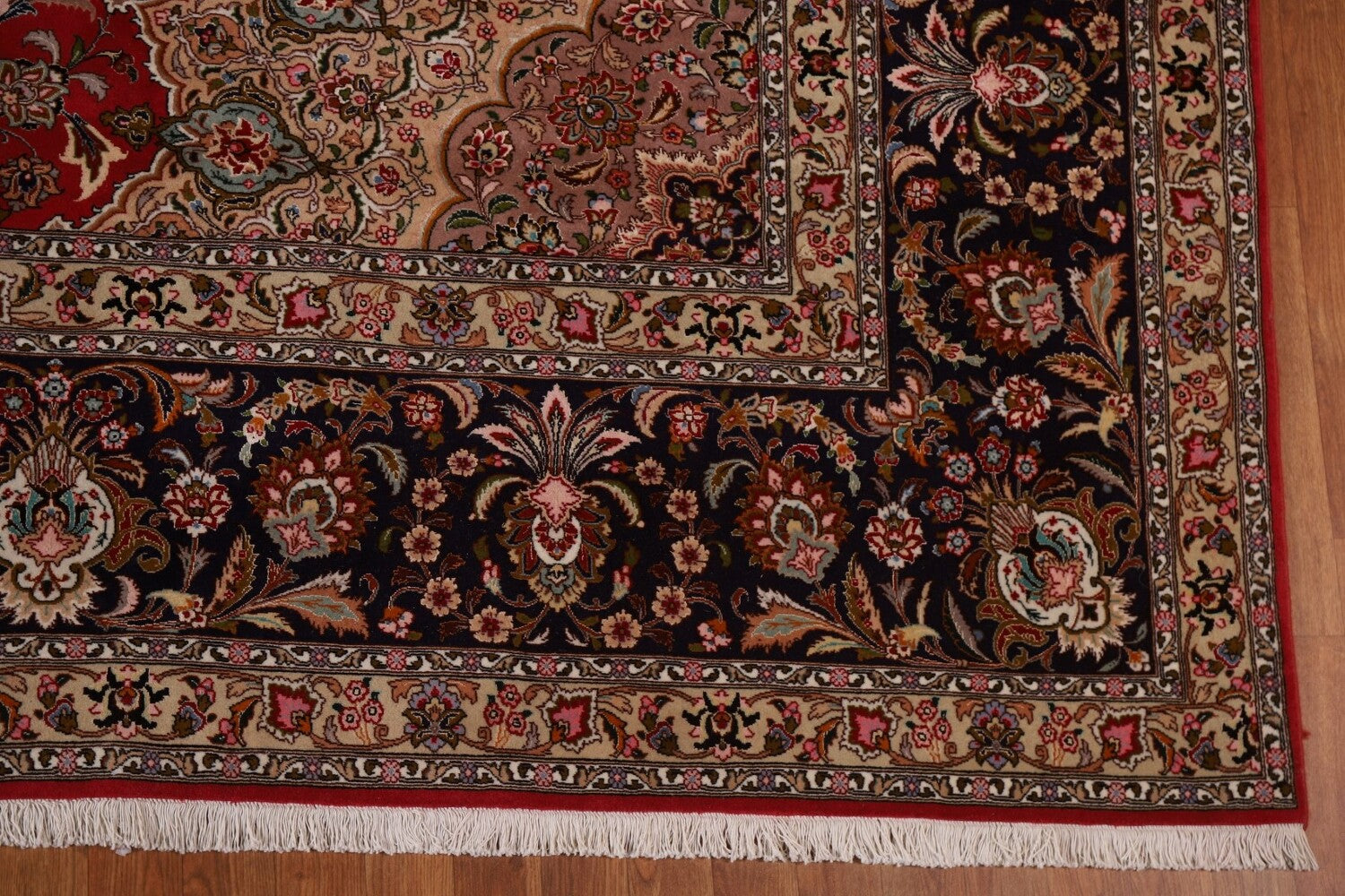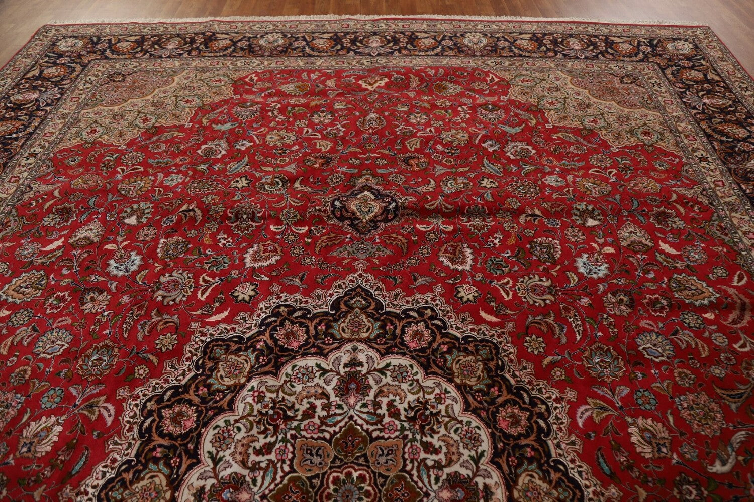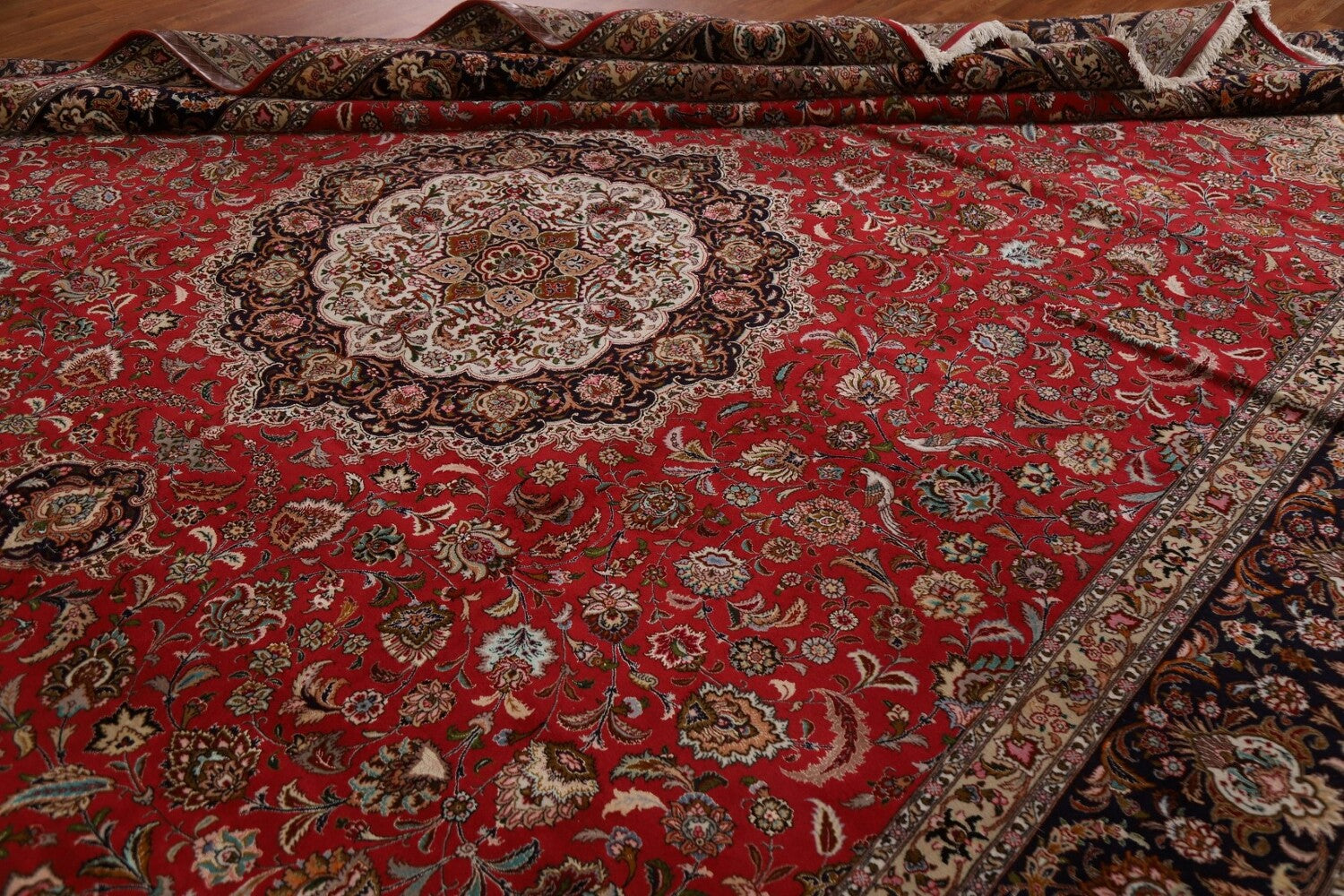 A Beautiful Genuine Persia ( Persia ) Tabriz rug is Hand Knotted by skillful weavers in Persia ( Persia ) with Wool & Silk Material. This rug is in condition. dimensions are 15' 7'' X 11' 4'' in foot and 475 X 345 in centimeter. the primary color is Red.