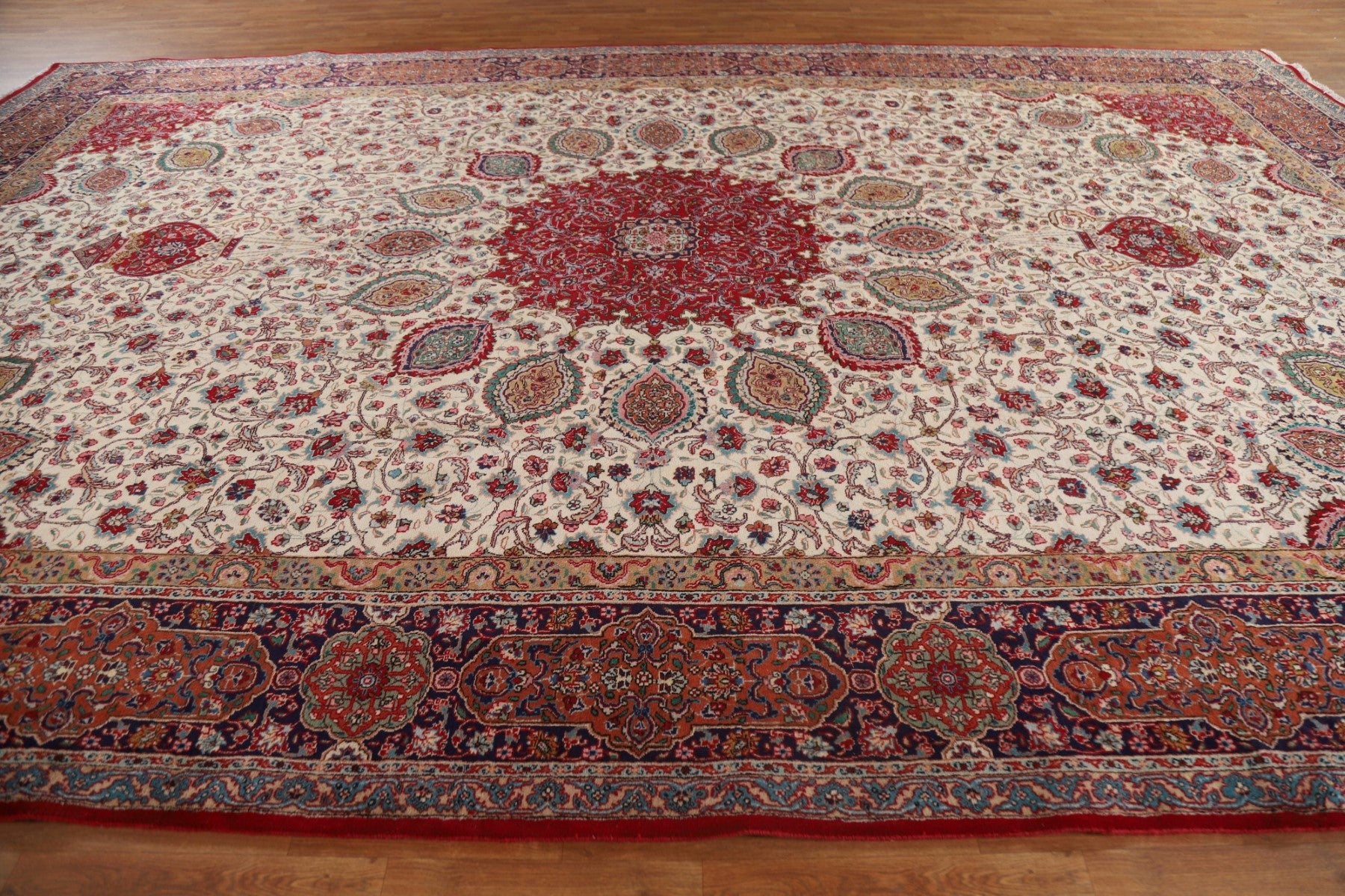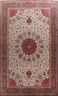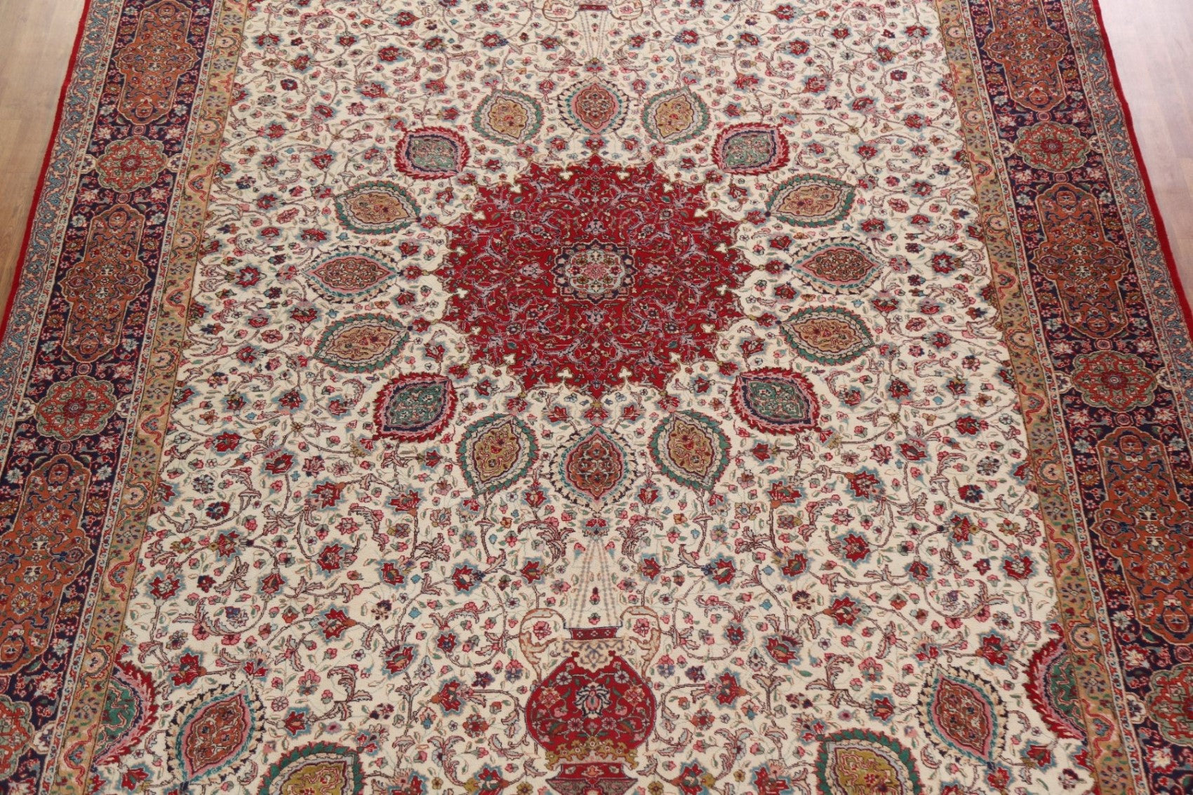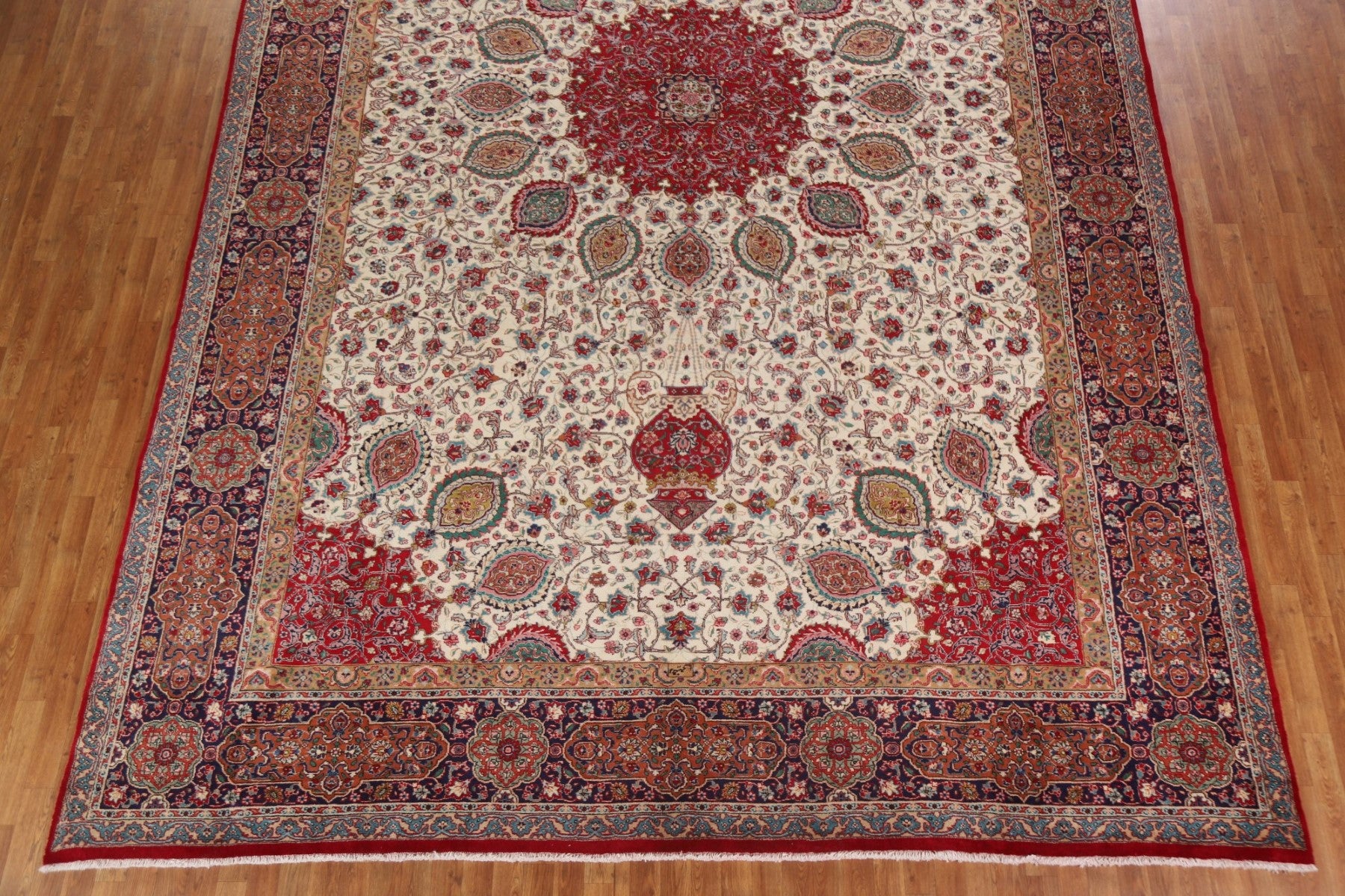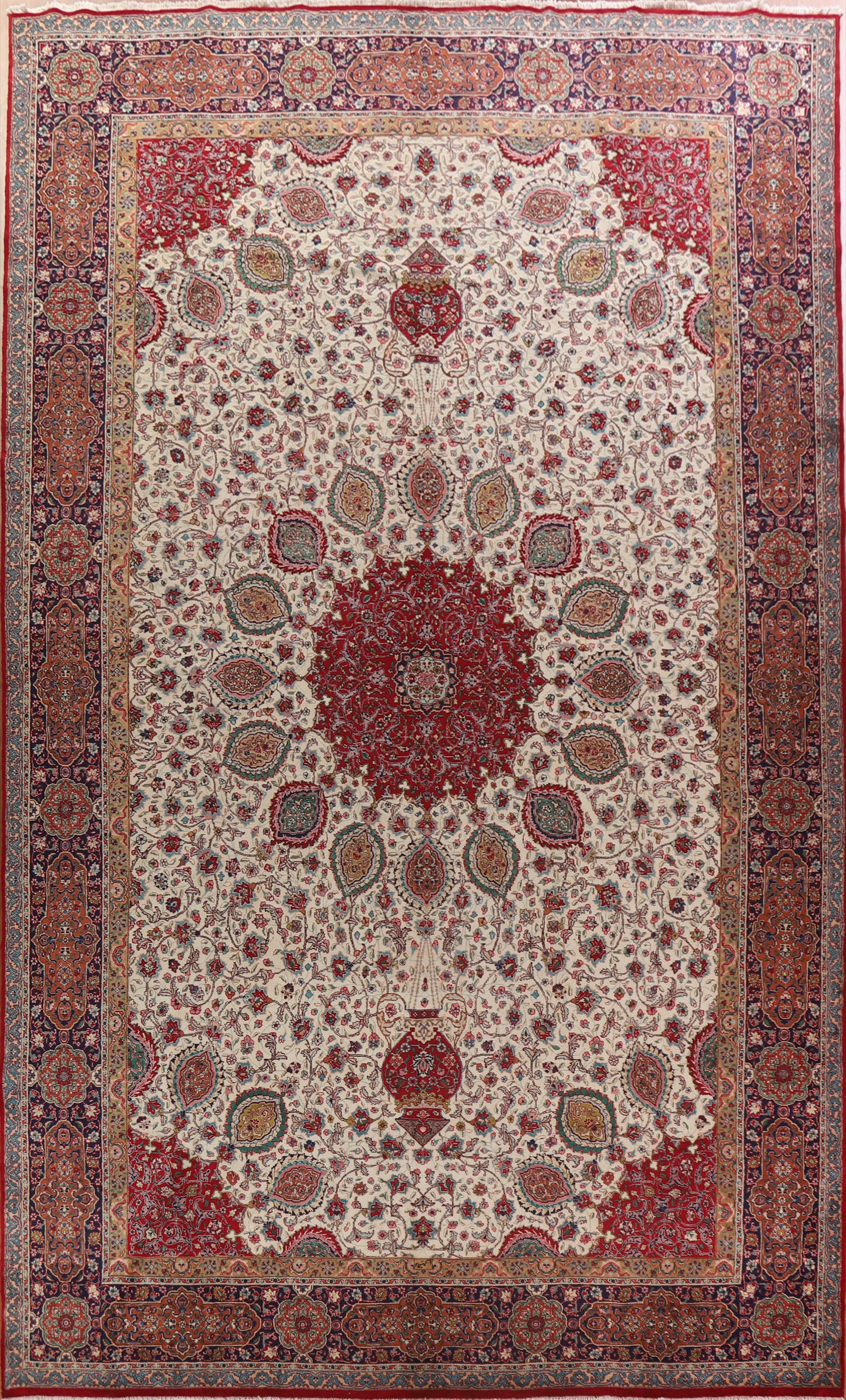 A Beautiful Genuine Persia ( Persia ) Tabriz rug is Hand Knotted by skillful weavers in Persia ( Persia ) with 100% Wool Material. This rug is in Very Good condition. dimensions are 17' 9'' X 11' 6'' in foot and 541 X 351 in centimeter. the primary color is Beige & Ivories.