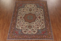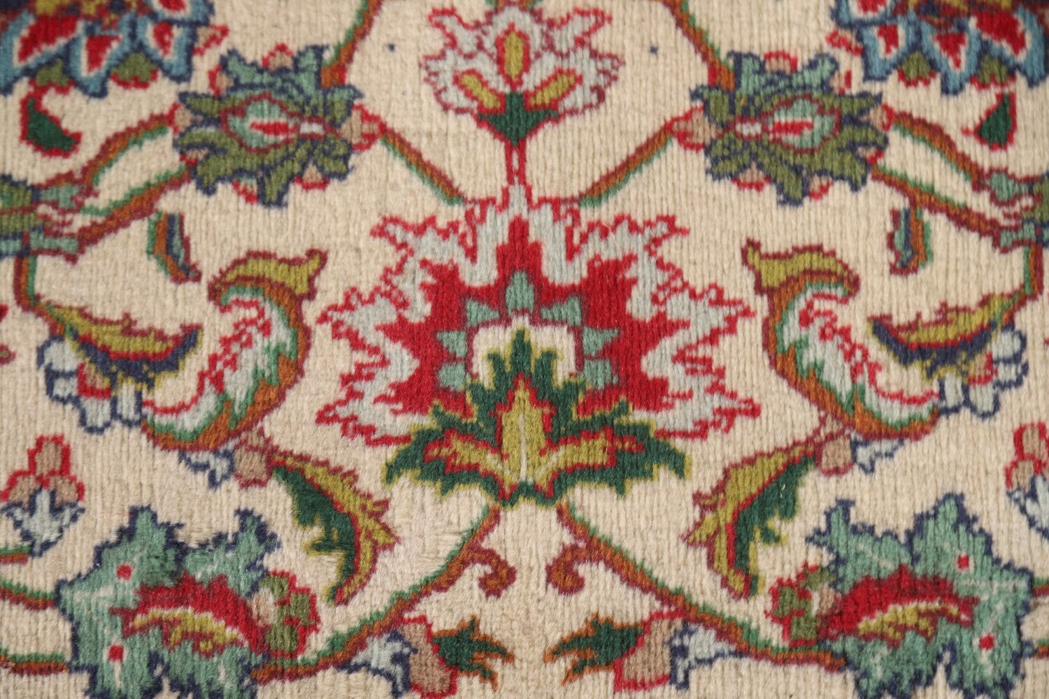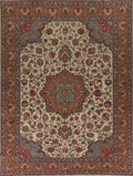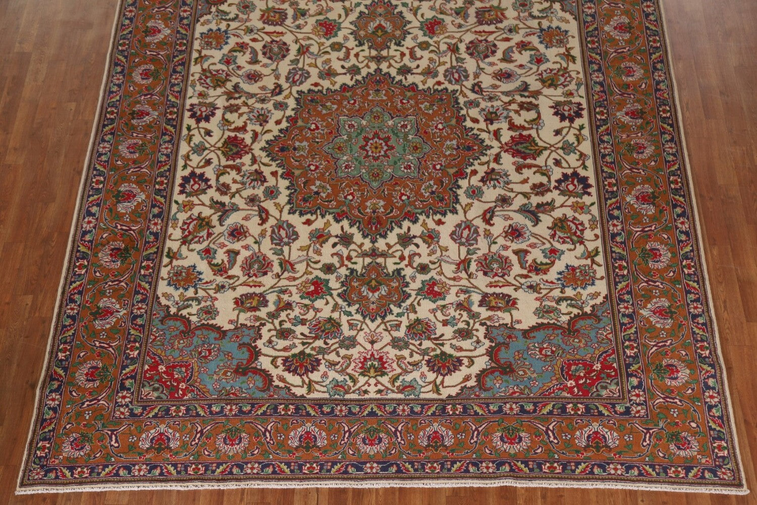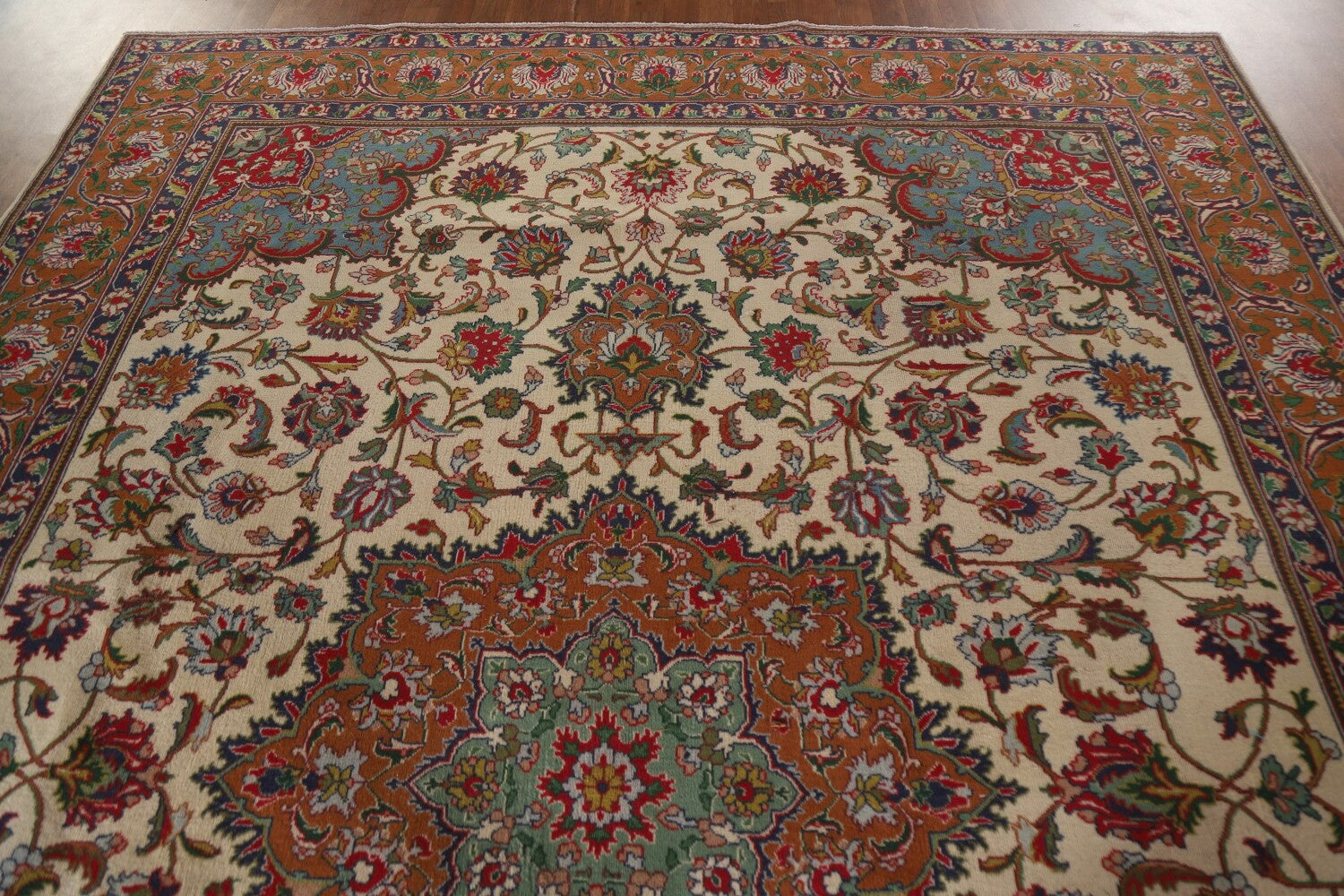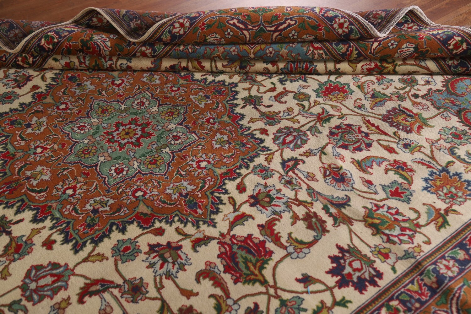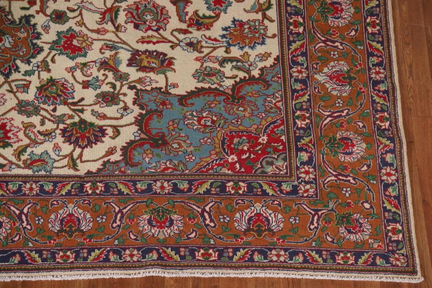 A Beautiful Genuine Persia ( Persia ) Tabriz rug is Hand Knotted by skillful weavers in Persia ( Persia ) with 100% Wool Material. This rug is in Very Good (Low Pile) condition. dimensions are 10' 9'' X 8' 6'' in foot and 328 X 259 in centimeter. the primary color is Beige & Ivories.