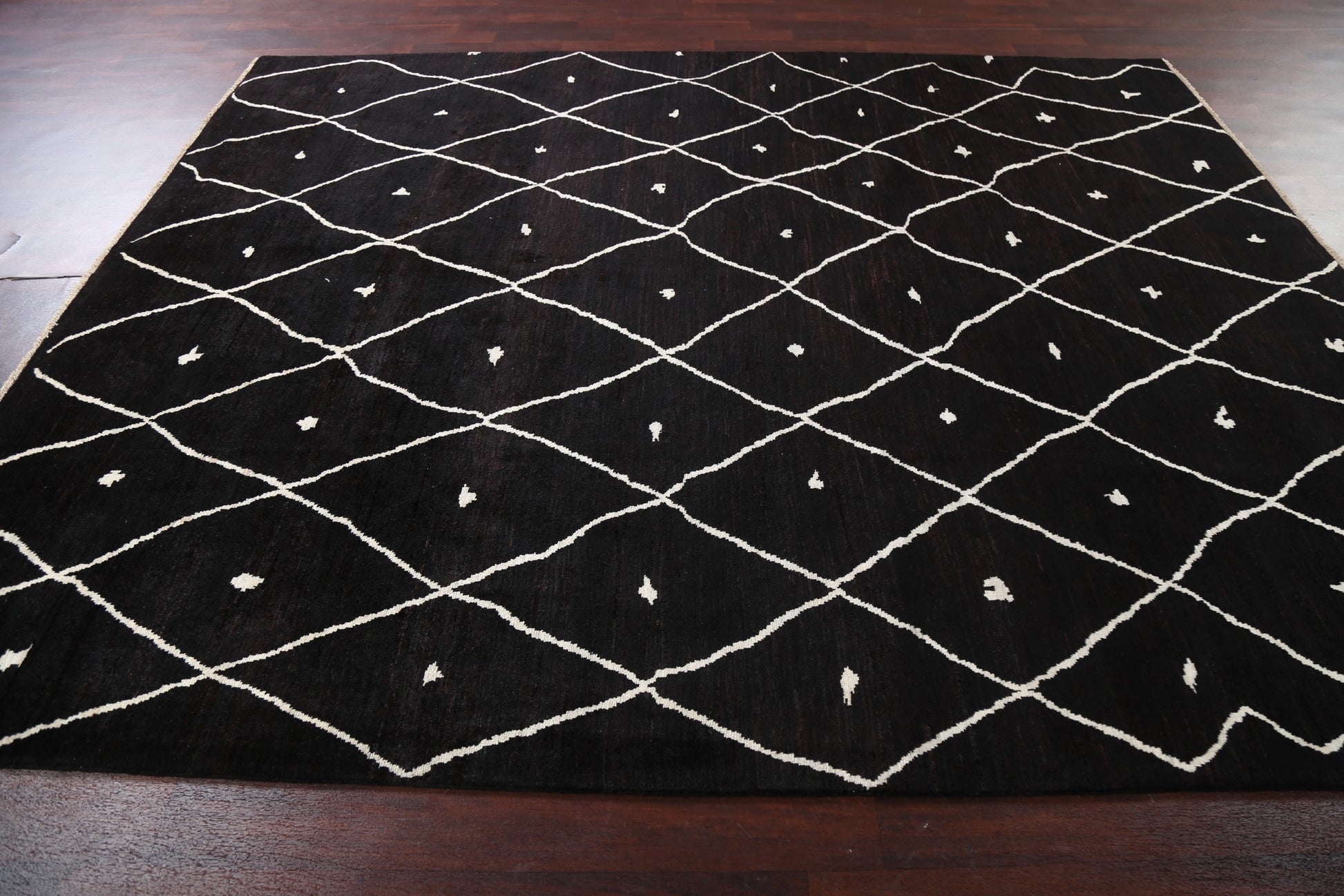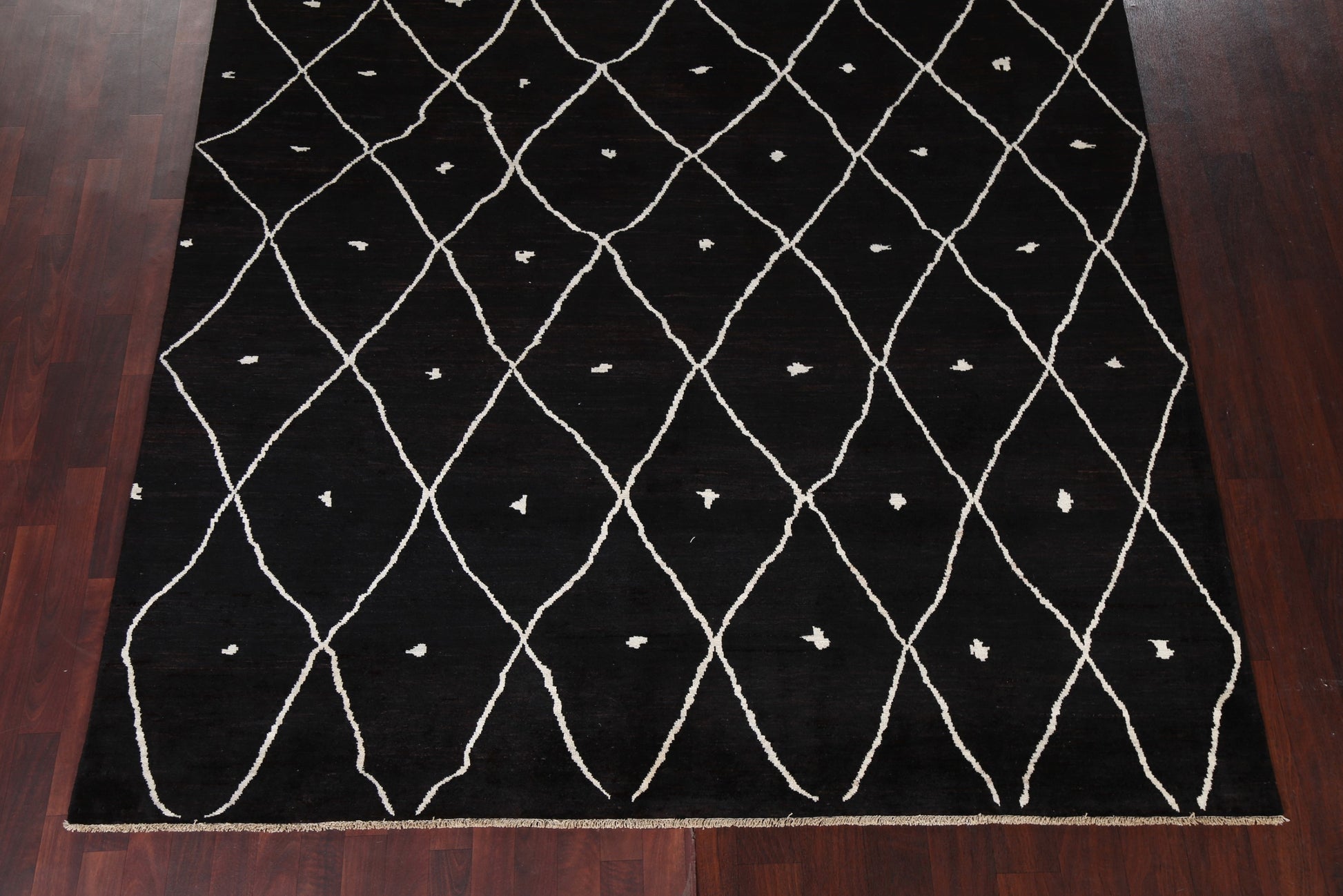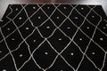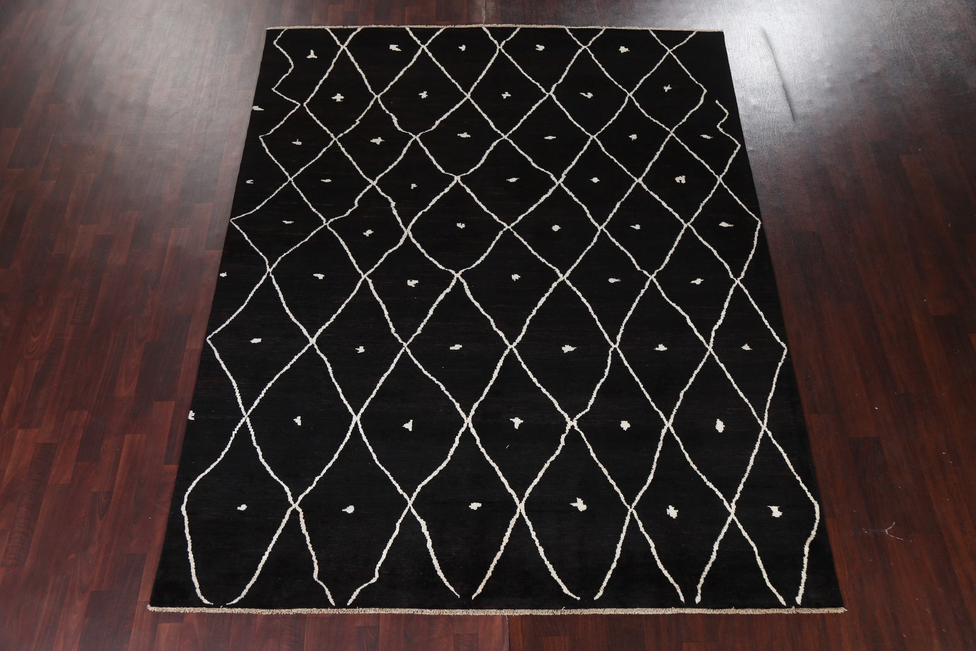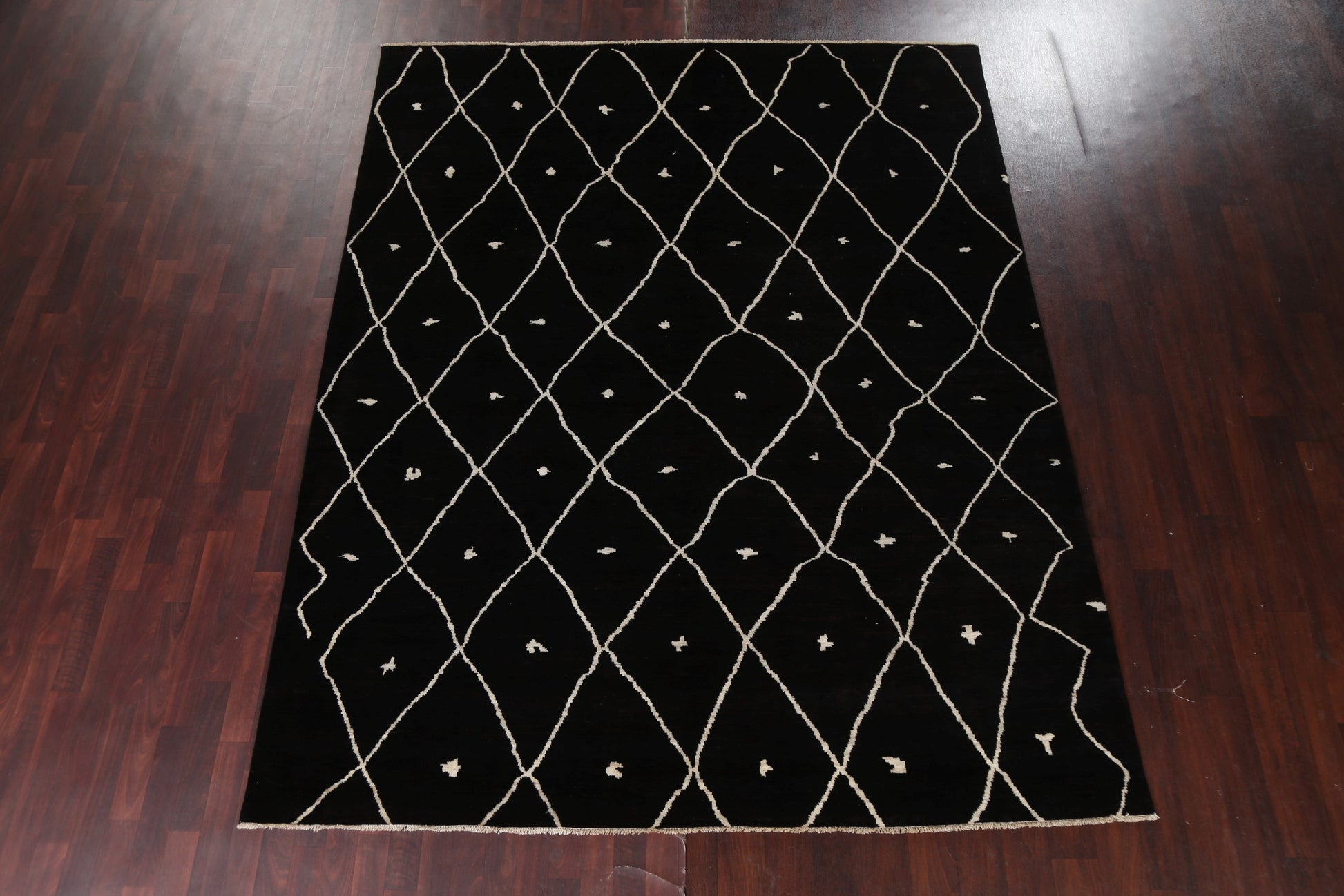 A Beautiful Genuine Pakistan Moroccan rug is Hand Knotted by skillful weavers in Pakistan with 100% Wool Material. This rug is in New, First Quality condition. dimensions are 9' 10'' X 7' 10'' in foot and 300 X 239 in centimeter. the primary color is Black.