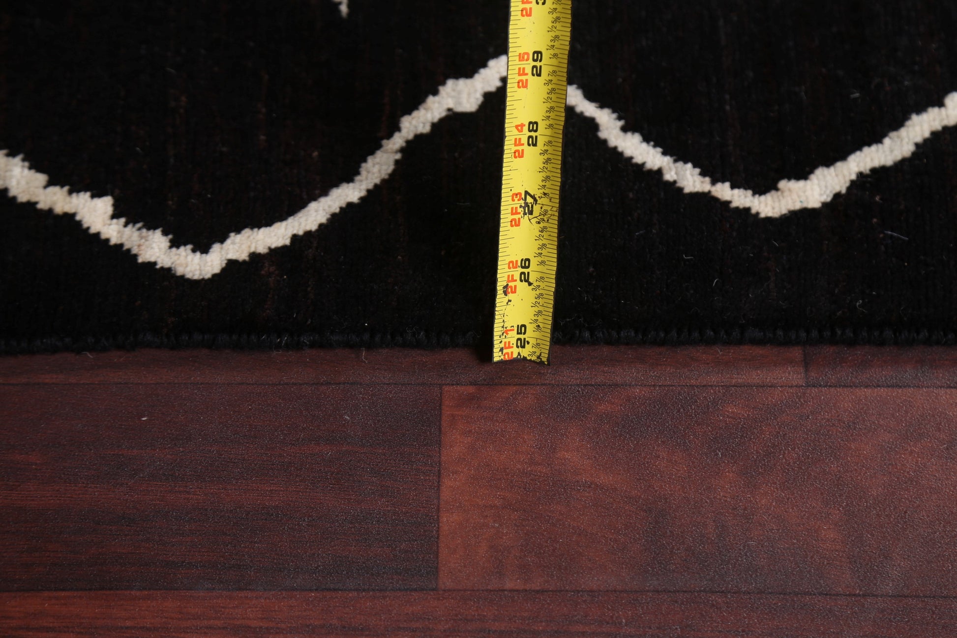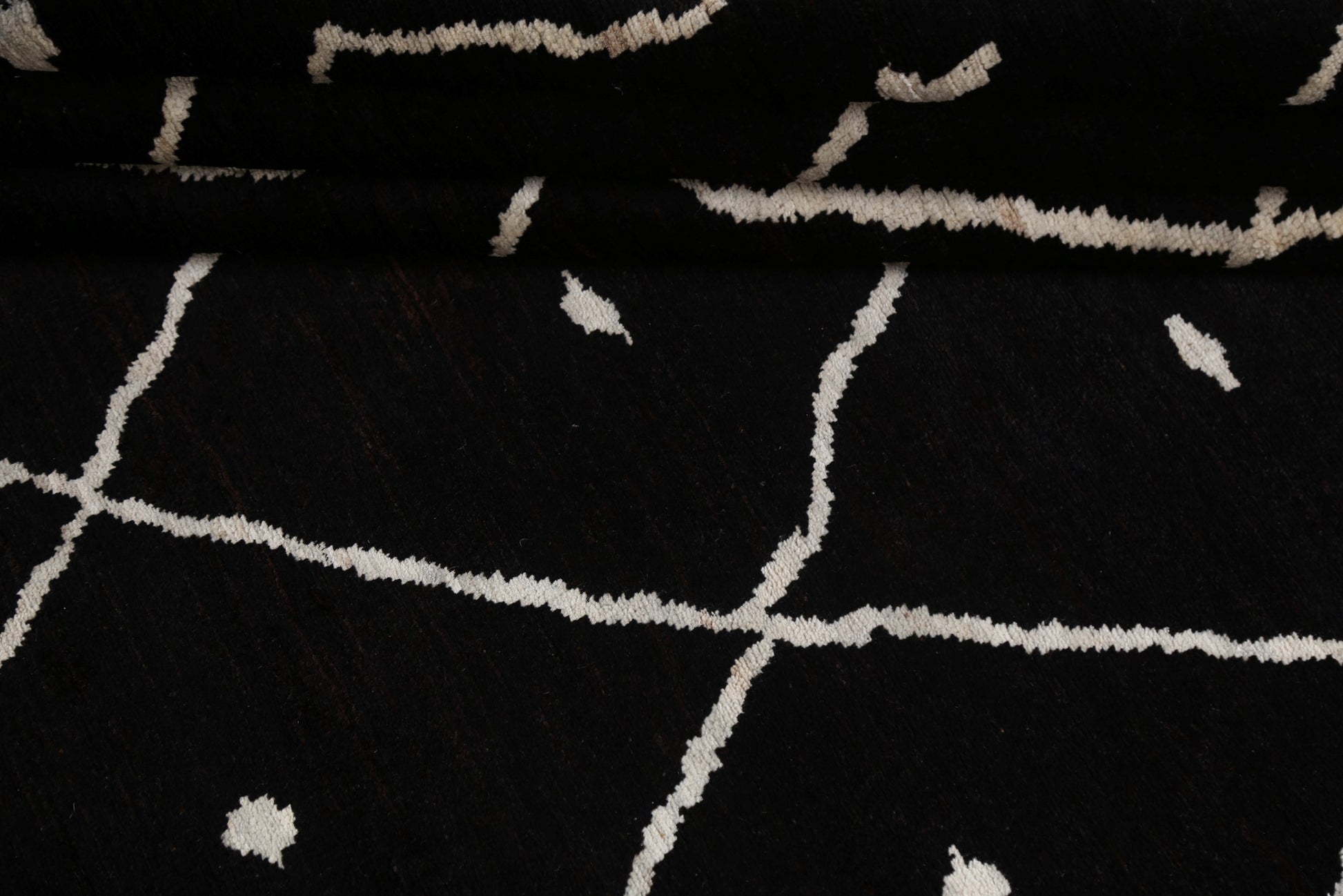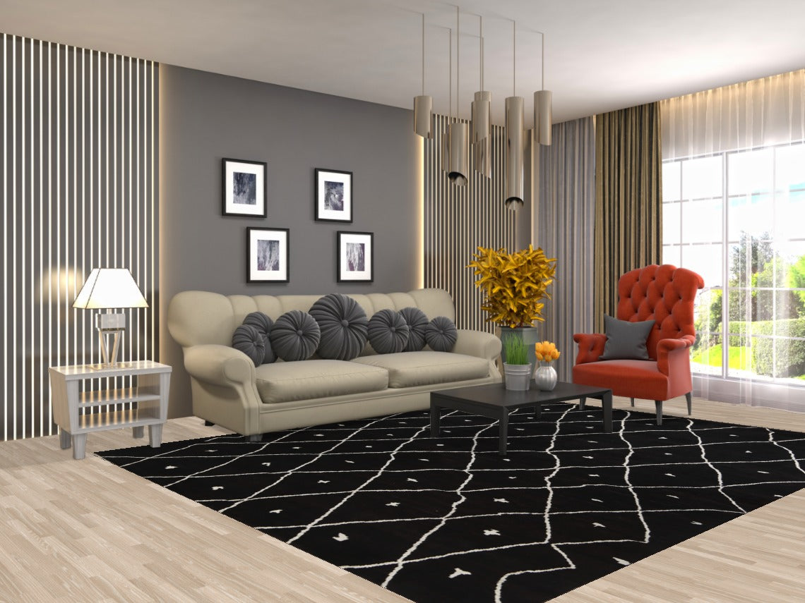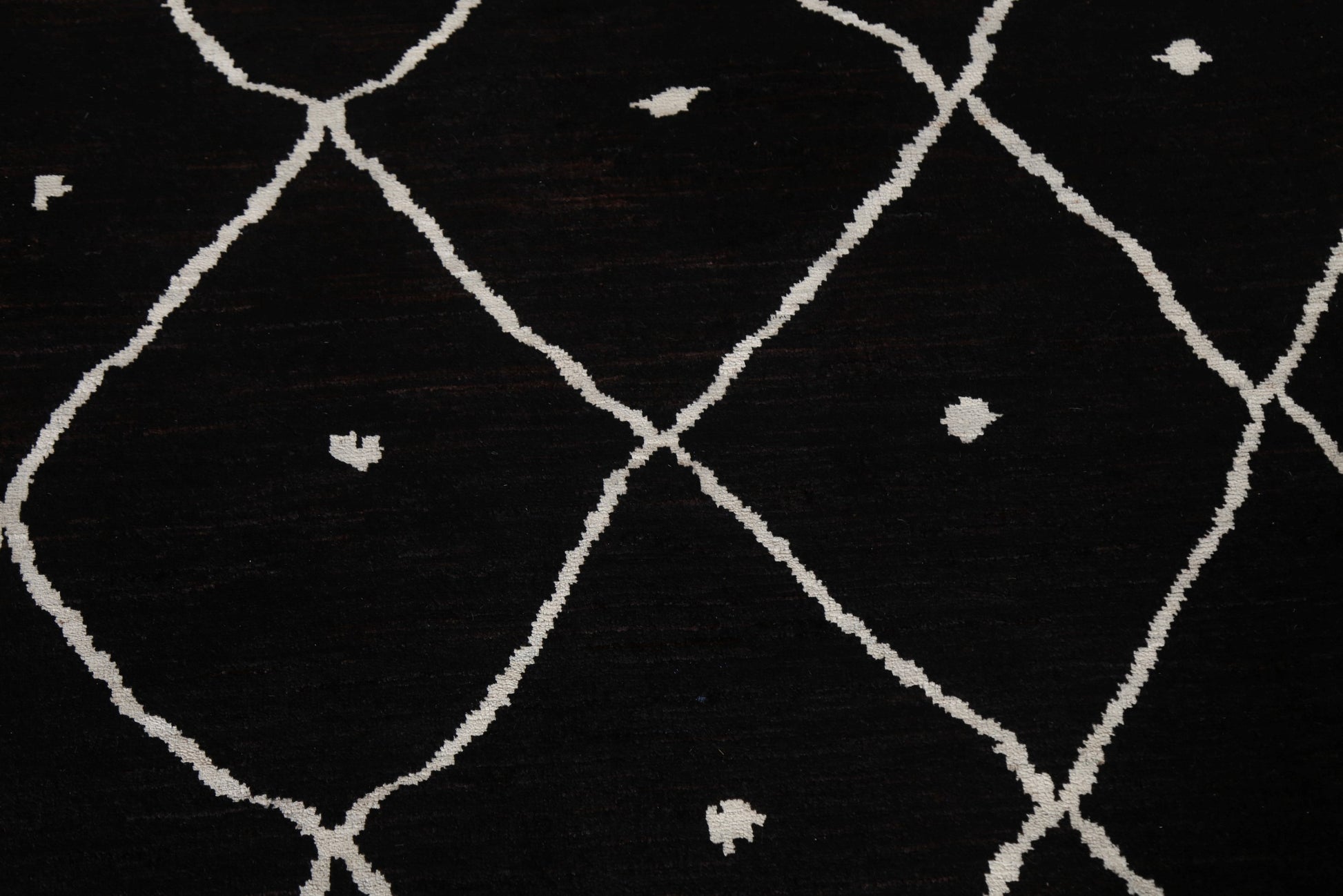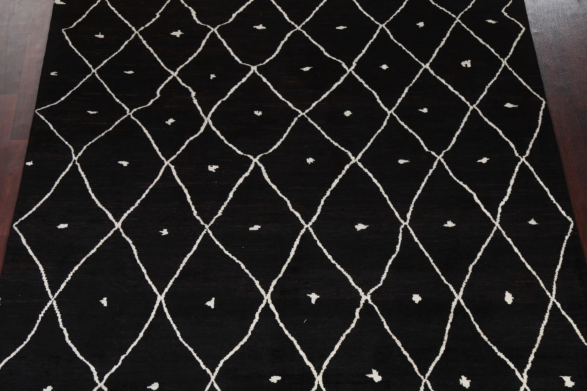 A Beautiful Genuine Pakistan Moroccan rug is Hand Knotted by skillful weavers in Pakistan with 100% Wool Material. This rug is in New, First Quality condition. dimensions are 9' 10'' X 7' 10'' in foot and 300 X 239 in centimeter. the primary color is Black.