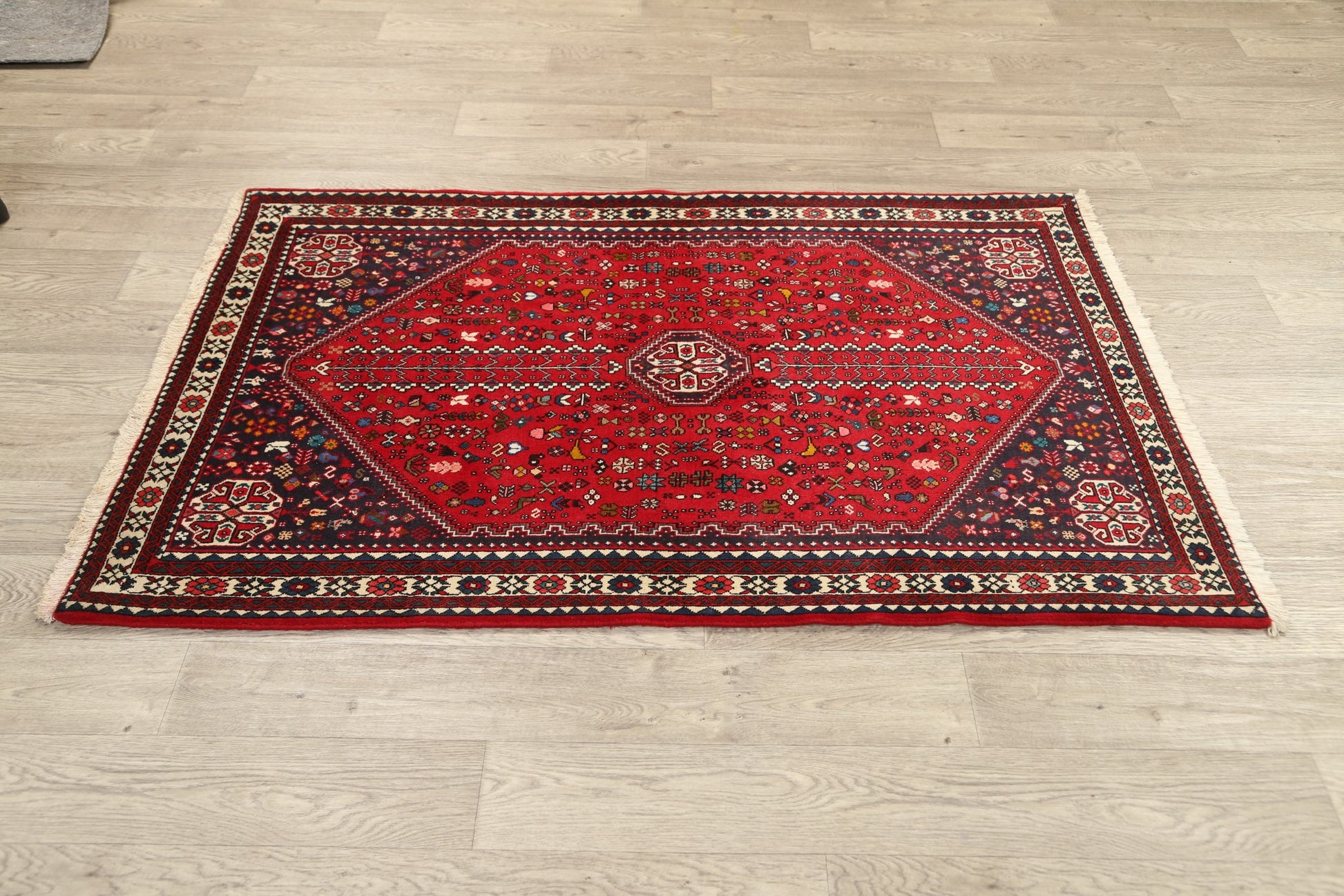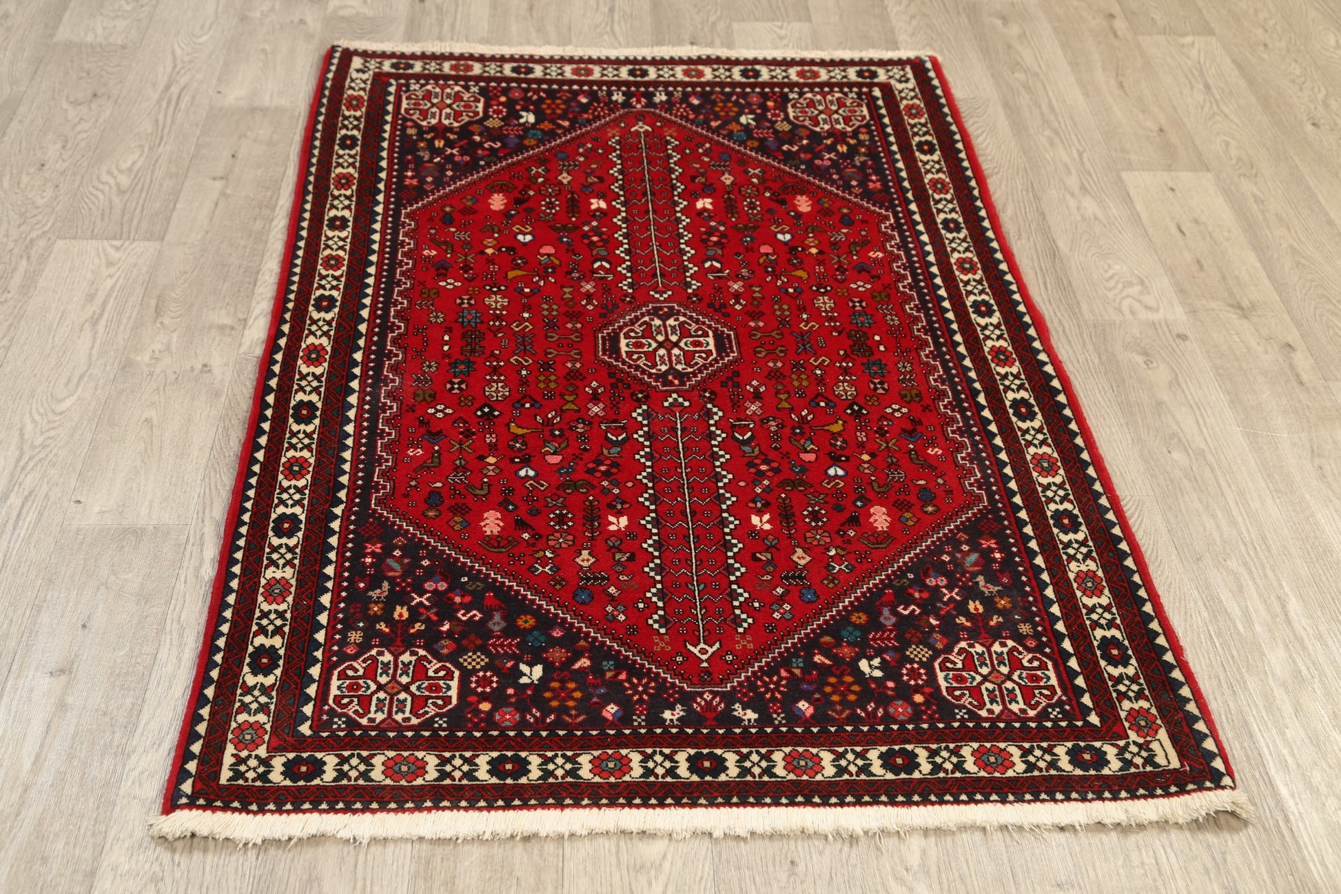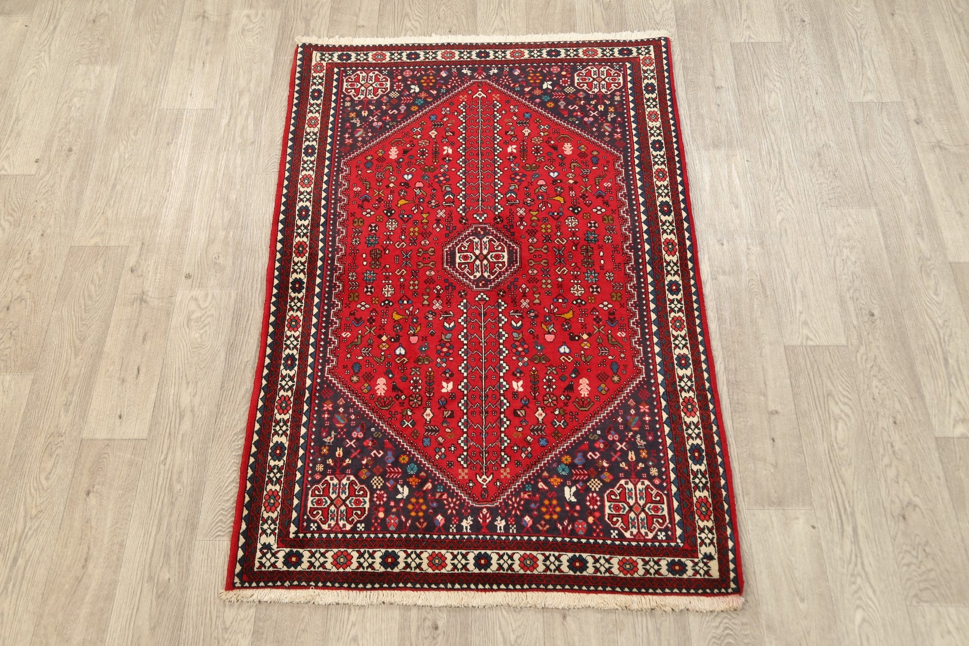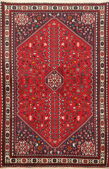 A Beautiful Genuine Persia ( Persia ) Abadeh ( Nafar ) rug is Hand Knotted by skillful weavers in Persia ( Persia ) with 100% Wool Material. This rug is in New, First Quality condition. dimensions are 5' 3'' X 3' 5'' in foot and 160 X 104 in centimeter. the primary color is Red.