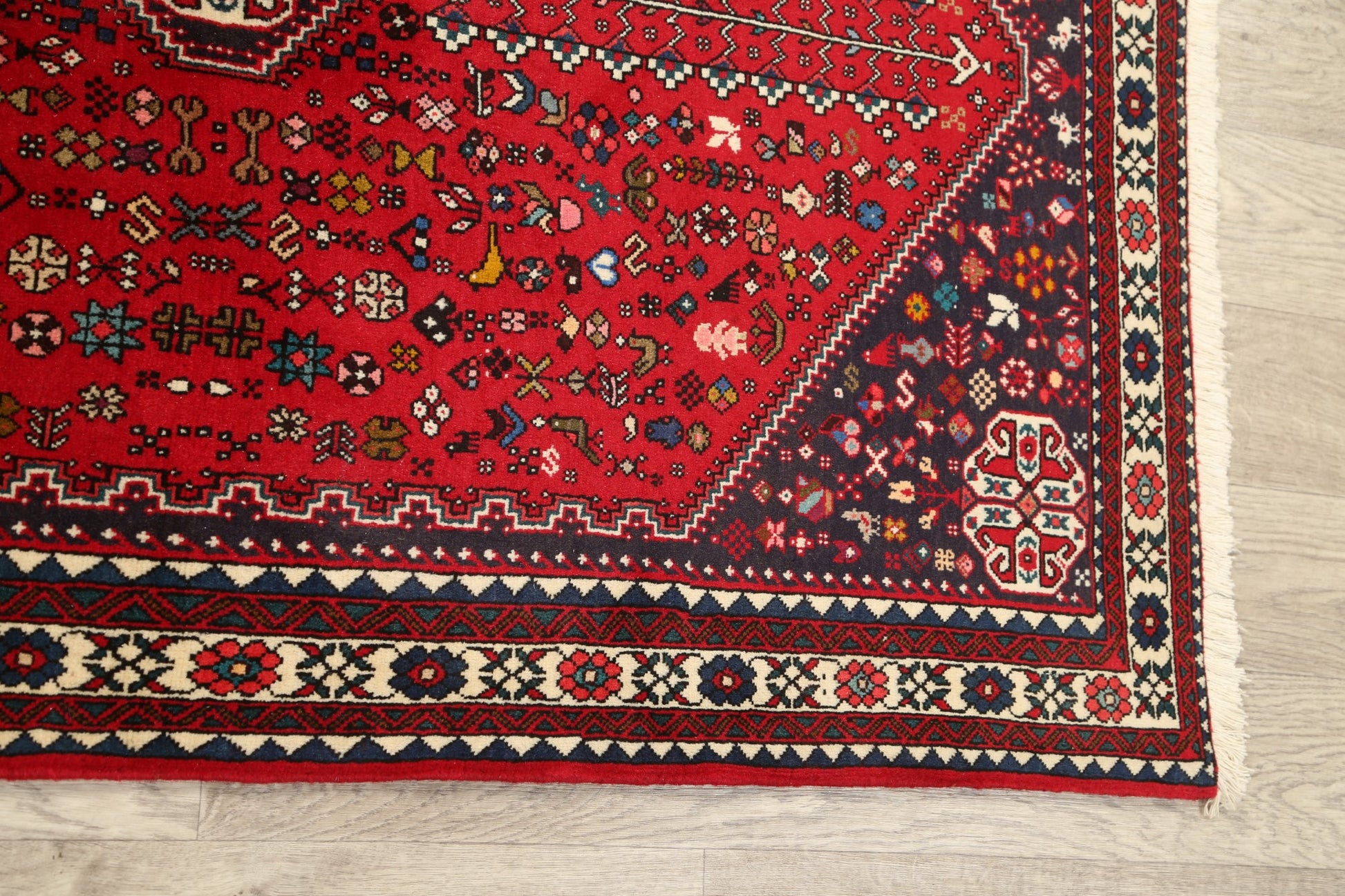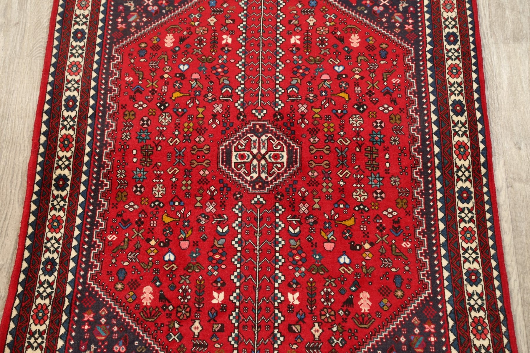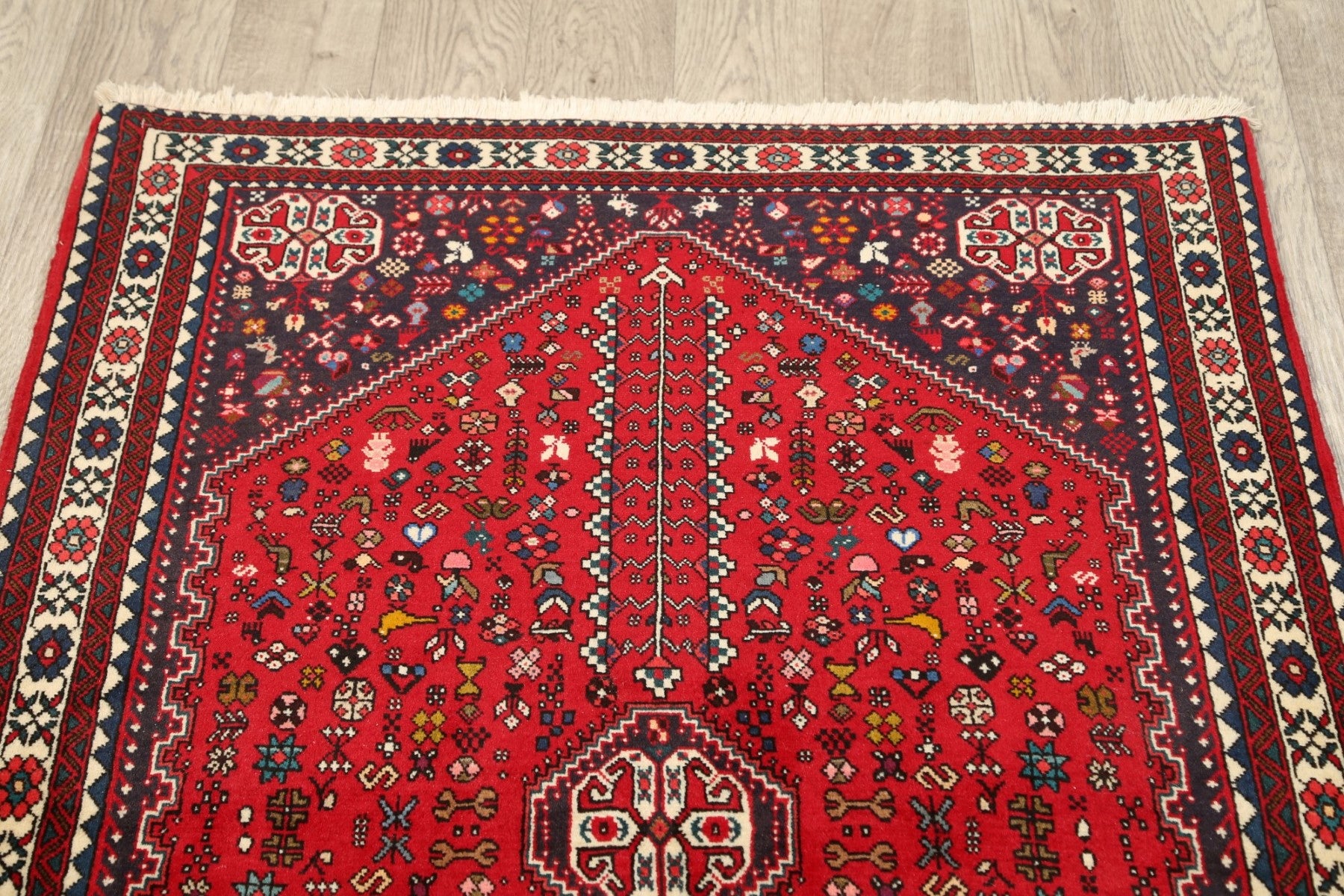 A Beautiful Genuine Persia ( Persia ) Abadeh ( Nafar ) rug is Hand Knotted by skillful weavers in Persia ( Persia ) with 100% Wool Material. This rug is in New, First Quality condition. dimensions are 5' 3'' X 3' 5'' in foot and 160 X 104 in centimeter. the primary color is Red.
