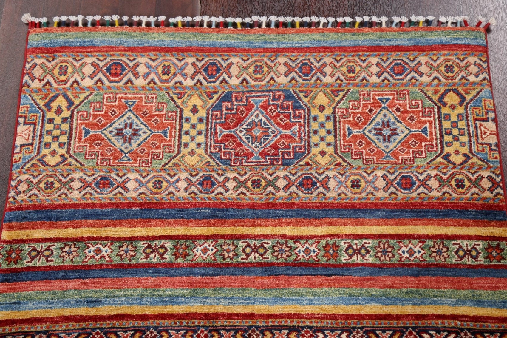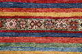 A Beautiful Genuine Pakistan Kazak rug is Hand Knotted by skillful weavers in Pakistan with 100% Wool Material. This rug is in New, First Quality condition. dimensions are 5' 0'' X 3' 1'' in foot and 152 X 94 in centimeter. the primary color is Multi-Colored.
