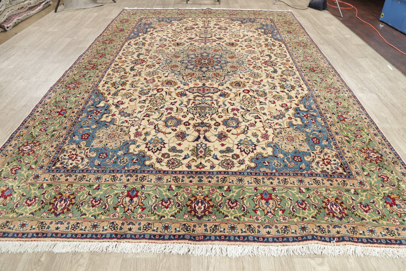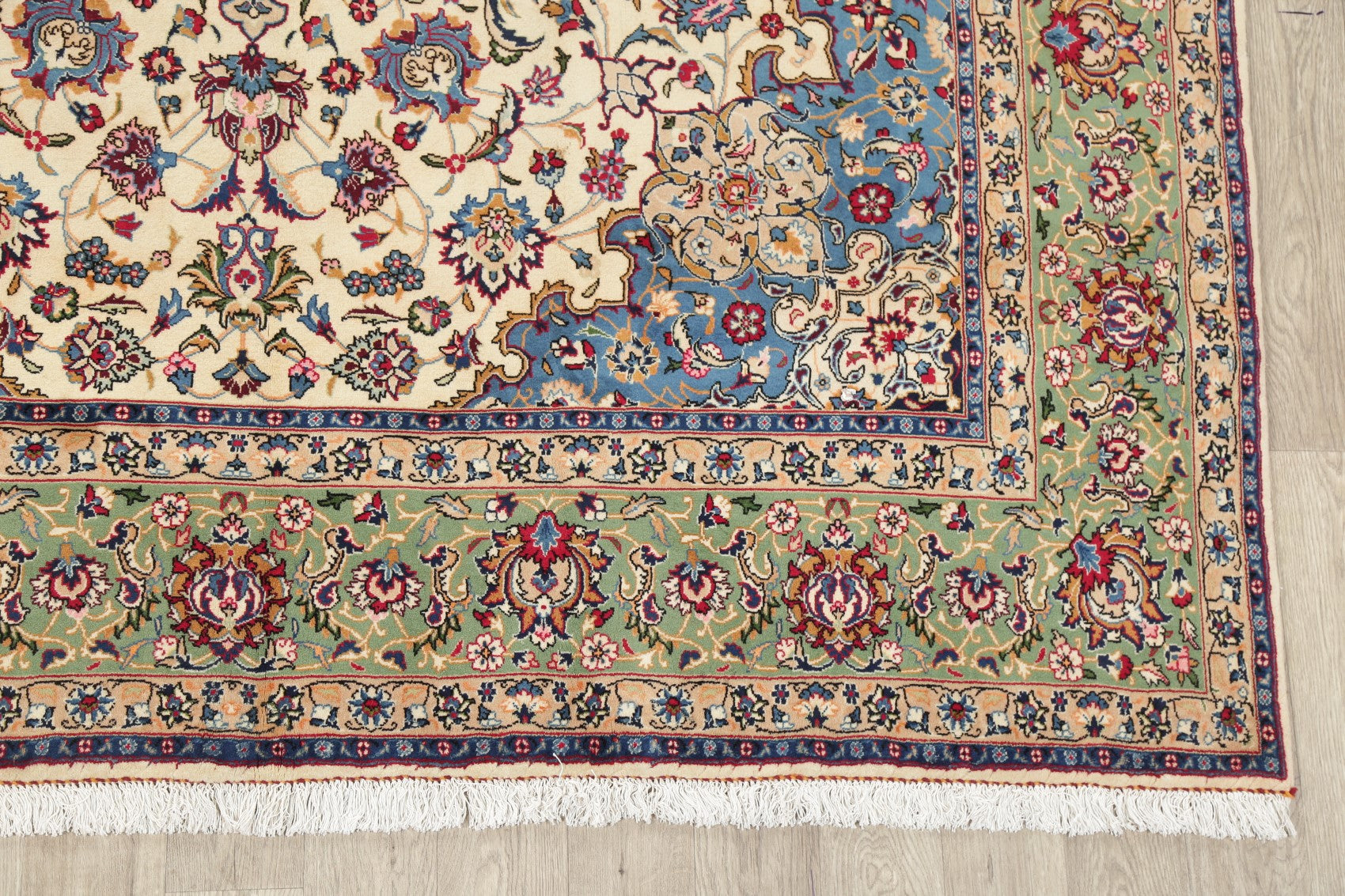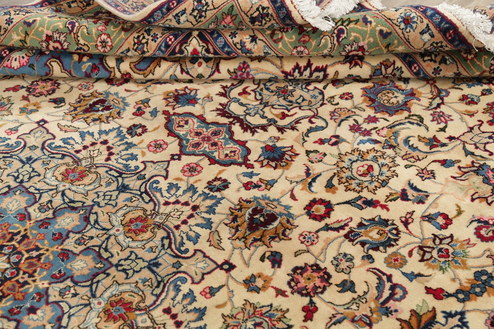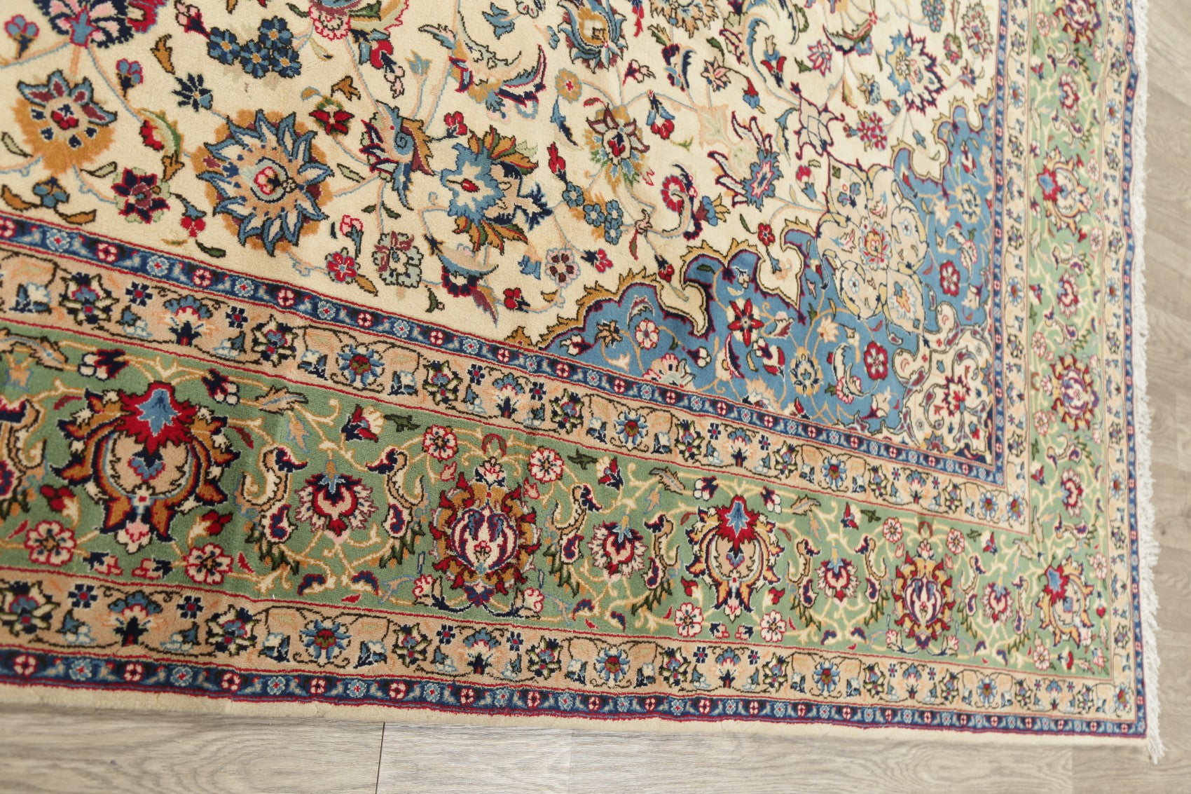 A Beautiful Genuine Persia ( Persia ) Kashan rug is Hand Knotted by skillful weavers in Persia ( Persia ) with 100% Kork Wool Material. This rug is in Excellent condition. dimensions are 11' 9'' X 8' 0'' in foot and 358 X 244 in centimeter. the primary color is Beige & Ivories.