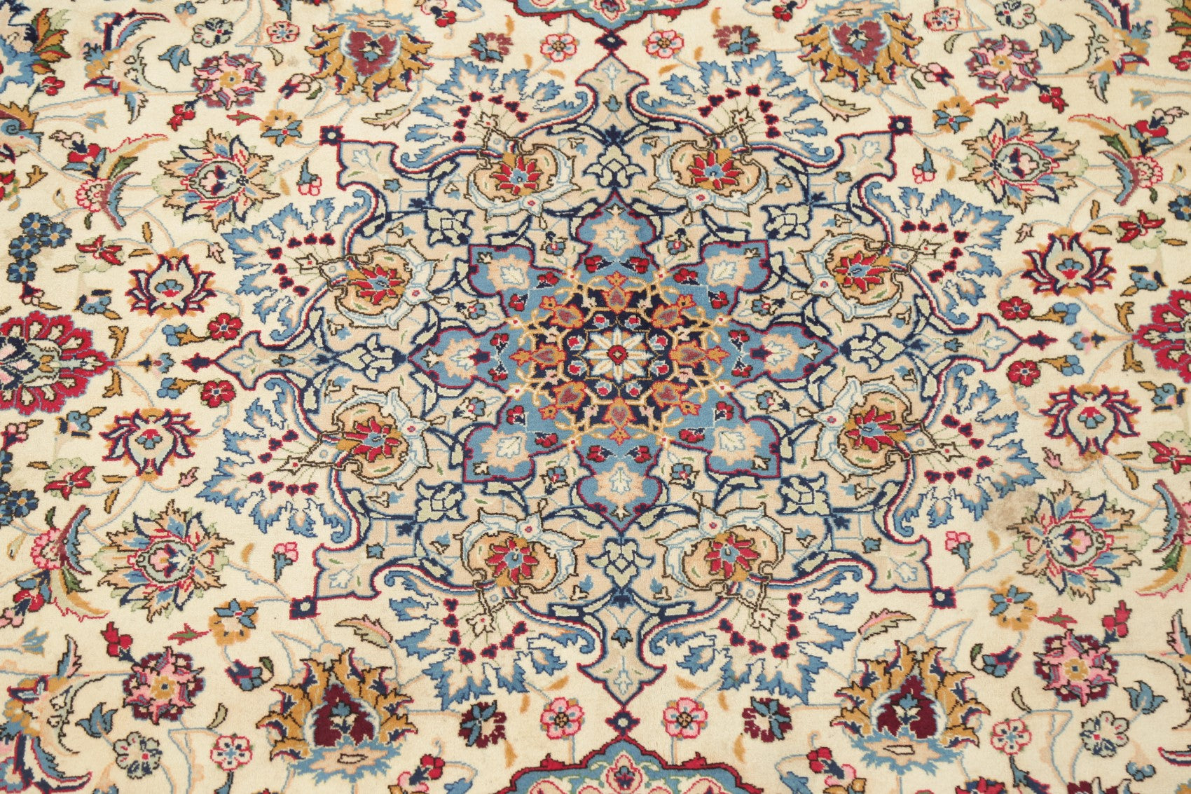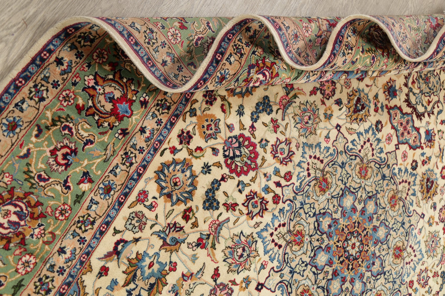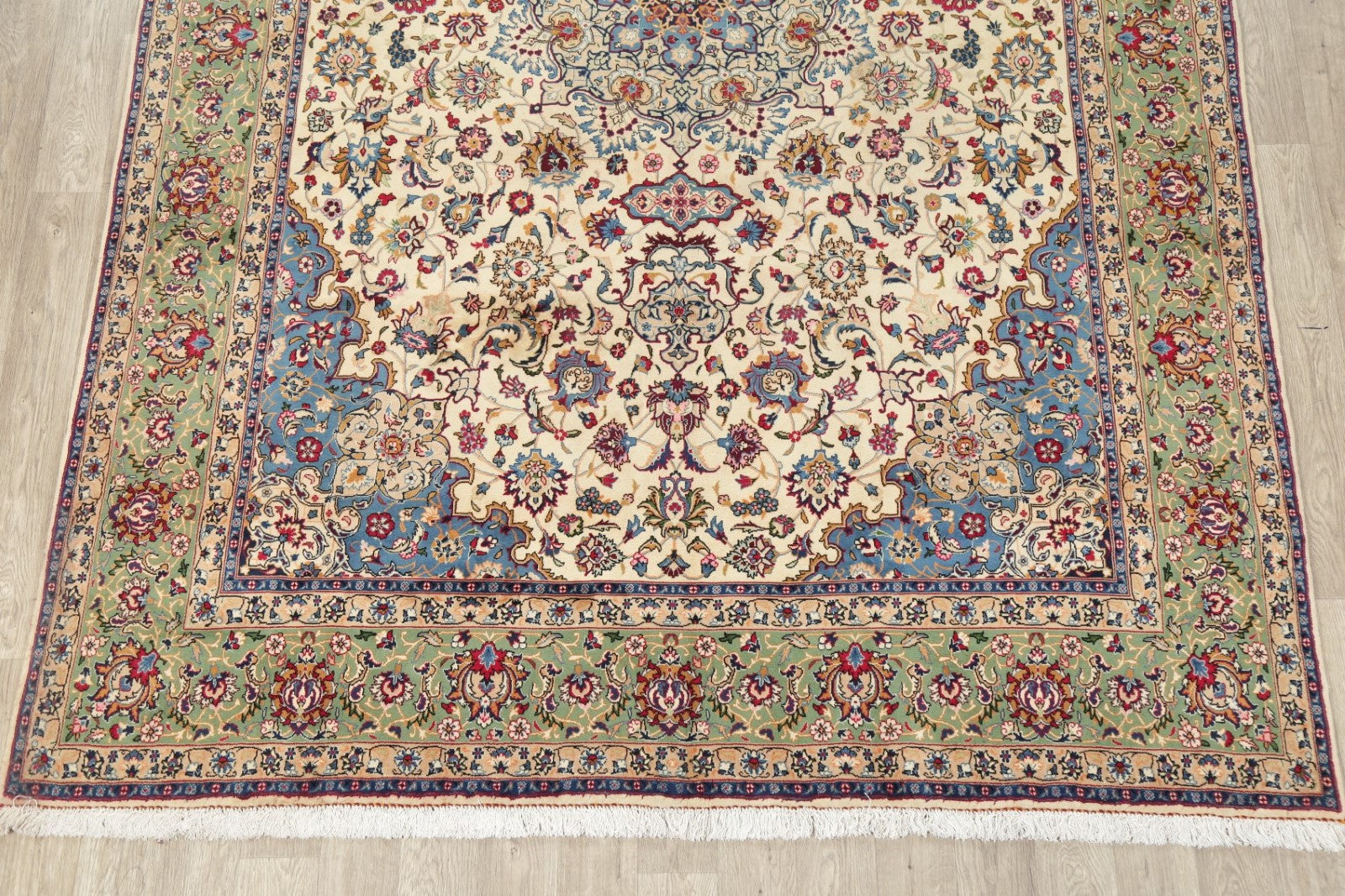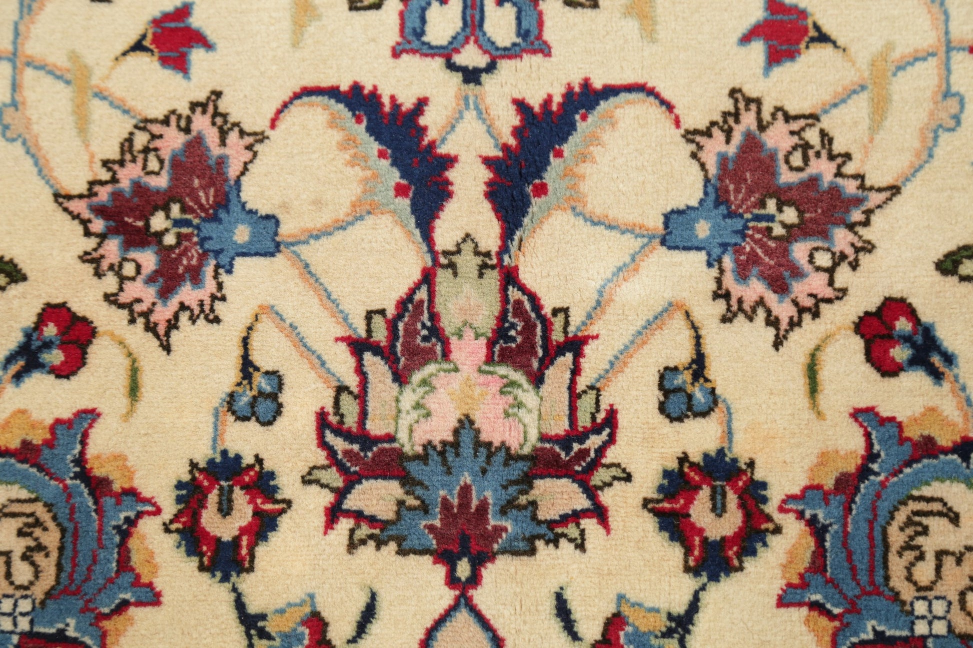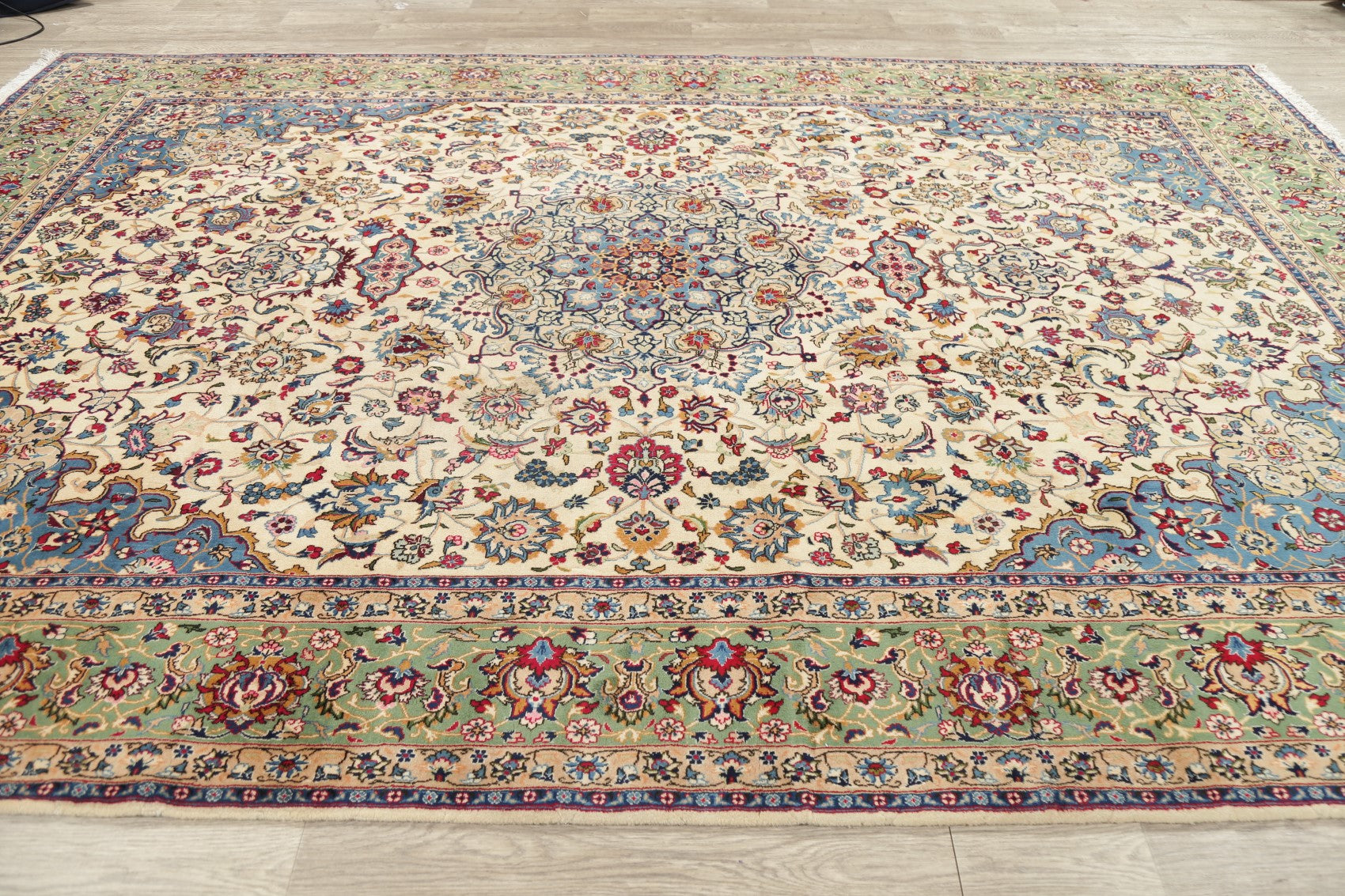 A Beautiful Genuine Persia ( Persia ) Kashan rug is Hand Knotted by skillful weavers in Persia ( Persia ) with 100% Kork Wool Material. This rug is in Excellent condition. dimensions are 11' 9'' X 8' 0'' in foot and 358 X 244 in centimeter. the primary color is Beige & Ivories.