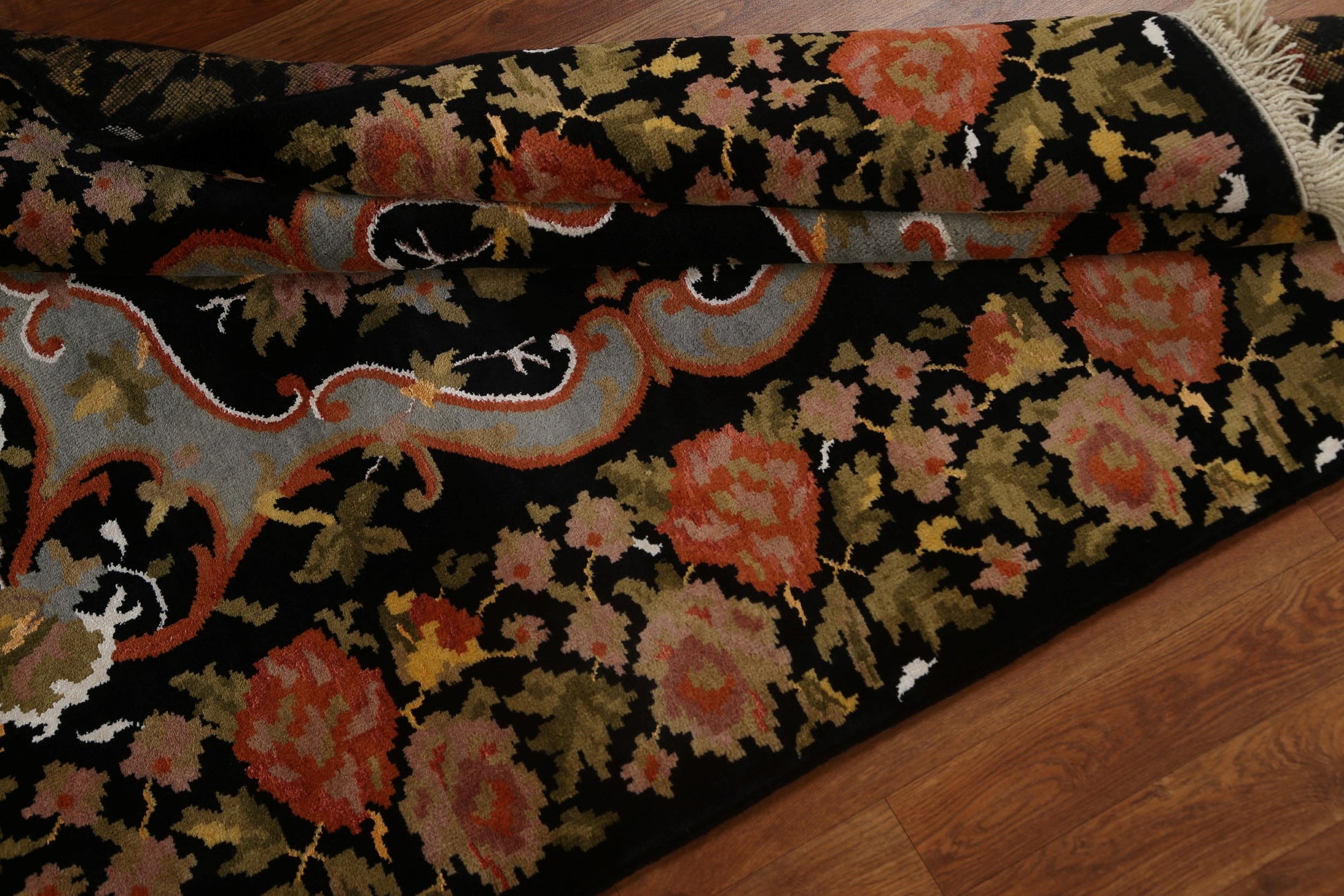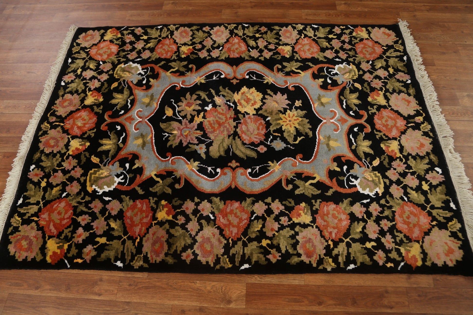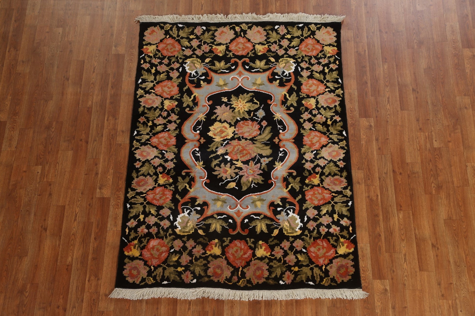 A Beautiful Genuine India Aubusson rug is Hand Knotted by skillful weavers in India with 100% Wool Material. This rug is in New, First Quality condition. dimensions are 6' 2'' X 4' 4'' in foot and 188 X 132 in centimeter. the primary color is Black.