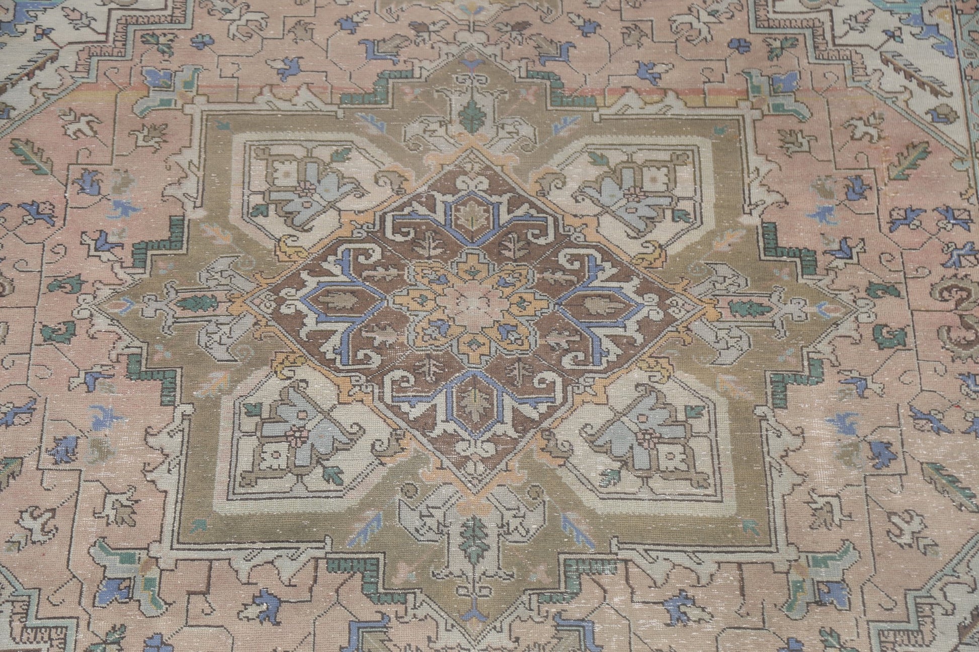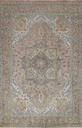 A Beautiful Genuine Persia ( Persia ) Heriz rug is Hand Knotted by skillful weavers in Persia ( Persia ) with 100% Wool Material. This rug is in Very Good ( Low Pile ) condition. dimensions are 9' 9'' X 6' 7'' in foot and 297 X 201 in centimeter. the primary color is Pink.