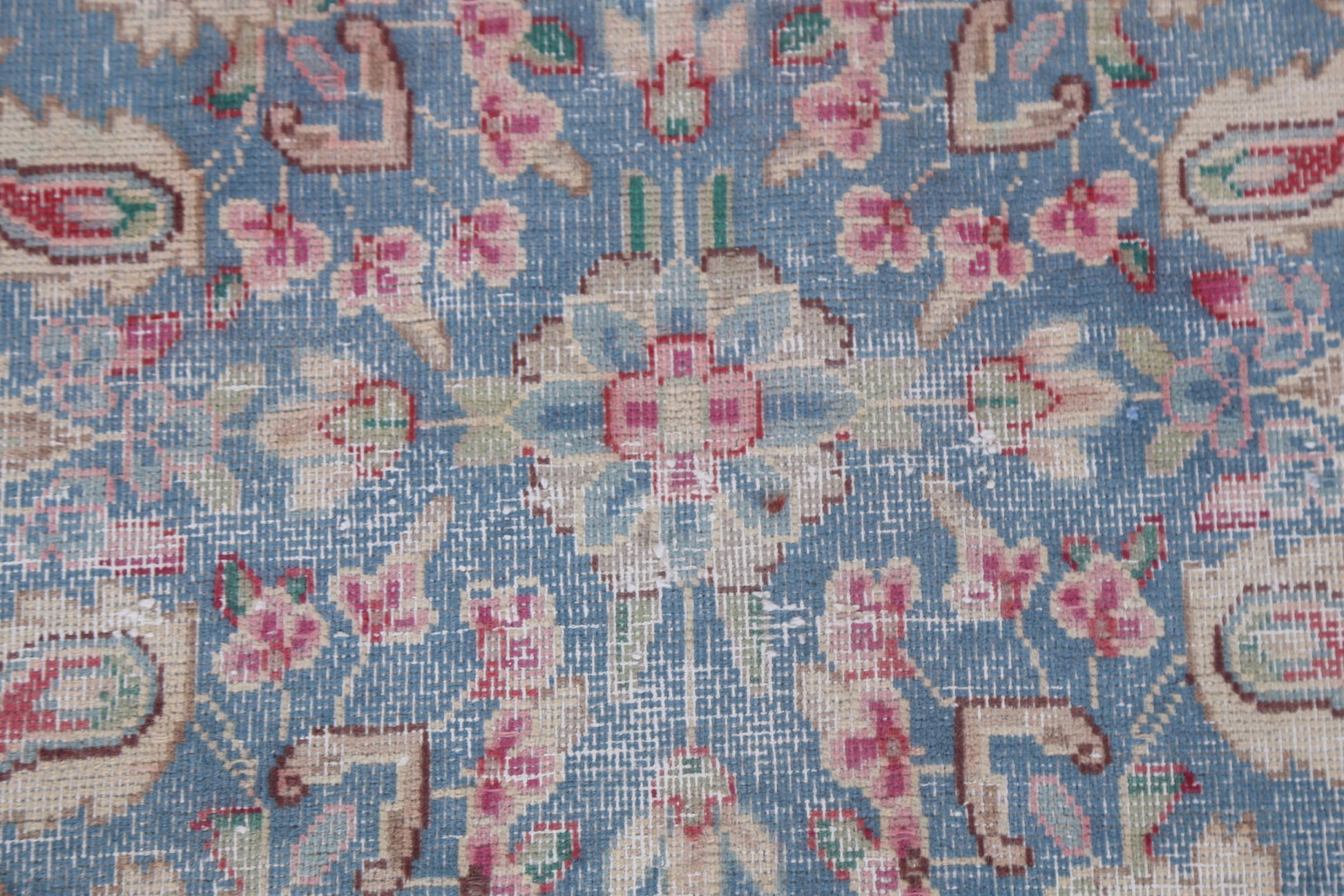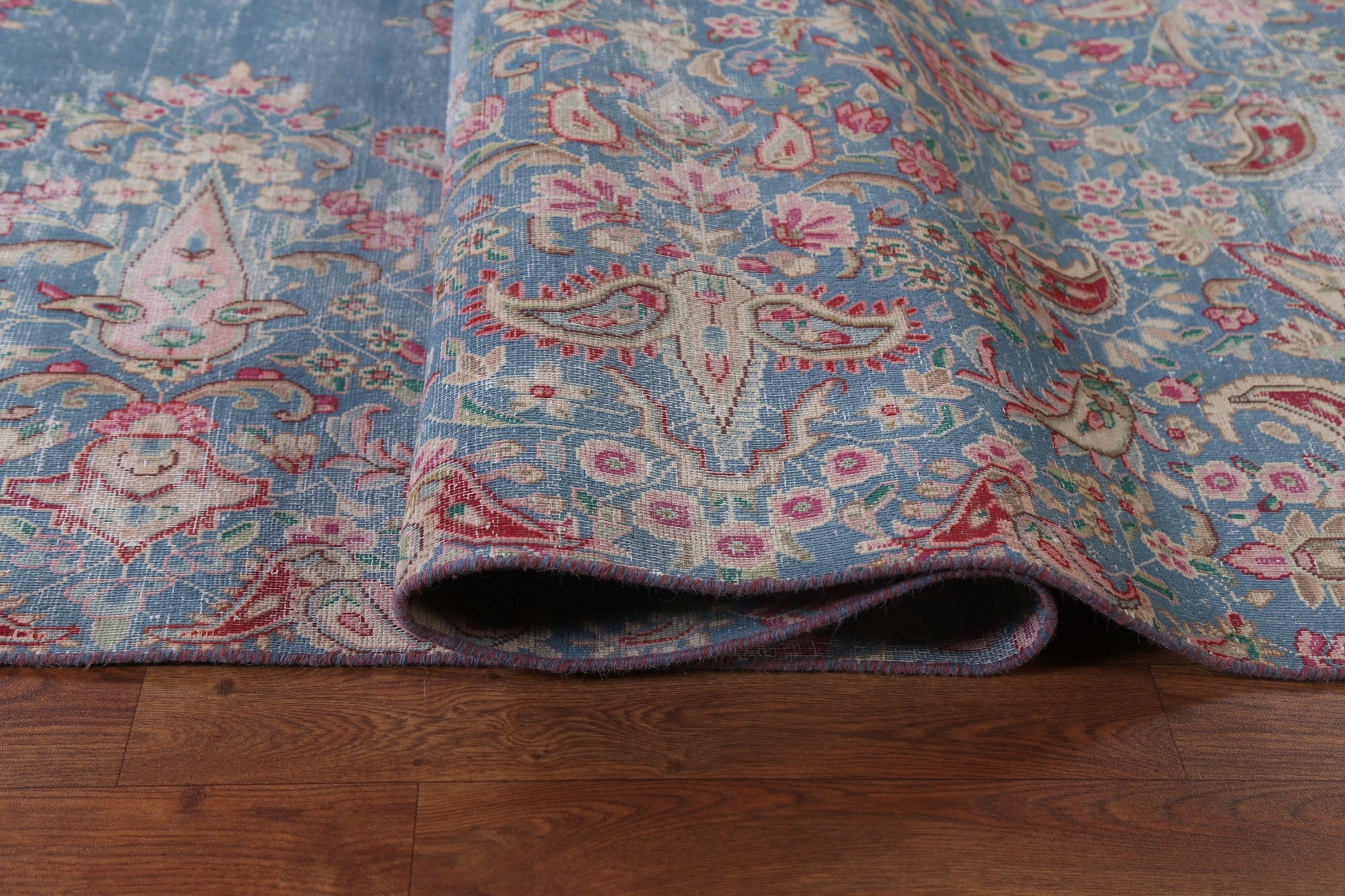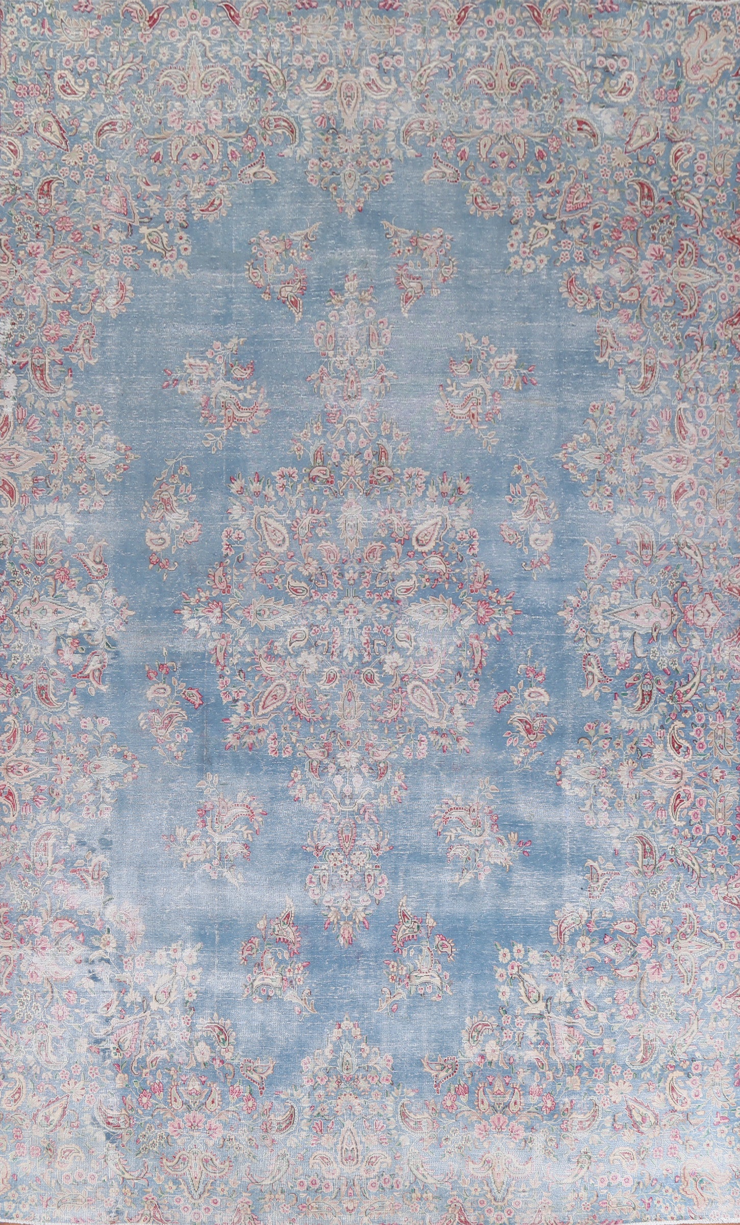 A Beautiful Genuine Persia ( Persia ) Kerman rug is Hand Knotted by skillful weavers in Persia ( Persia ) with 100% Wool Material. This rug is in Very Good (Evenly Low Pile) condition. dimensions are 13' 8'' X 8' 8'' in foot and 417 X 264 in centimeter. the primary color is Navy Blue & Blues.