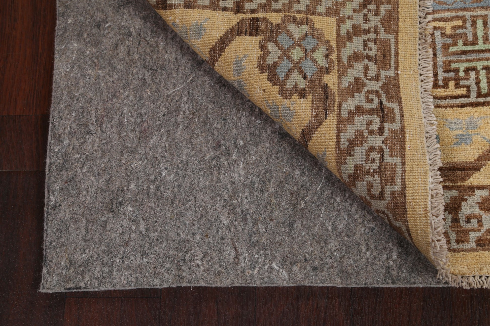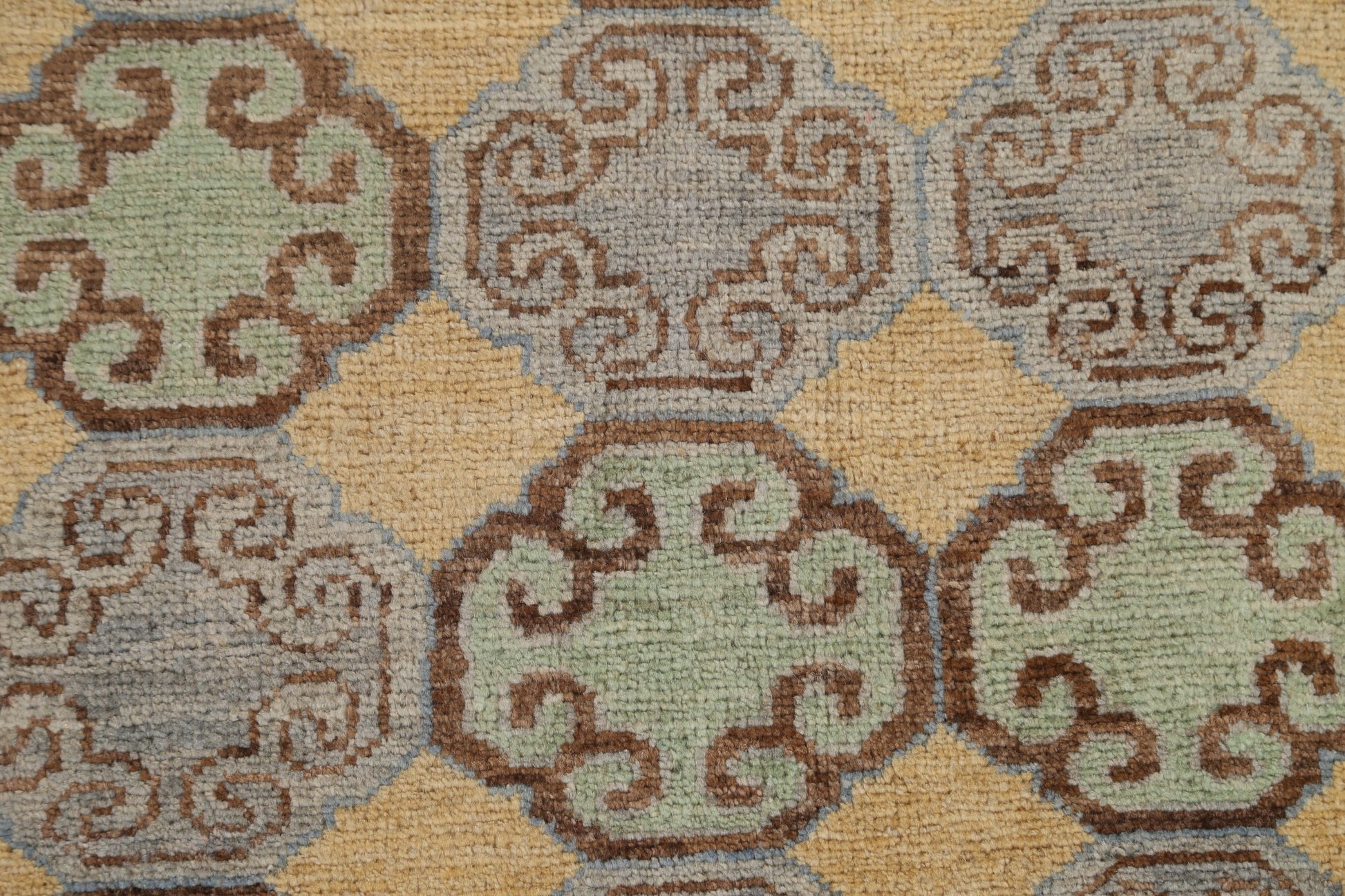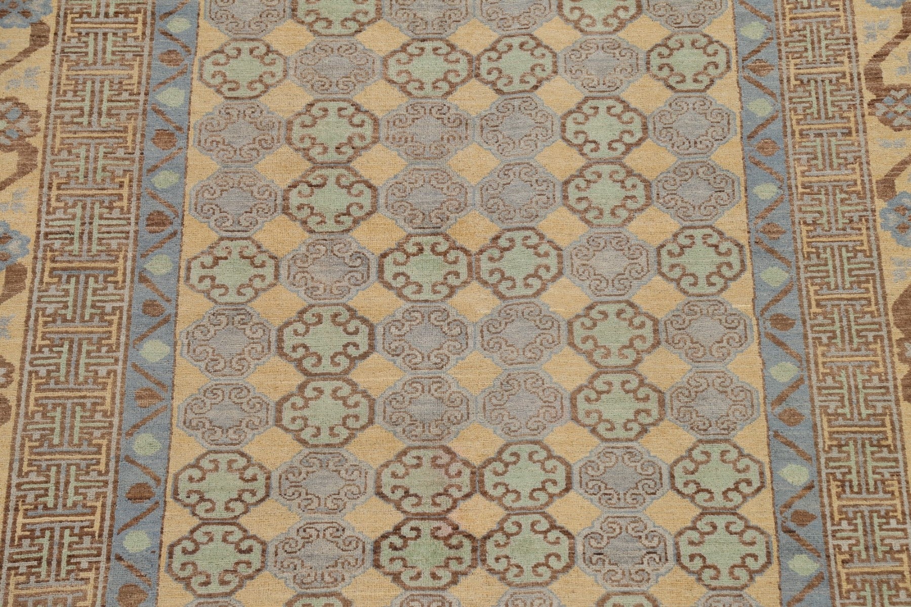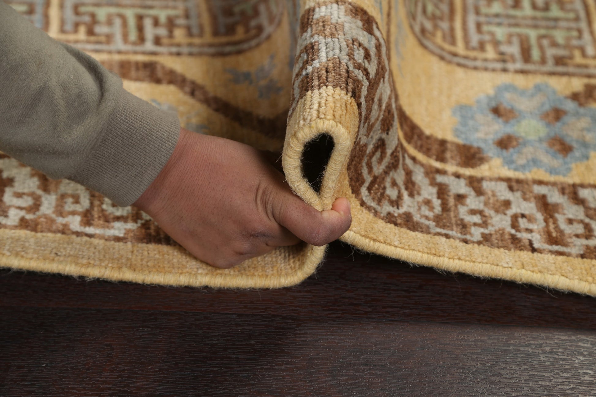 A Beautiful Genuine Pakistan Khotan rug is Hand Knotted by skillful weavers in Pakistan with 100% Wool Material. This rug is in New, First Quality condition. dimensions are 9' 11'' X 6' 5'' in foot and 302 X 196 in centimeter. the primary color is Yellow & Gold.