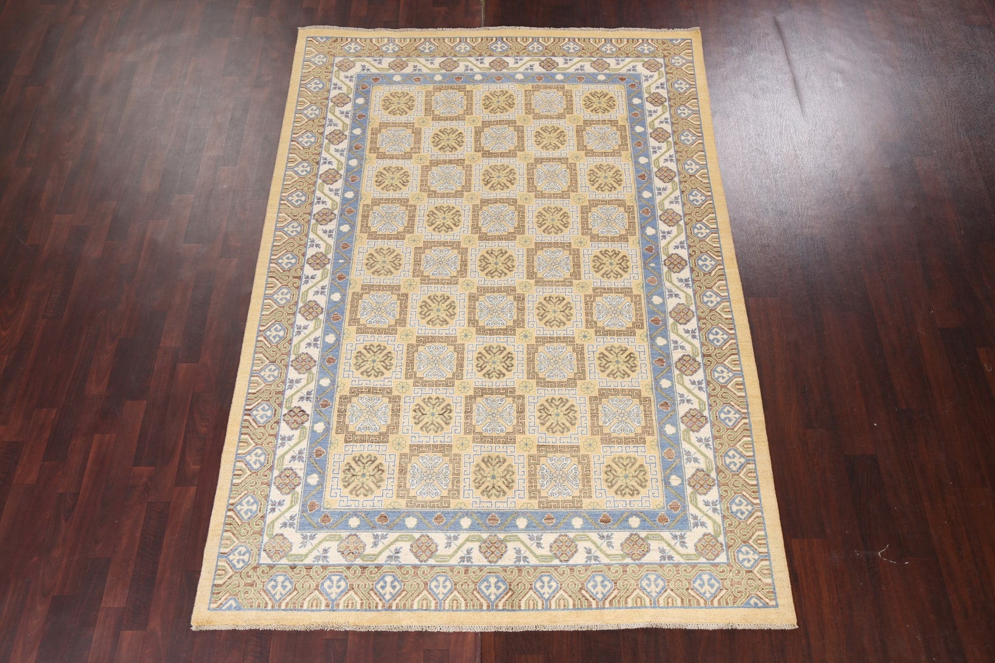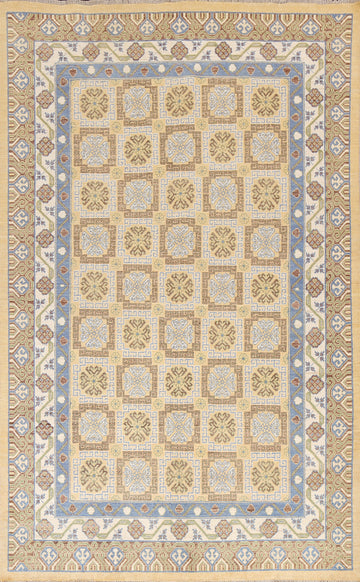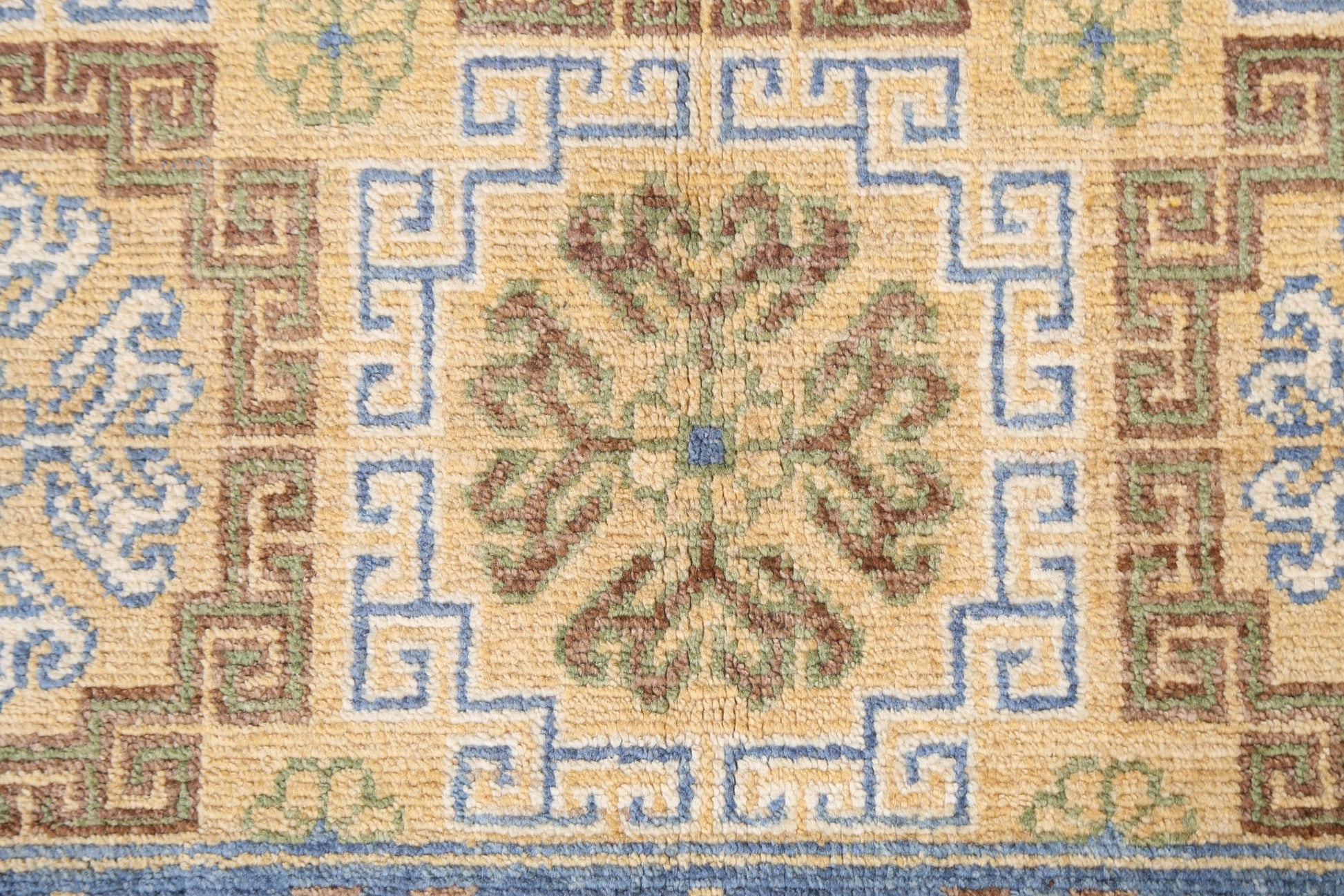 A Beautiful Genuine Pakistan Khotan rug is Hand Knotted by skillful weavers in Pakistan with 100% Wool Material. This rug is in New, First Quality condition. dimensions are 9' 5'' X 6' 7'' in foot and 287 X 201 in centimeter. the primary color is Yellow & Gold.