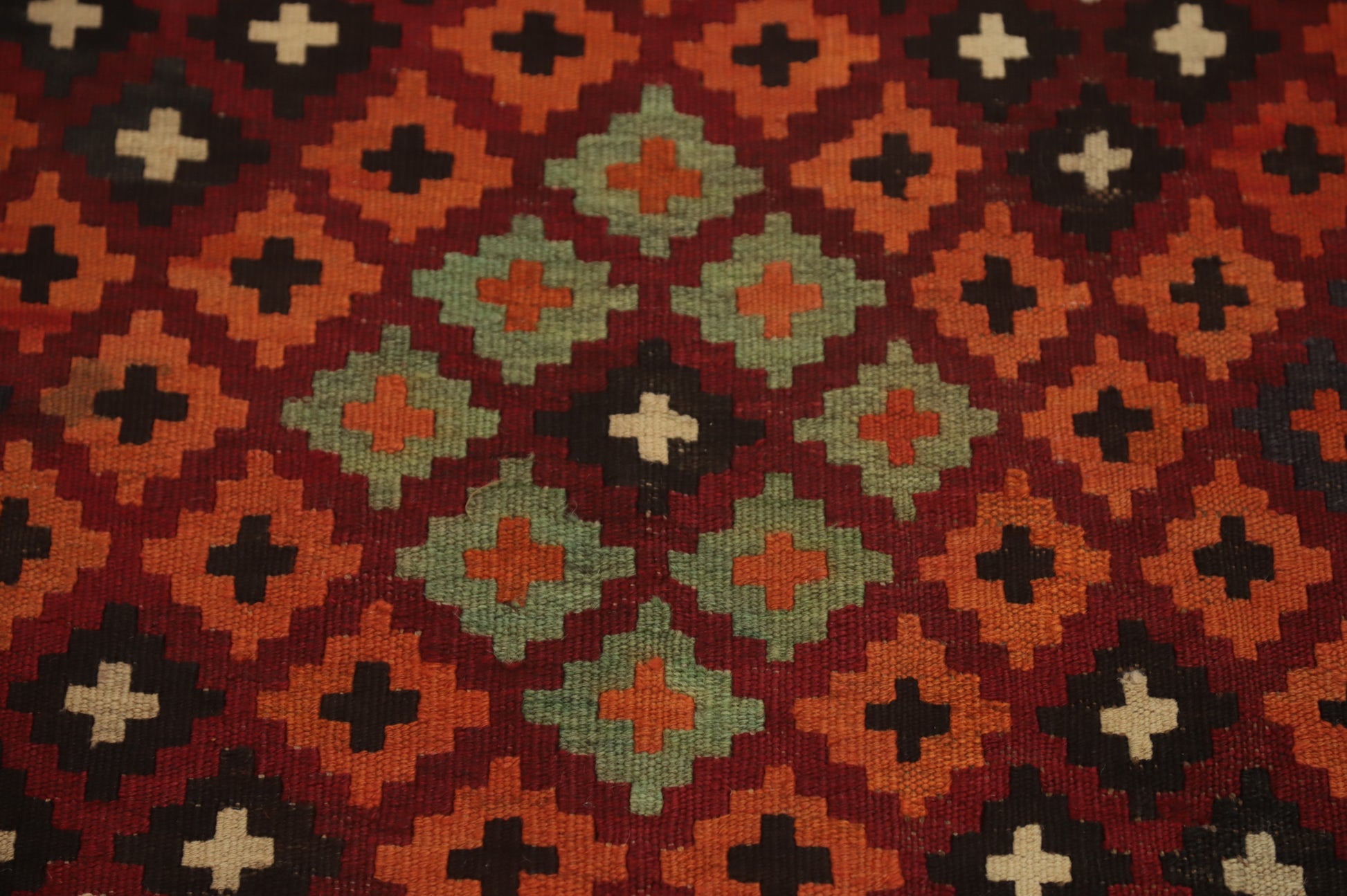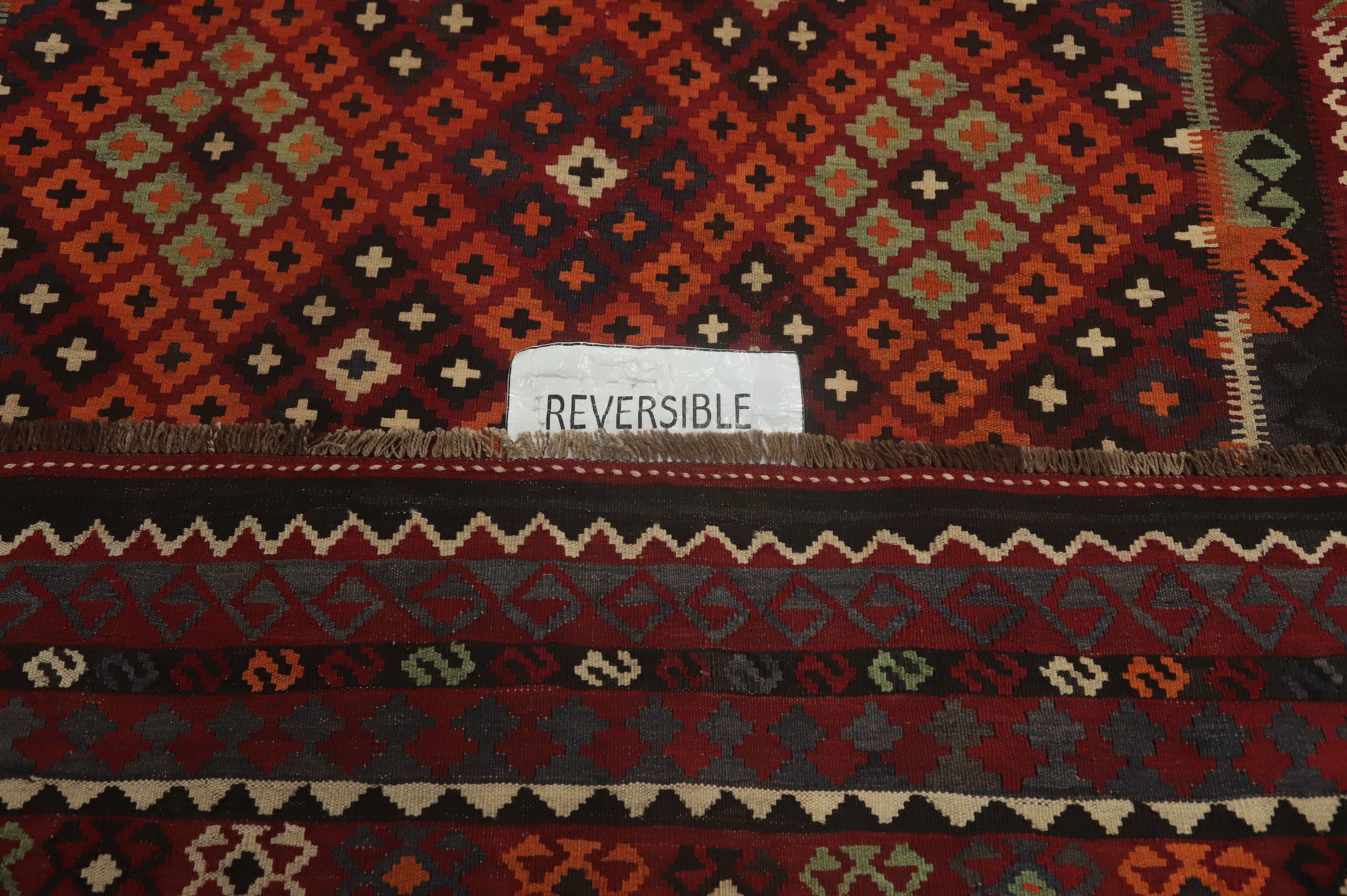 A Beautiful Genuine Pakistan Kilim rug is Hand Woven by skillful weavers in Pakistan with 100% Wool Material. This rug is in Very Good (Stain) condition. dimensions are 13' 1'' X 9' 2'' in foot and  399 X 279 in centimeter. the primary color is Oranges & Rust.
