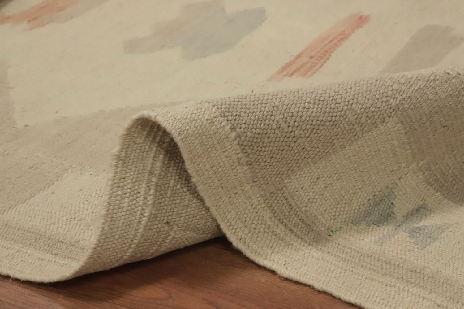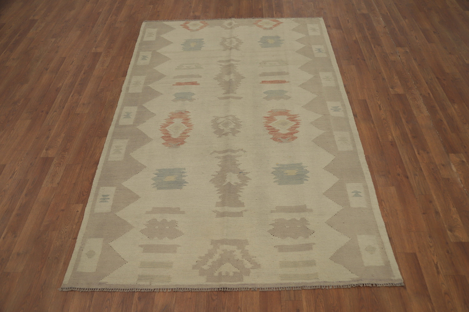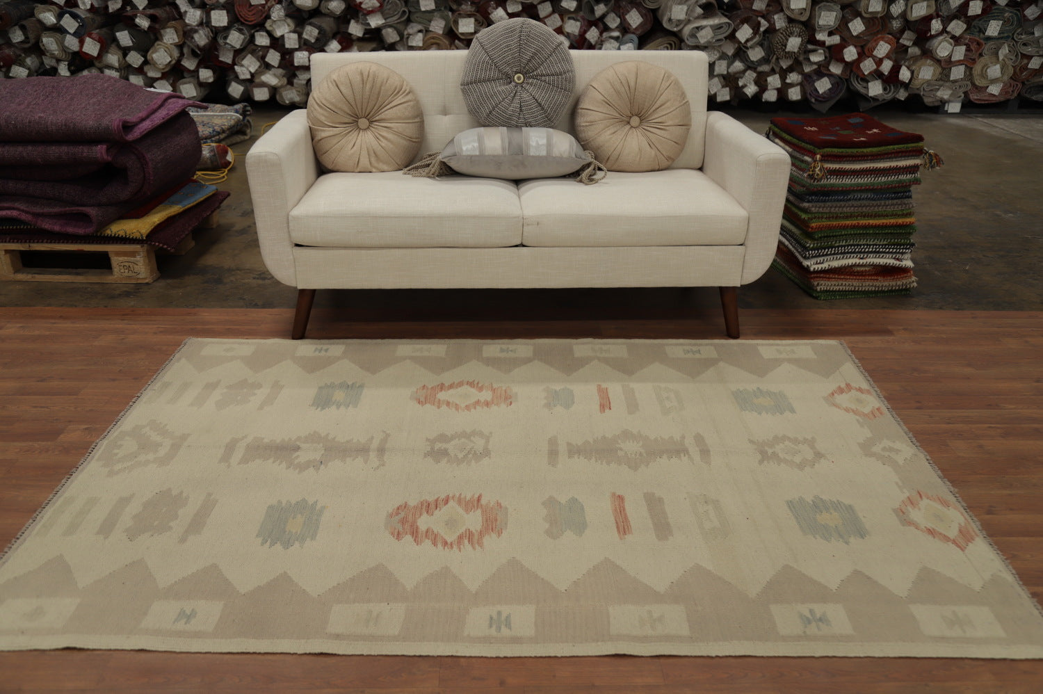 A Beautiful Genuine Pakistan Kilim rug is Hand Woven by skillful weavers in Pakistan with 100% Wool Material. This rug is in New, First Quality condition. dimensions are 7' 0'' X 4' 6'' in foot and 213 X 137 in centimeter. the primary color is Beige & Ivories.