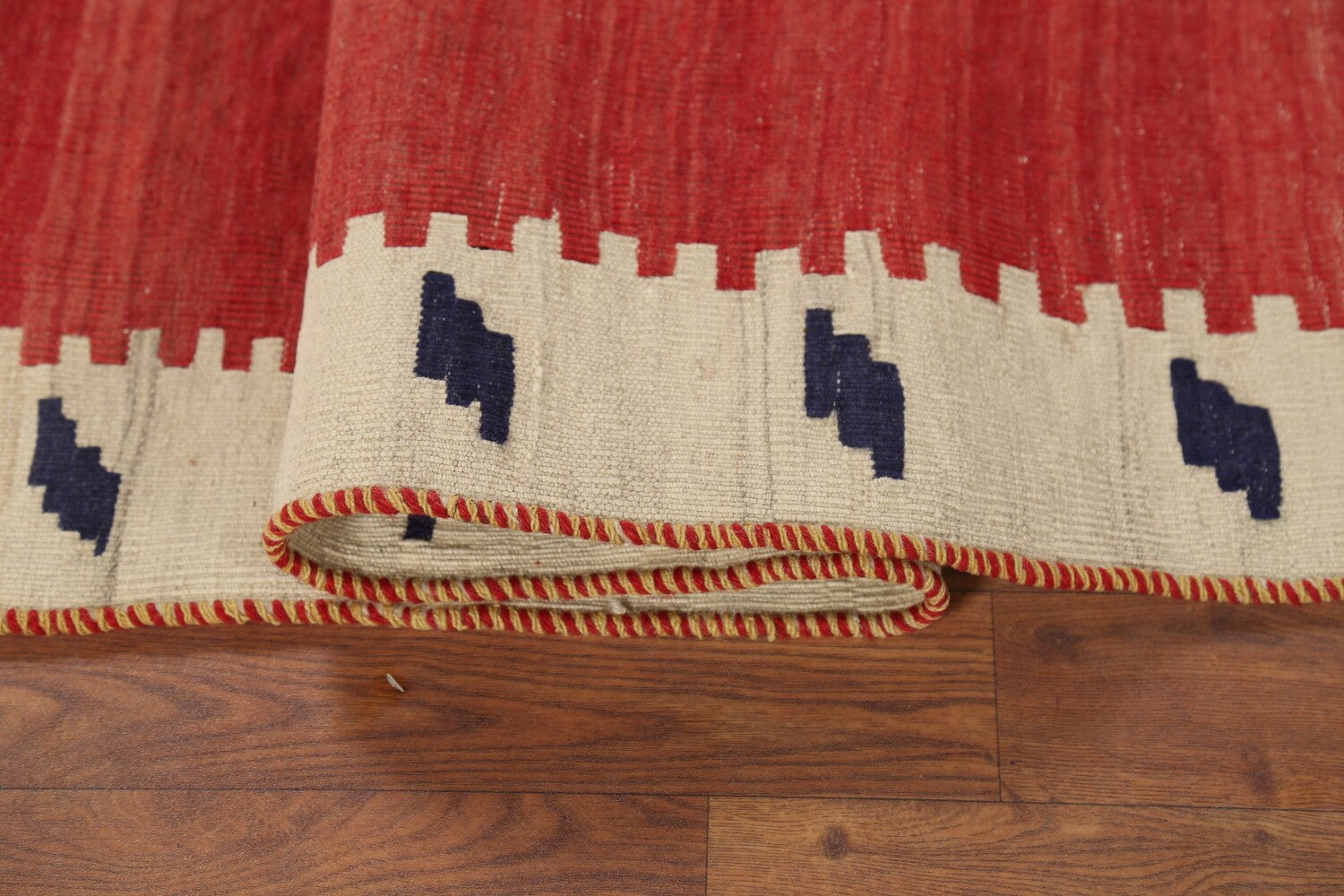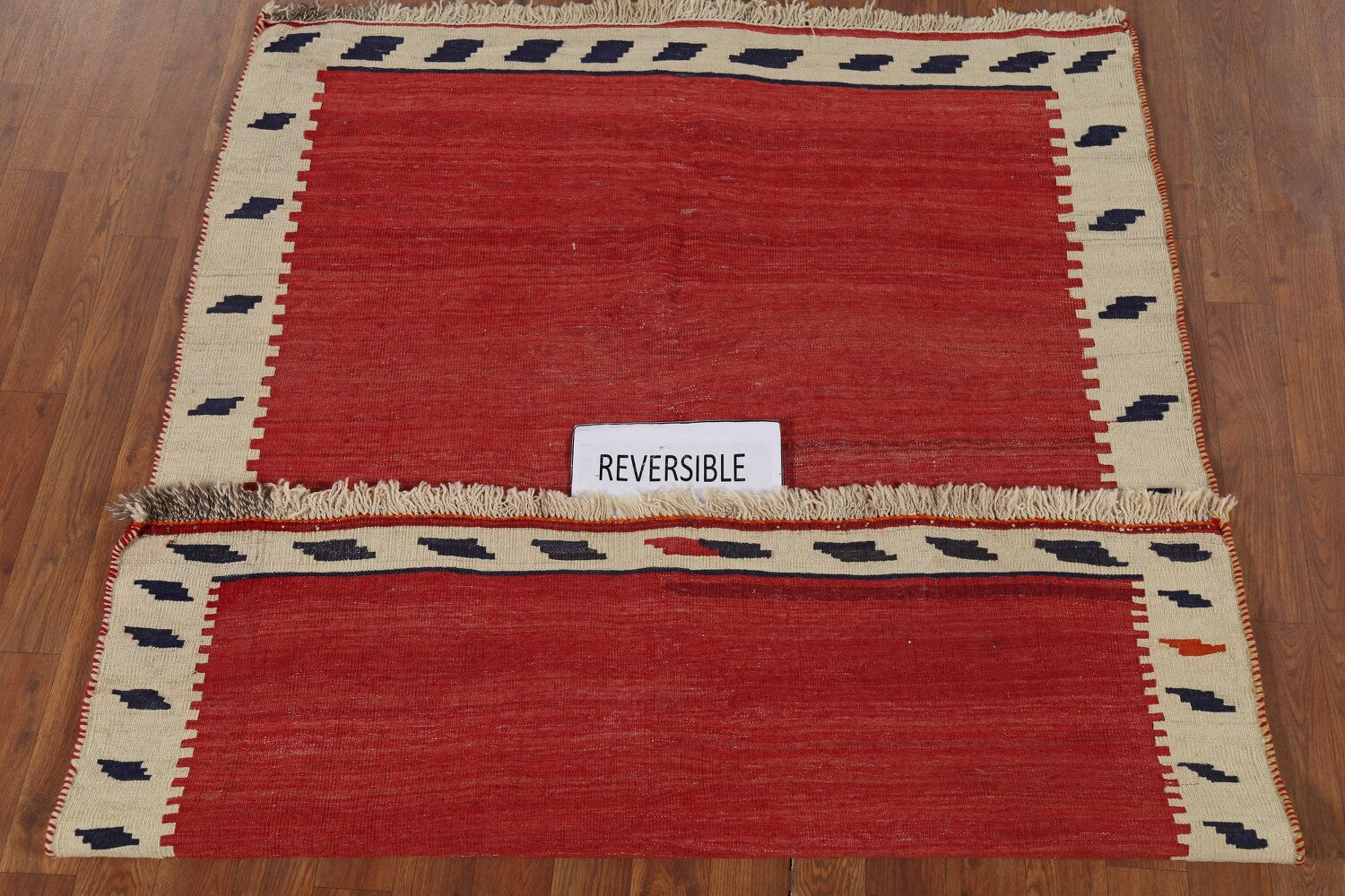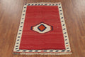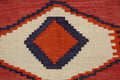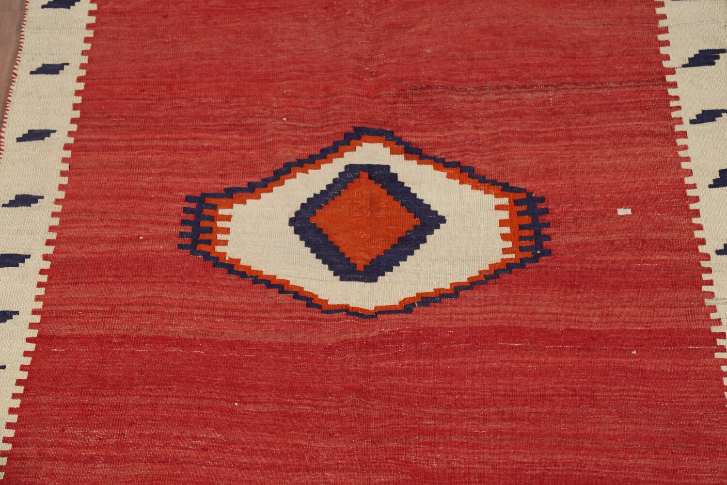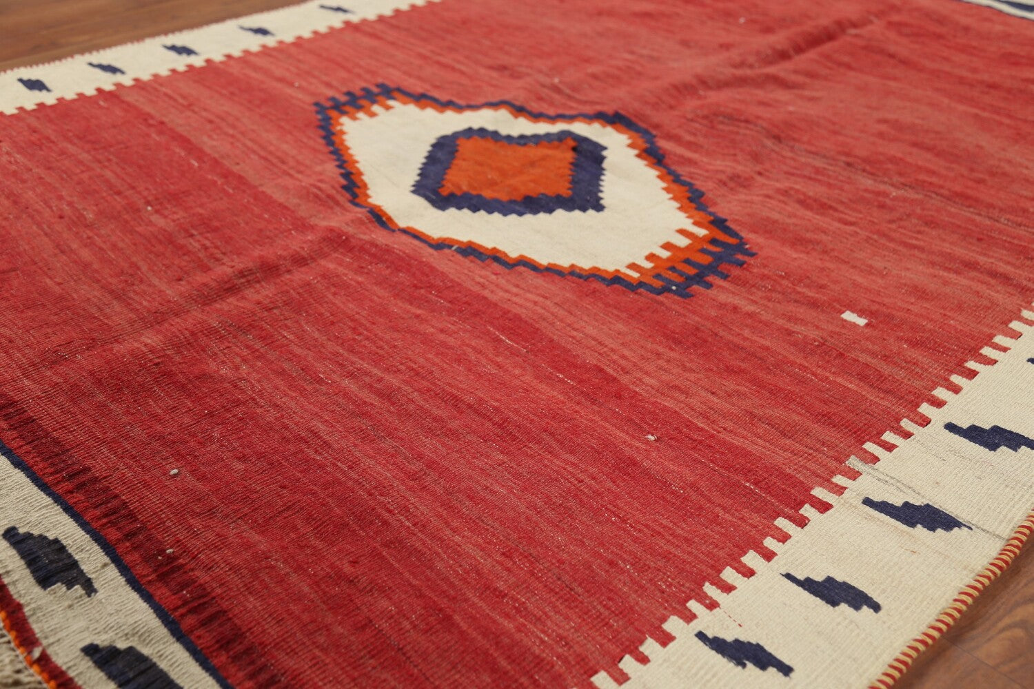 A Beautiful Genuine Persia ( Persia ) Kilim (Qashqai) rug is Hand Woven by skillful weavers in Persia ( Persia ) with 100% Wool Material. This rug is in Very Good (Abrash) condition. dimensions are 5' 6'' X 4' 3'' in foot and 168 X 130 in centimeter. the primary color is Red.