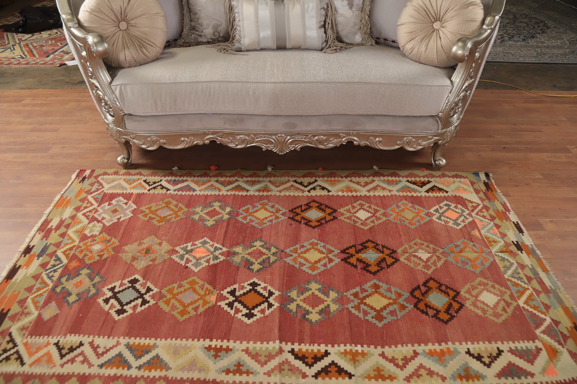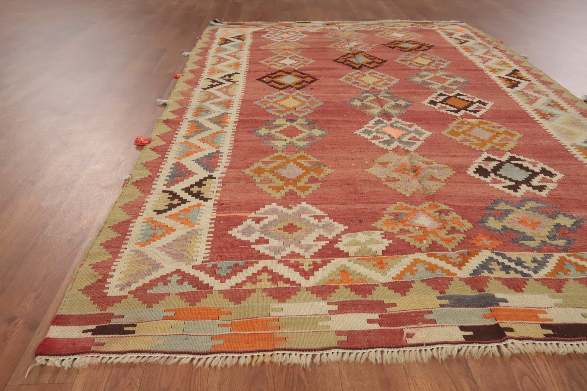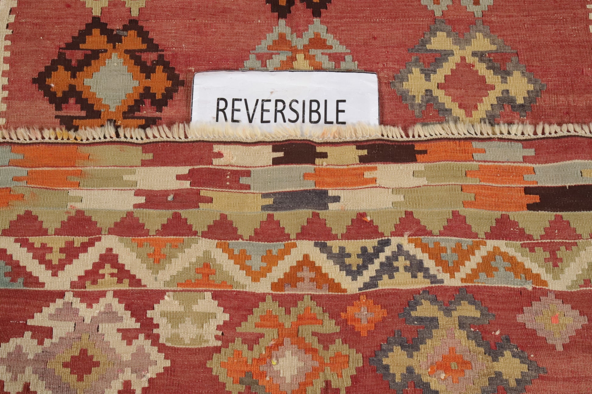 A Beautiful Genuine Persia ( Persia ) Kilim (Qashqai) rug is Hand Woven by skillful weavers in Persia ( Persia ) with 100% Wool Material. This rug is in Very Good (Abrash-Repair) condition. dimensions are 7' 0'' X 3' 11'' in foot and  213 X 119 in centimeter. the primary color is Oranges & Rust.
