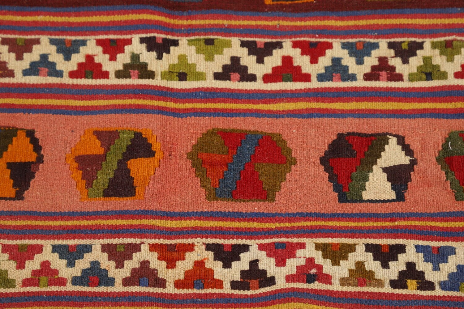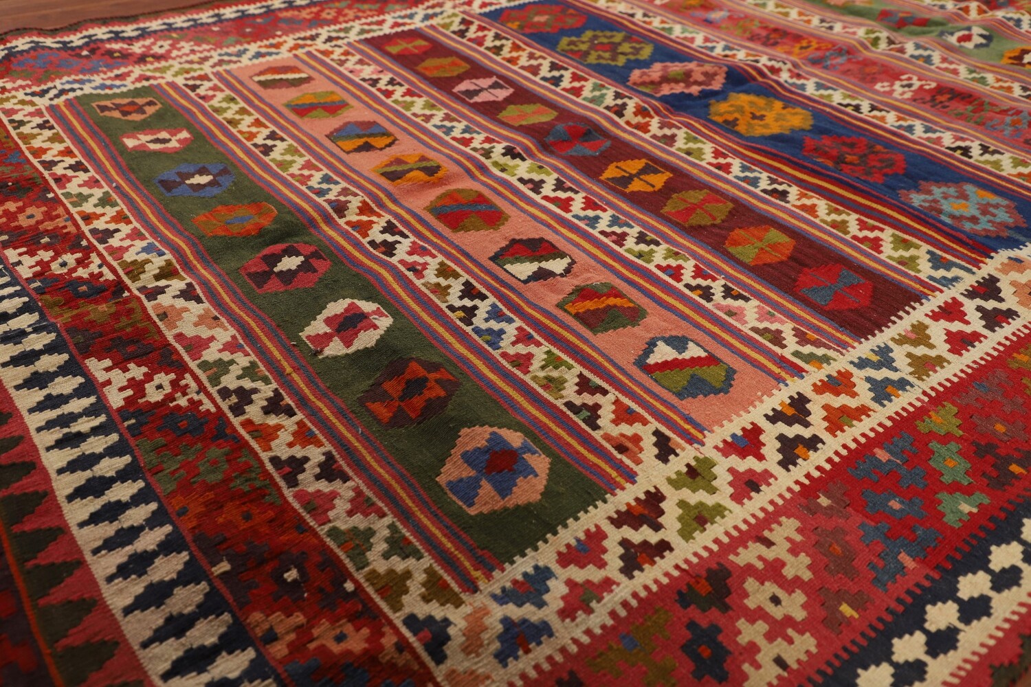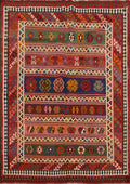 A Beautiful Genuine Persia ( Persia ) Kilim (Qashqai) rug is Hand Woven by skillful weavers in Persia ( Persia ) with 100% Wool Material. This rug is in Very Good (Abrash) condition. dimensions are 6' 5'' X 4' 11'' in foot and 196 X 150 in centimeter. the primary color is Red.