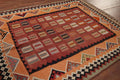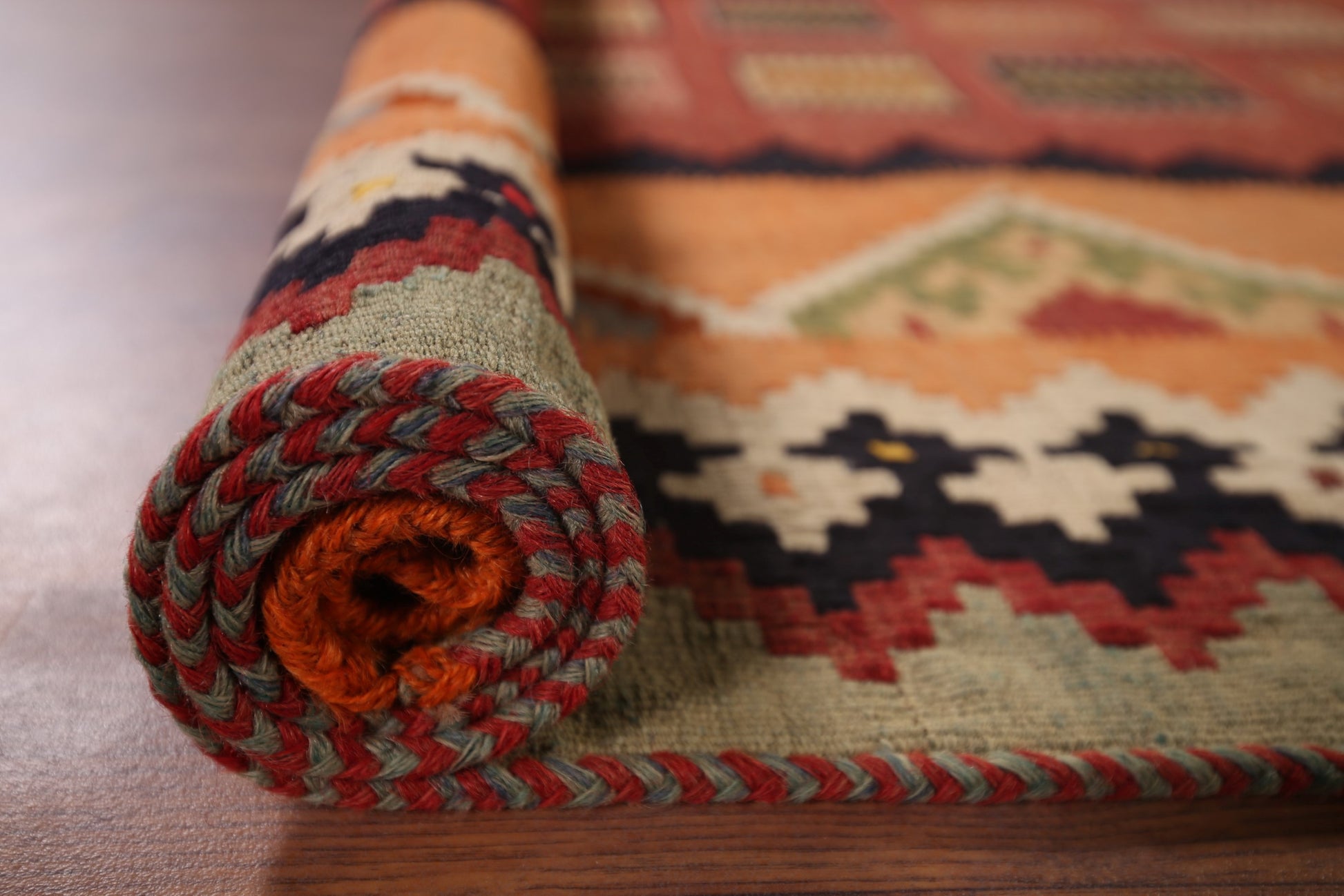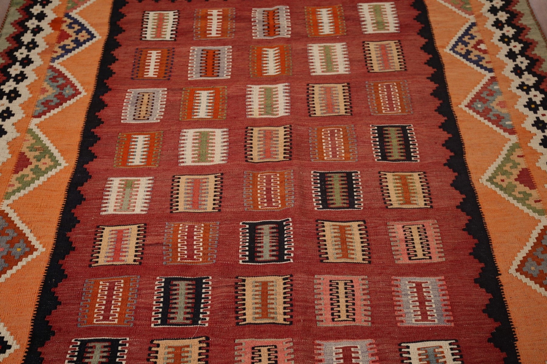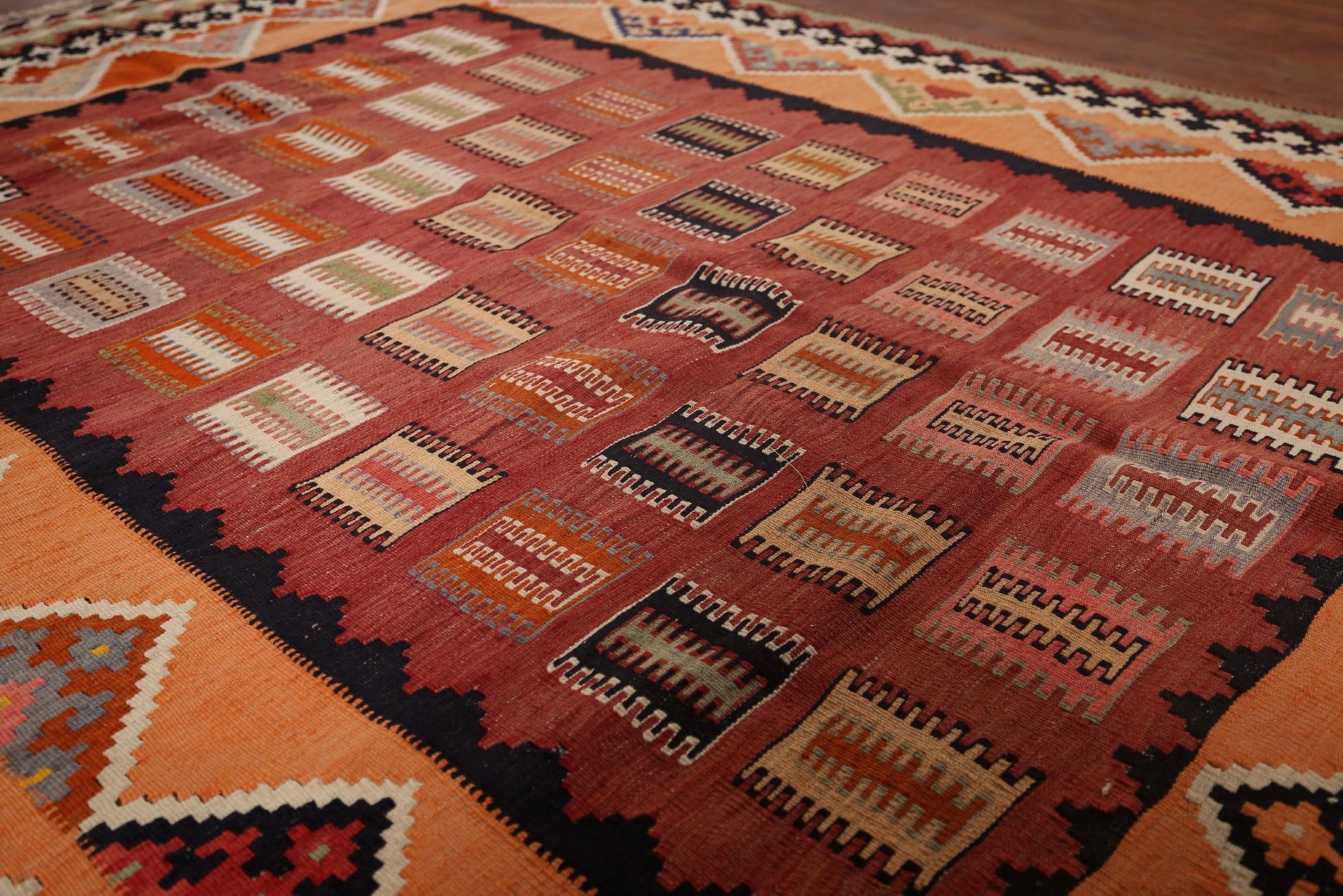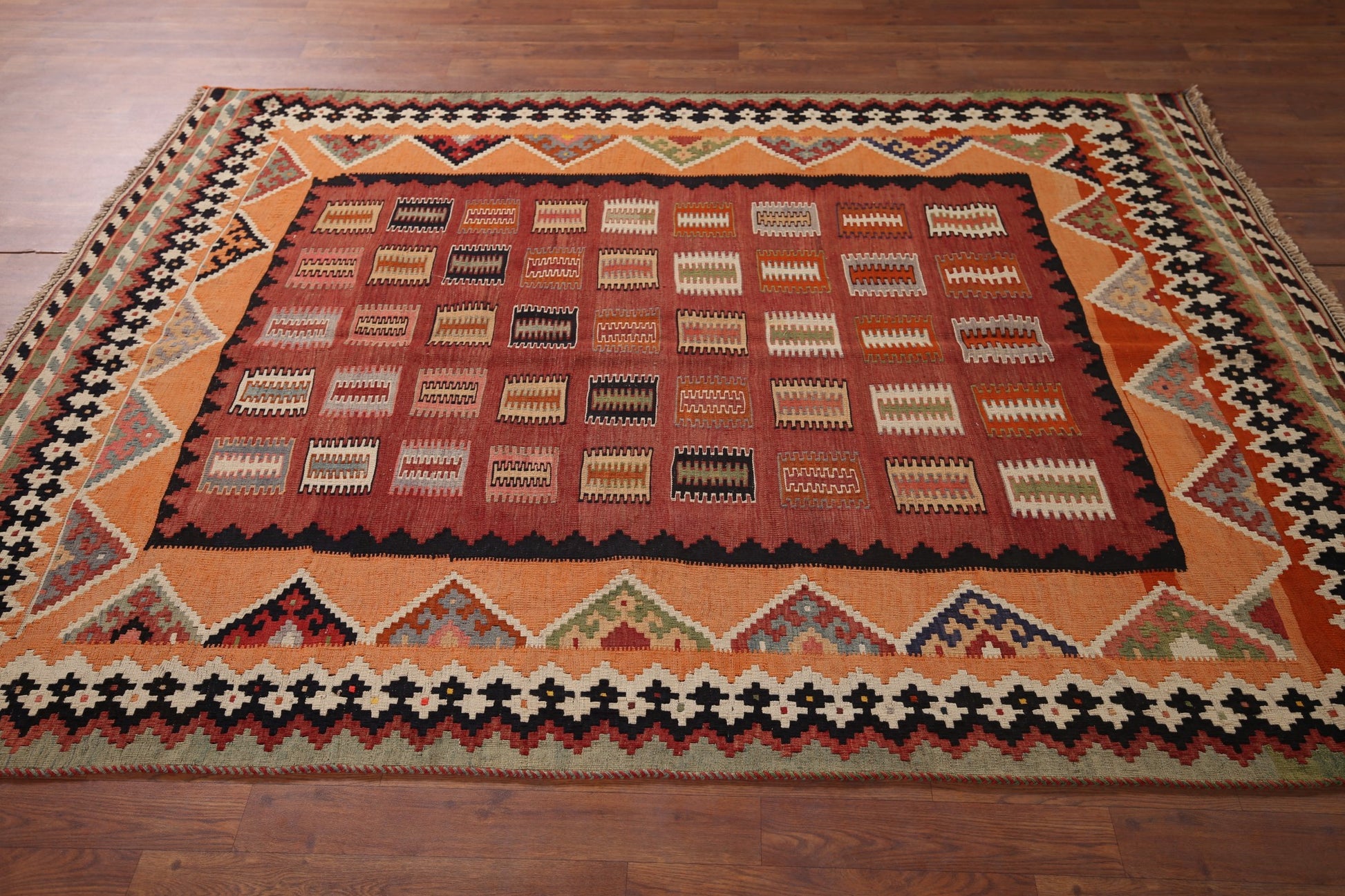 A Beautiful Genuine Persia ( Persia ) Kilim (Qashqai) rug is Hand Woven by skillful weavers in Persia ( Persia ) with 100% Wool Material. This rug is in Very Good (Abrash) condition. dimensions are 7' 2'' X 5' 4'' in foot and 218 X 163 in centimeter. the primary color is Oranges & Rust.