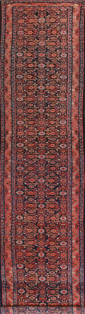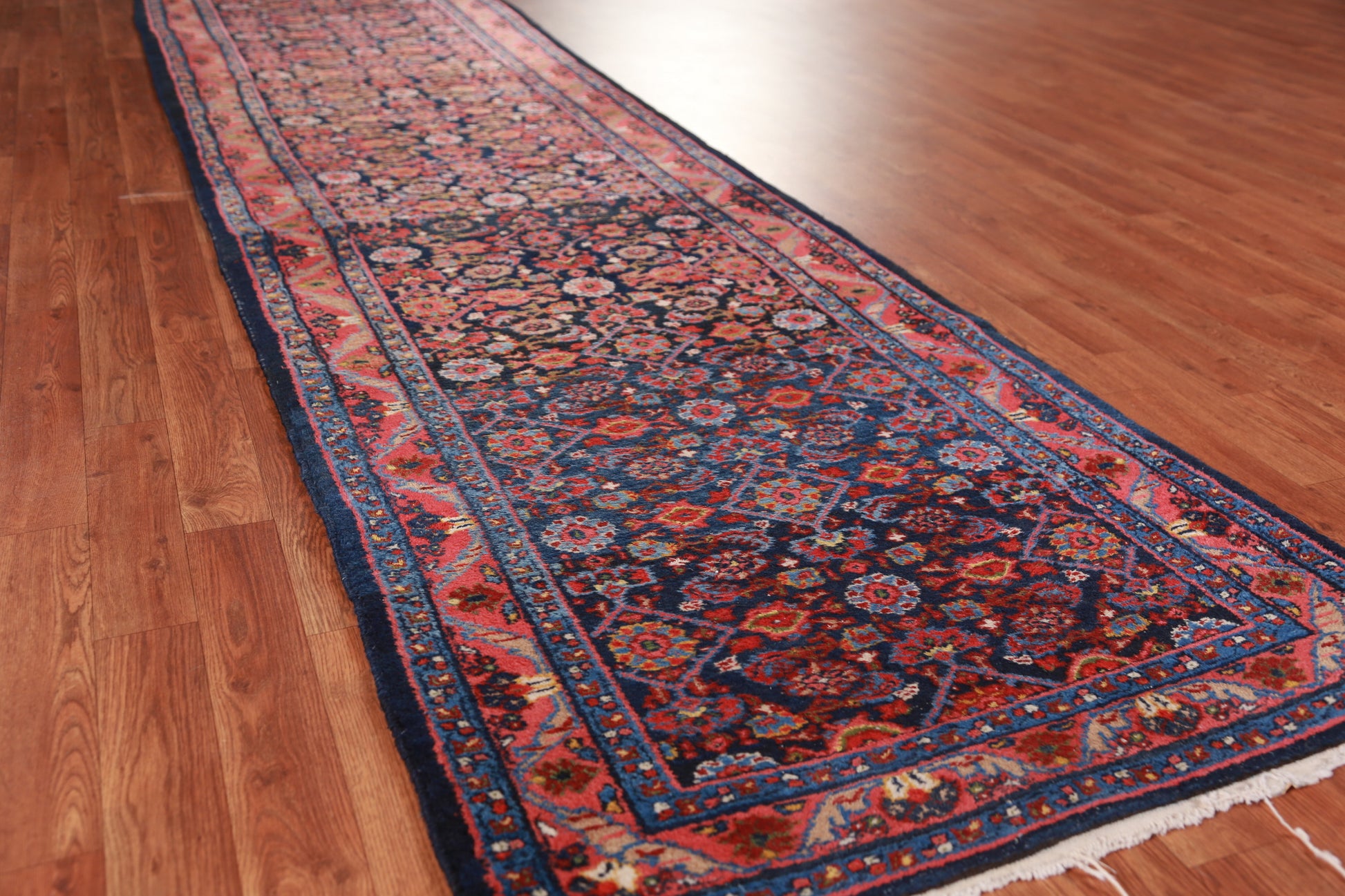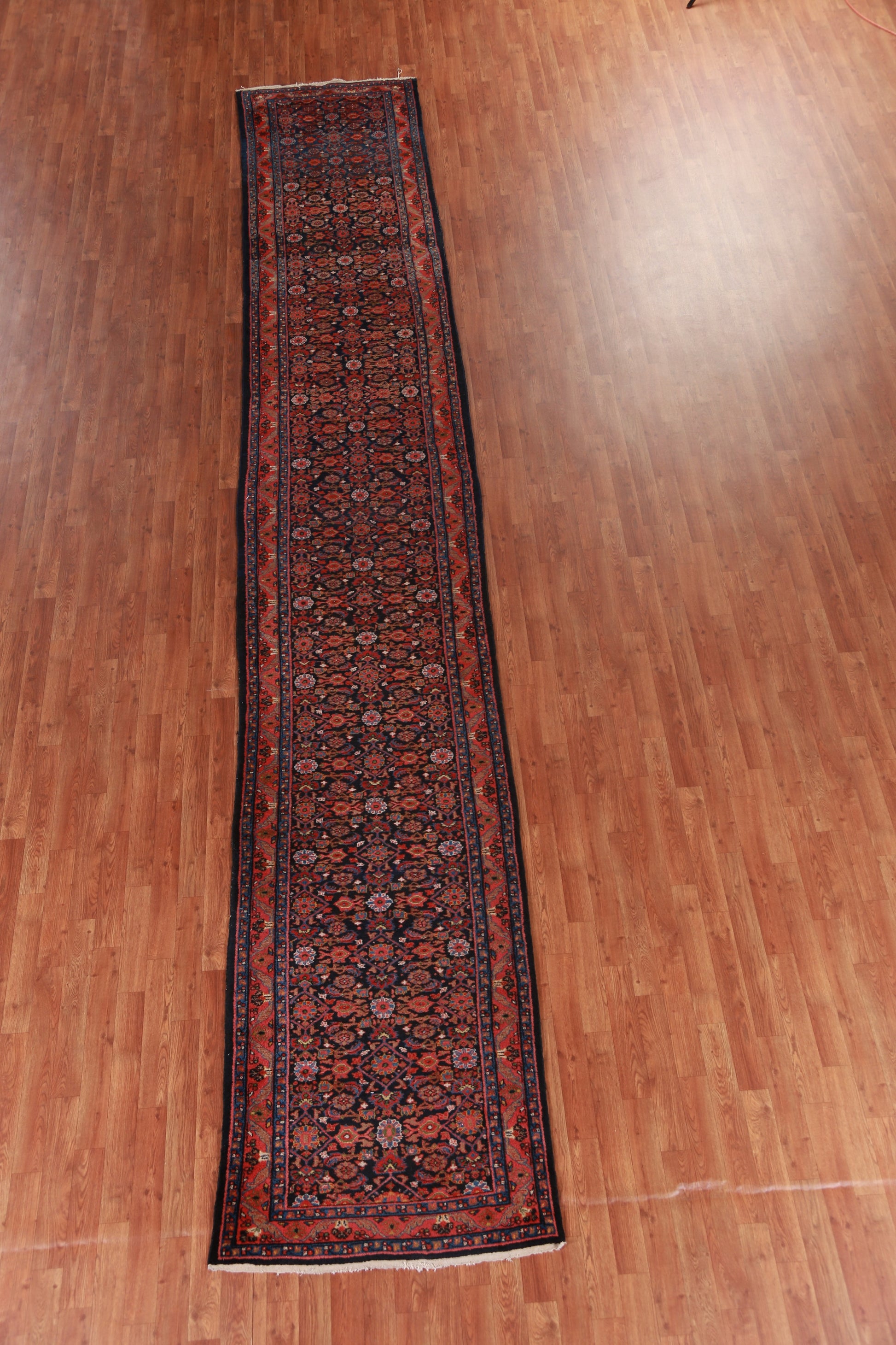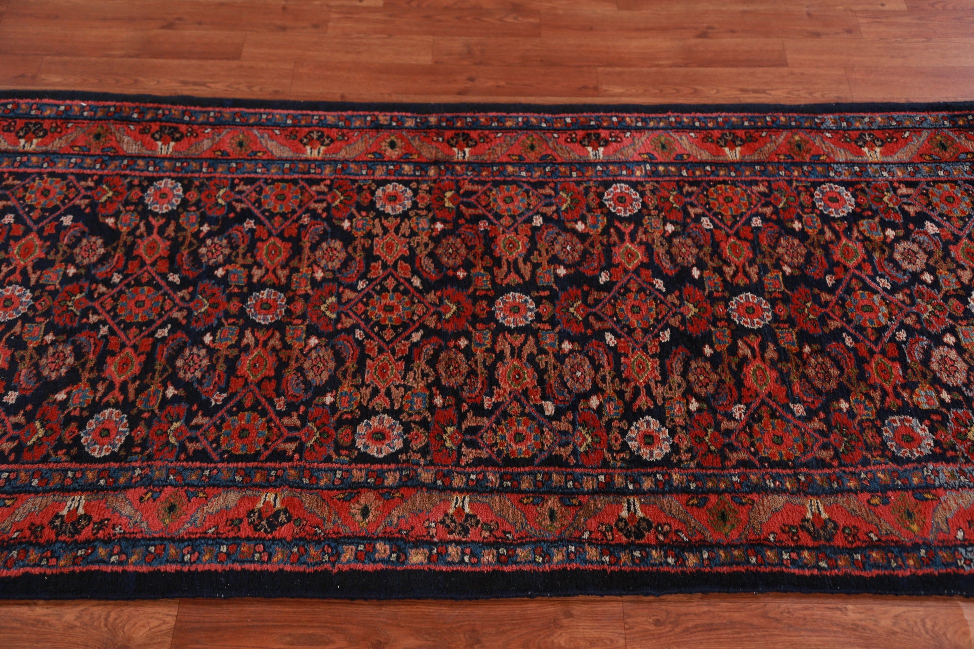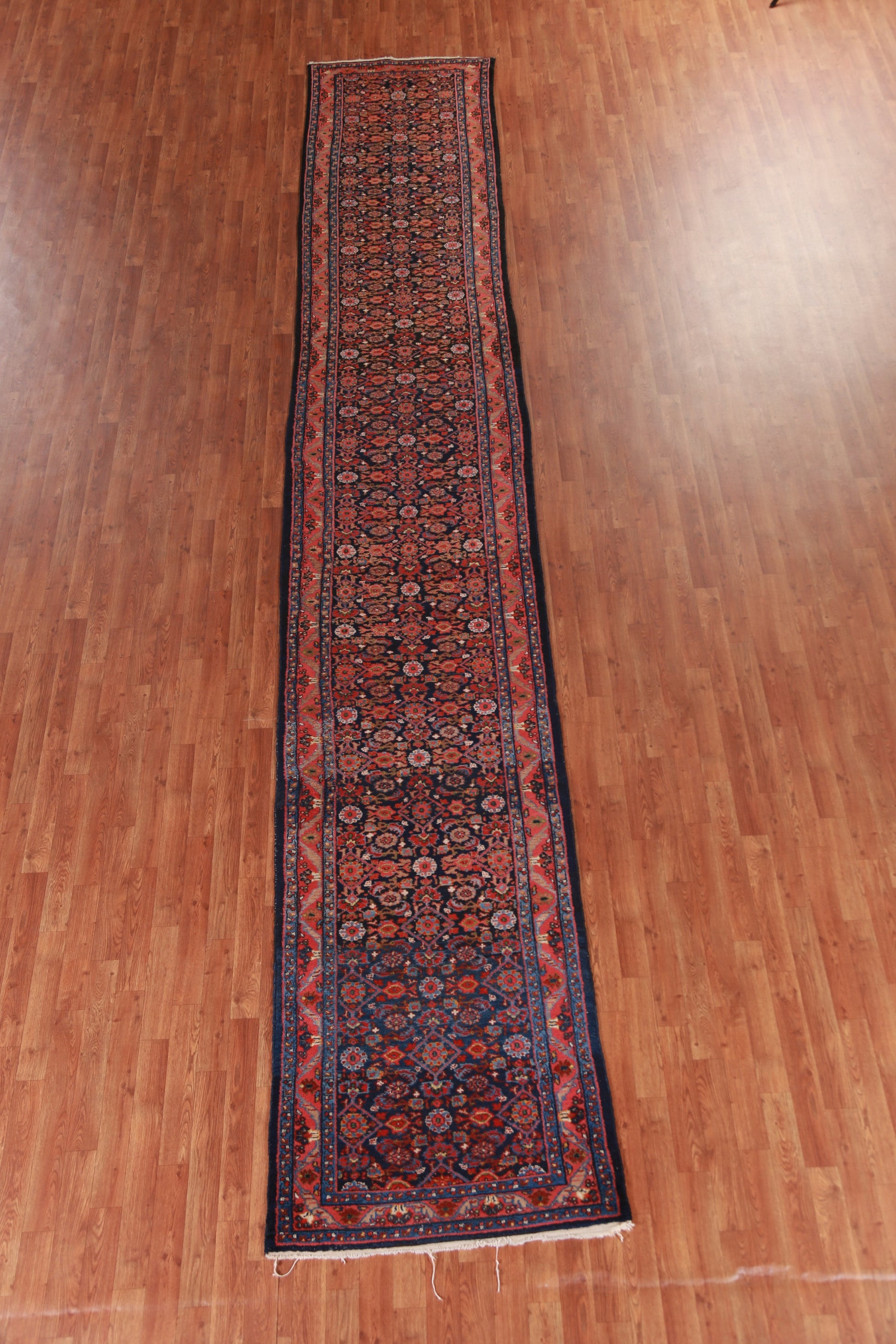 A Beautiful Genuine Persia ( Persia ) Mahal rug is Hand Knotted by skillful weavers in Persia ( Persia ) with 100% Wool Material. This rug is in Very Good (Abrash) condition. dimensions are 18' 9'' X 3' 1'' in foot and 572 X 94 in centimeter. the primary color is Navy Blue & Blues.