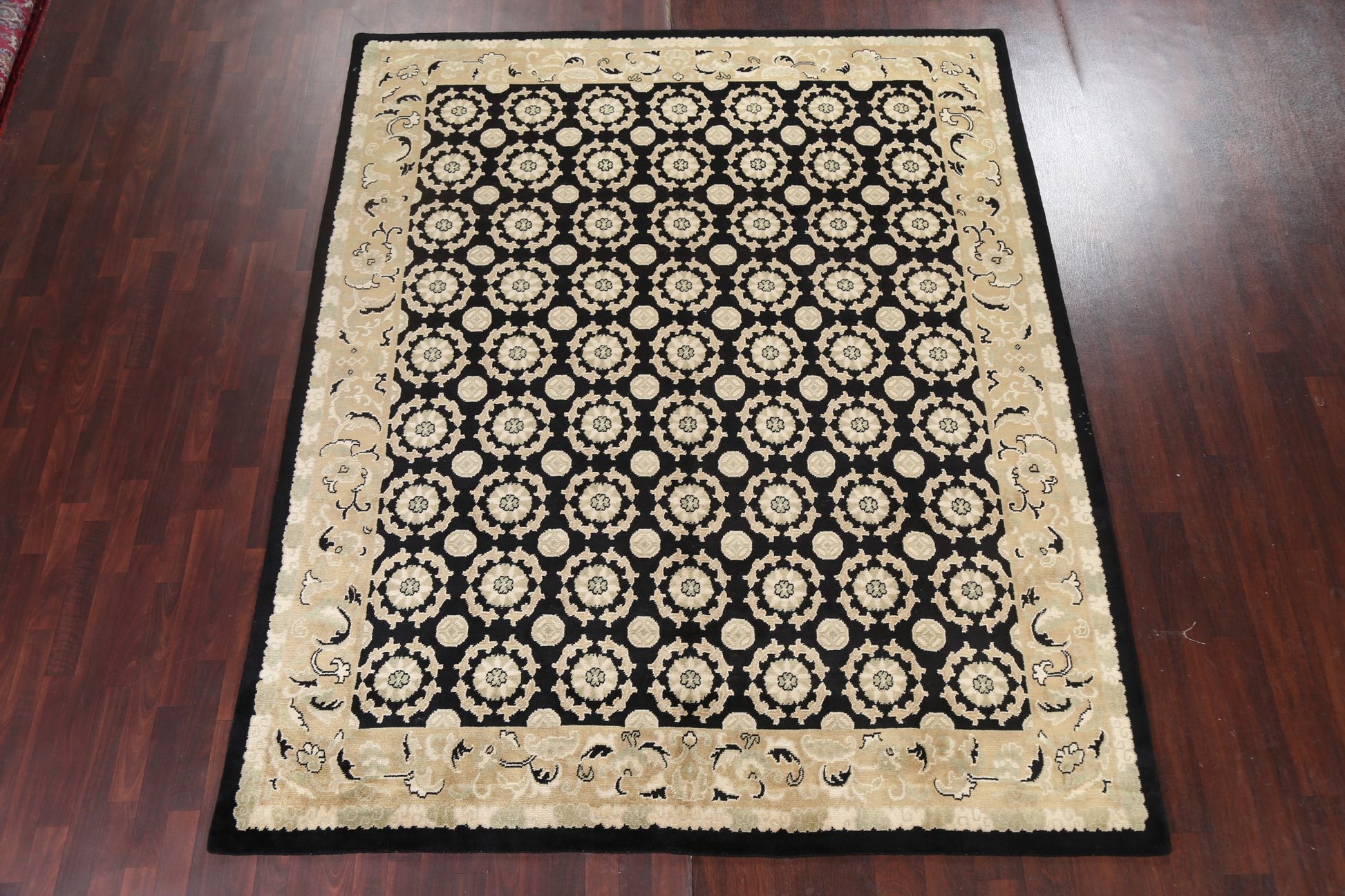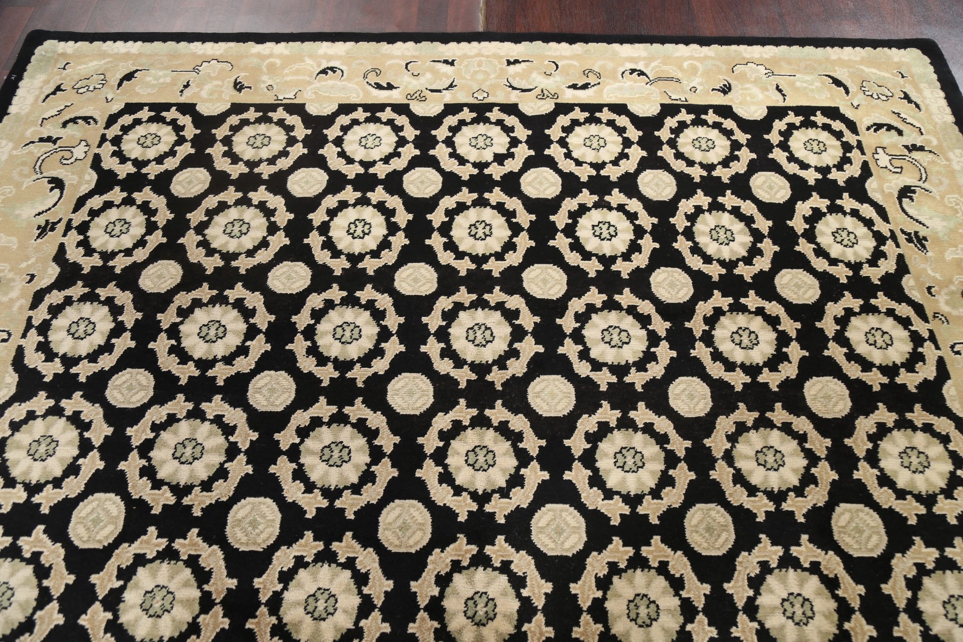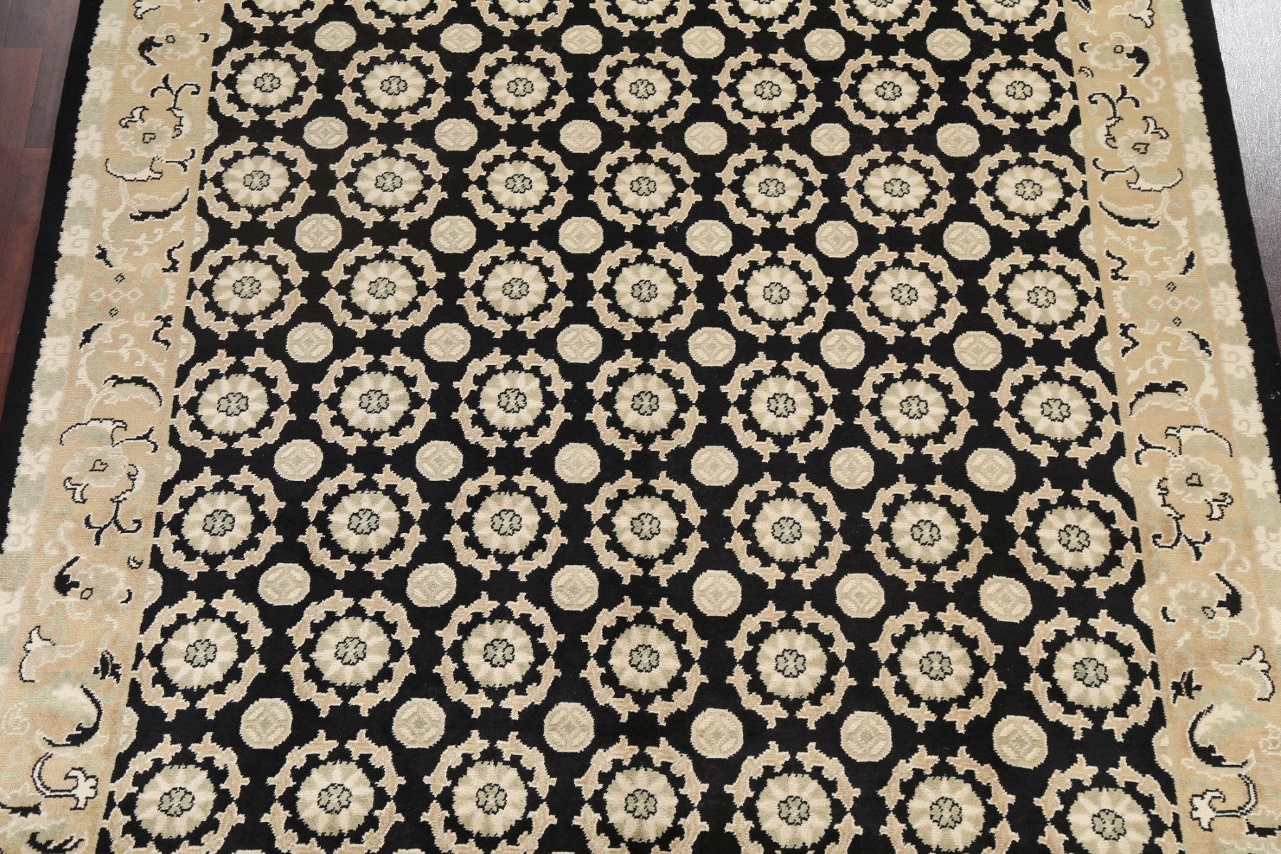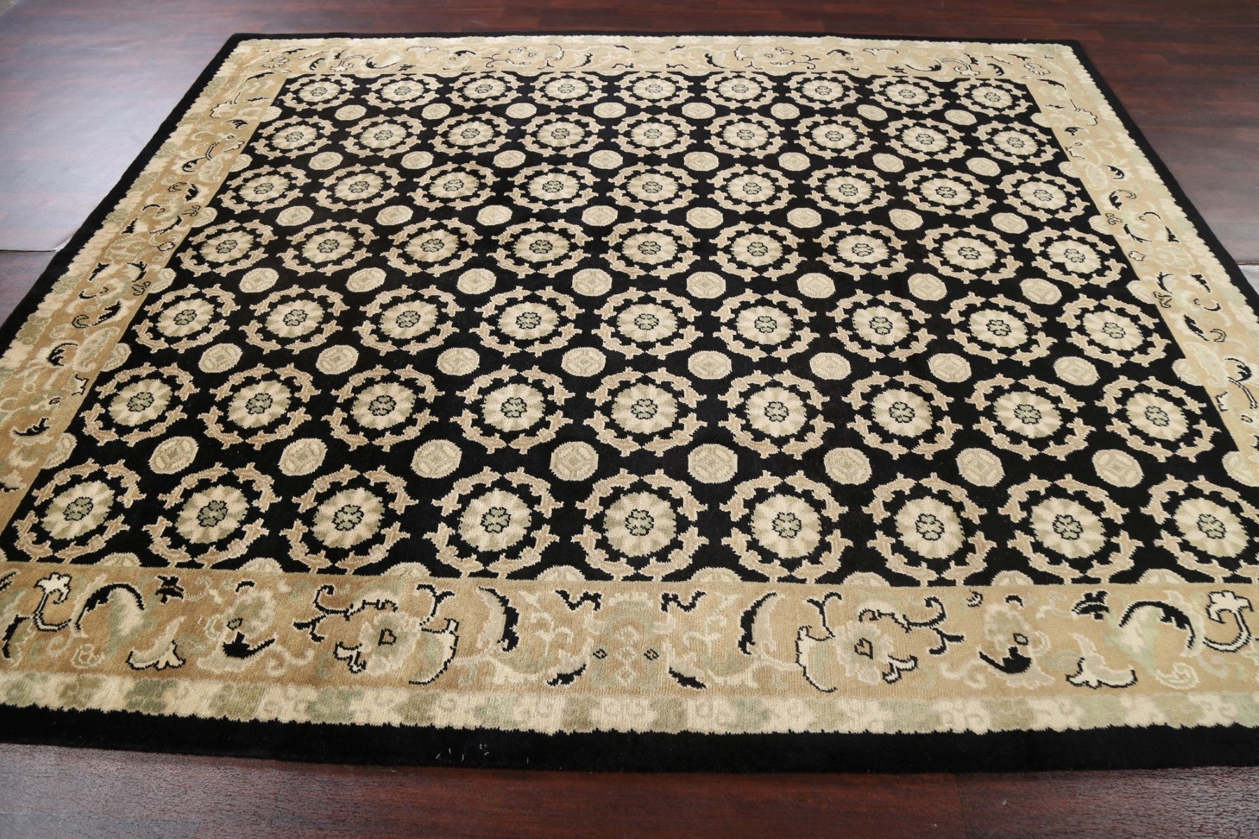 A Beautiful Genuine Nepal Nepalese rug is Hand Knotted by skillful weavers in Nepal with 100% Wool Material. This rug is in New, First Quality condition. dimensions are 9' 8'' X 8' 2'' in foot and 295 X 249 in centimeter. the primary color is Black.